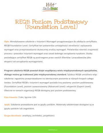 REQB Poziom Podstawowy (Foundation Level) Opis: Akredytowane szkolenie z Inżynierii Wymagań przygotowujące do zdobycia certyfikatu REQB Foundation Level. Certyfikat ten potwierdza umiejętności określania i opisywania wymagań oraz przeprowadzania skuteczniej analizy wymagań. Potwierdza również znajomość procesu i procedur inżynierii wymagań oraz zasad dobrego zarządzania ryzykiem. Osoby posiadające certyfikat REQB są postrzegane przez swoich klientów i pracodawców jako eksperci od zarządzania wymaganiami. Program szkolenia REQB powstał dzięki współpracy wielu międzynarodowych specjalistów, dlatego można go traktować jako międzynarodowy standard. Sylabus REQB umożliwia więc szkolenia i egzaminy przeprowadzane na identycznym poziomie w różnych krajach całego świata. Certyfikat REQB z inżynierii wymagań posiada trzy poziomy: poziom podstawowy (Foundation Level), poziom zaawansowany (Advanced Level) i ekspercki (Expert Level). Obecnie w ramach organizacji REQB dostępny jest poziom podstawowy. Czas trwania: 2 dni, łącznie 12h. Język: Szkolenie prowadzone jest w języku polskim. Materiały szkoleniowe dostępne są w języku polskim lub angielskim. Grupa docelowa: analitycy, architekci, projektanci. SkillsPACK.eu Program: 1. Wstęp do wymagań • Pojęcie wymagania. • Standardy oraz normy. 2. Standardy oraz normy. 3. Kontekst Inżynierii Wymagań • Inżynieria Wymagań w kontekście. • Procesy powiązane. 4. Proces Inżynierii Wymagań • Wprowadzenie do procesu Inżynierii Wymagań. • Ogólny proces Inżynierii Wymagań • Role i odpowiedzialności. 5. Zarządzanie wymaganiami • Wstęp do zarządzania wymaganiami. • Zarządzanie projektem i ryzykiem. • Śledzenie wymagań. • Zarządzanie konfiguracją i zarządzanie zmianą. • Zapewnienie jakości. 6. Opracowanie wymagań Wstęp do opracowywania wymagań. Identyfikacja wymagań. Analiza wymagań. • Modelowanie rozwiązania. • Specyfikacja wymagań. SkillsPACK.eu Egzamin: • Egzamin dostępny w języku polskim i angielskim. • Forma egzaminu: papierowy - test, 40 pytań. • Próg zdawalności: 65%. • Czas trwania: język ojczysty - 60 min., inny - 75 min. • Egzamin odbywa się ostatniego dnia szkolenia, ale nie jest obowiązkowy. Materiały do pobrania: Przed przystąpieniem do szkolenia polecamy zapoznać się z materiałami pomocniczymi: • Słowniki [2015-12-23] Słownik terminów stosowanych w inżynierii wymagań (v.1.3 PL) • Poziom podstawowy [2015-12-23] Sylabus (plan nauczania dla Poziomu Podstawowego) (v2.1 PL) [2015-12-23] Przykładowe pytania egzaminacyjne dla Poziomu Podstawowego SkillsPACK.eu Trener W branży IT ponad 10 lat. Posiada międzynarodowe doświadczenie w zakresie analizy biznesowej oraz inżynierii wymagań, zarządzania jakością i zarządzania projektami: pracowała dla wiodących organizacji finansowych w RPA, Holandii, Austrii, Słowacji, Włoszech i w Polsce. Podczas swojej kariery pełniła różne role, od testera, przez technical writera, po kierownika projektów R&D, co umożliwiło jej poznanie wielu aspektów realizacji projektów IT i nauczyło postrzegania podejmowanych tematów z różnych punktów widzenia. Karolina Zmitrowicz Praca w międzynarodowych, wielokulturowych zespołach projektowych wykształciła w Karolinie nie tylko umiejętności efektywnego planowania, koordynacji złożonych działań, ale i doskonałe umiejętności interpersonalne. Autorka wielu artykułów, książek z obszaru inżynierii wymagań oraz testowania: „Inżynieria wymagań w praktyce” (PWN 2014) „Analityk systemów” (PWN 2015) „Tester oprogramowania” (PWN 2015) „Jakość projektów informatycznych. Rozwój i testowanie oprogramowania” (Helion 2015) Posiada certyfikaty: REQB, IQBBA, IBUQ, ISTQB. Ponadto jest certyfikowany audytorem systemów zarządzania jakością zgodnych z ISO 9001. Czynnie wspiera prace Stowarzyszenia Jakości Systemów Informatycznych działając w grupach roboczych ISTQB i REQB. Bierze też udział w pracach nad rozwojem programu certyfikacji IQBBA. Wykłada przedmioty związane z testowaniem oprogramowania na Wyższej Szkole Bankowej w Gdańsku oraz prowadzi studia podyplomowe „Inżynieria wymagań w projektach informatycznych”. SkillsPACK.eu