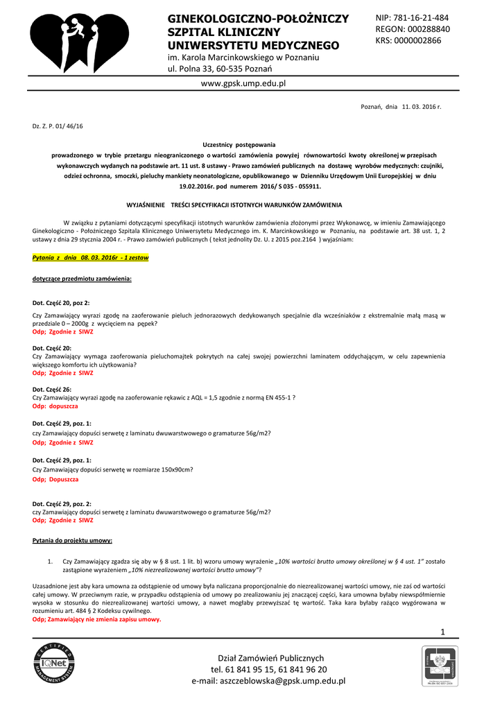 GINEKOLOGICZNO-POŁOŻNICZY SZPITAL KLINICZNY UNIWERSYTETU MEDYCZNEGO NIP: 781-16-21-484 REGON: 000288840 KRS: 0000002866 im. Karola Marcinkowskiego w Poznaniu ul. Polna 33, 60-535 Poznań www.gpsk.ump.edu.pl Poznań, dnia 11. 03. 2016 r. Dz. Z. P. 01/ 46/16 Uczestnicy postępowania prowadzonego w trybie przetargu nieograniczonego o wartości zamówienia powyżej równowartości kwoty określonej w przepisach wykonawczych wydanych na podstawie art. 11 ust. 8 ustawy - Prawo zamówień publicznych na dostawę wyrobów medycznych: czujniki, odzież ochronna, smoczki, pieluchy mankiety neonatologiczne, opublikowanego w Dzienniku Urzędowym Unii Europejskiej w dniu 19.02.2016r. pod numerem 2016/ S 035 - 055911. WYJAŚNIENIE TREŚCI SPECYFIKACJI ISTOTNYCH WARUNKÓW ZAMÓWIENIA W związku z pytaniami dotyczącymi specyfikacji istotnych warunków zamówienia złożonymi przez Wykonawcę, w imieniu Zamawiającego Ginekologiczno - Położniczego Szpitala Klinicznego Uniwersytetu Medycznego im. K. Marcinkowskiego w Poznaniu, na podstawie art. 38 ust. 1, 2 ustawy z dnia 29 stycznia 2004 r. - Prawo zamówień publicznych ( tekst jednolity Dz. U. z 2015 poz.2164 ) wyjaśniam: Pytania z dnia 08. 03. 2016r - 1 zestaw dotyczące przedmiotu zamówienia: Dot. Część 20, poz 2: Czy Zamawiający wyrazi zgodę na zaoferowanie pieluch jednorazowych dedykowanych specjalnie dla wcześniaków z ekstremalnie małą masą w przedziale 0 – 2000g z wycięciem na pępek? Odp; Zgodnie z SIWZ Dot. Część 20: Czy Zamawiający wymaga zaoferowania pieluchomajtek pokrytych na całej swojej powierzchni laminatem oddychającym, w celu zapewnienia większego komfortu ich użytkowania? Odp; Zgodnie z SIWZ Dot. Część 26: Czy Zamawiający wyrazi zgodę na zaoferowanie rękawic z AQL = 1,5 zgodnie z normą EN 455-1 ? Odp: dopuszcza Dot. Część 29, poz. 1: czy Zamawiający dopuści serwetę z laminatu dwuwarstwowego o gramaturze 56g/m2? Odp; Zgodnie z SIWZ Dot. Część 29, poz. 1: Czy Zamawiający dopuści serwetę w rozmiarze 150x90cm? Odp; Dopuszcza Dot. Część 29, poz. 2: czy Zamawiający dopuści serwetę z laminatu dwuwarstwowego o gramaturze 56g/m2? Odp; Zgodnie z SIWZ Pytania do projektu umowy: 1. Czy Zamawiający zgadza się aby w § 8 ust. 1 lit. b) wzoru umowy wyrażenie „10% wartości brutto umowy określonej w § 4 ust. 1” zostało zastąpione wyrażeniem „10% niezrealizowanej wartości brutto umowy”? Uzasadnione jest aby kara umowna za odstąpienie od umowy była naliczana proporcjonalnie do niezrealizowanej wartości umowy, nie zaś od wartości całej umowy. W przeciwnym razie, w przypadku odstąpienia od umowy po zrealizowaniu jej znaczącej części, kara umowna byłaby niewspółmiernie wysoka w stosunku do niezrealizowanej wartości umowy, a nawet mogłaby przewyższać tę wartość. Taka kara byłaby rażąco wygórowana w rozumieniu art. 484 § 2 Kodeksu cywilnego. Odp; Zamawiający nie zmienia zapisu umowy. 1 Dział Zamówień Publicznych tel. 61 841 95 15, 61 841 96 20 e-mail: [email protected] GINEKOLOGICZNO-POŁOŻNICZY SZPITAL KLINICZNY UNIWERSYTETU MEDYCZNEGO NIP: 781-16-21-484 REGON: 000288840 KRS: 0000002866 im. Karola Marcinkowskiego w Poznaniu ul. Polna 33, 60-535 Poznań www.gpsk.ump.edu.pl 2. Czy Zamawiający zgadza się aby w § 9 ust. 1 wzoru umowy zostało dodane zdanie o następującej (lub podobnej) treści: „Przed odstąpieniem od umowy na podstawie § 9 ust. 1 lit. b) Zamawiający pisemnie wezwie Wykonawcę do należytego wykonywania umowy.”? Zważywszy na doniosłe i nieodwracalne skutki prawne odstąpienia od umowy, celowe jest aby przed odstąpieniem od umowy przez Zamawiającego wykonawca został wezwany do należytego wykonywania umowy. Takie wezwanie najprawdopodobniej zmobilizuje wykonawcę do należytego wykonywania umowy i pozwoli uniknąć odstąpienia od umowy, a tym samym uniknąć skutków odstąpienia od umowy, które są niekorzystne dla obu stron. Udzielając odpowiedzi na powyższe pytania proszę wziąć pod uwagę bieżące orzecznictwo Krajowej Izby Odwoławczej dotyczące umów. Zgodnie z wyrokiem Krajowej Izby Odwoławczej z dnia 29 czerwca 2009 r. KIO/UZP 767/09, „mimo iż sytuacja Zamawiającego przy kształtowaniu treści umowy jest silniejsza, powinien on brać pod uwagę nie tylko swoje interesy, ale także interesy Wykonawcy i starać się ułożyć stosunek prawny tak, aby te interesy były jak najbardziej zrównoważone”. Podobne stanowisko Krajowa Izba Odwoławcza zajęła w wyroku z dnia 21 lutego 2008 r. KIO/UZP 97/08, w wyroku z dnia 27 grudnia 2011 r. KIO 2649/11, w wyroku z dnia 17 grudnia 2012 r. KIO 2631/12, KIO 2655/12 oraz w wielu innych orzeczeniach. Odp; Zamawiający nie zmienia zapisu umowy. Pytania z dnia 08. 03. 2016r - 2 zestaw 1. Czy Zamawiający wyrazi zgodę na zaoferowanie w ramach części nr 8 podkładów z parametrami wymienionymi przez Zamawiającego jako wartościami minimalnymi? Odp; Zgodnie z SIWZ 2. Czy Zamawiający wyrazi zgodę na zaoferowanie w ramach części nr 12 poz.1 pokrowców z włókniny o gramaturze min.35g/m2? Odp; Zgodnie z SIWZ 3. Czy Zamawiający wyrazi zgodę na zaoferowanie w ramach części nr 12 poz.2 furażerki wiązanej na troki? Odp; Zgodnie z SIWZ 4. Czy Zamawiający wyrazi zgodę na zaoferowanie w ramach części nr 12 poz.3 fartucha z rękawami zakończonymi mankietami? Odp; Zamawiajacy dopuszcza. 5. Czy Zamawiający wyrazi zgodę na zaoferowanie w ramach części nr 12 poz.3 fartucha z włókniny o gramaturze min.25g/m2? Odp; Zgodnie z SIWZ 6. Czy Zamawiający wyrazi zgodę na zaoferowanie w ramach części nr 12 poz.4 fartucha o wymiarowaniu 80x140cm? Odp; Zamawiajacy dopuszcza. 7. Czy Zamawiający wyrazi zgodę na zaoferowanie w ramach części nr 12 poz.6 czepka z włókniny wiskozowej pochłaniającej pot, w kolorze białozielonym? Odp; Zgodnie z SIWZ 8. Czy Zamawiający wyrazi zgodę na zaoferowanie w ramach części nr 12 poz.6 czepka wiązanego na troki? Odp; Zgodnie z SI