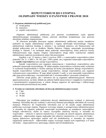 REPETYTORIUM DO I STOPNIA OLIMPIADY WIEDZY O PAŃSTWIE I PRAWIE 2010 1. Organem administracji publicznej jest: a) urząd gminy b) starostwo c) sejmik województwa Organem administracji publicznej jest prawnie wyodrębniona część aparatu administracyjnego posiadająca własne, prawem określone kompetencje oraz prawem określone struktury organizacyjne. W obecnym porządku prawnym organy administracji publicznej można zasadniczo podzielić na organy administracji rządowej i organy samorządu terytorialnego. Organy administracji rządowej działają w imieniu i na rachunek państwa, zaś finansowanie ich działań pokrywane jest ze środków Skarbu Państwa. Organy samorządu terytorialnego działają w imieniu i na rachunek danej jednostki samorządowej, która pokrywa koszty funkcjonowania tego organu. Organy samorządowe mogą także wykonywać zadania administracji rządowej na podstawie ustaw lub porozumień. Zgodnie z art. 15 ustawy z dnia 5 czerwca 1998 r. o samorządzie województwa (tekst jednolity: Dz. U. z 2001 r. Nr 142, poz. 1590 z późń. zm.) organami samorządu województwa są: sejmik województwa oraz zarząd województwa. Sejmik województwa jest organem stanowiącym i kontrolnym województwa jako jednostki samorządu terytorialnego. W skład sejmiku województwa wchodzą radni wybierani w wyborach bezpośrednich w liczbie zależnej od liczby mieszkańców danego województwa. Sejmik województwa wybiera zarząd województwa. Zarząd województwa jest organem wykonawczym województwa. W jego skład wchodzi 5 osób, w tym marszałek województwa jako jego przewodniczący, wicemarszałek lub 2 wicemarszałków i pozostali członkowie. Zarówno urząd gminy, jak i starostwo nie są organami administracyjnymi. Stanowią aparat pomocniczy, na który składa się substrat ludzki (pracownicy) i majątkowy (ruchomości i nieruchomości) zorganizowany w całość służącą organowi do sprawnego i efektywnego wykonywania powierzonych mu zadań. 2. Termin na wniesienie odwołania od decyzji administracyjnej wynosi: a) 7 dni b) 14 dni c) 30 dni Odwołanie jest środkiem zaskarżenia decyzji administracyjnej wydanej w pierwszej instancji. Od każdej decyzji wydanej w pierwszej instancji przysługuje odwołanie do wyższej instancji. Właściwy do rozpatrzenia odwołania jest co do zasady organ administracji publicznej wyższego stopnia. Organem wyższego stopnia w postępowaniu administracyjnym w stosunku do organów jednostek samorządu terytorialnego są zasadniczo samorządowe kolegia odwoławcze, chyba że ustawy szczególne stanowią inaczej; w stosunku do wojewodów – właściwi w sprawie ministrowie; w stosunku do innych organów administracji publicznej – odpowiednie organy nadrzędne lub właściwi ministrowie, a w razie ich braku – organy państwowe sprawujące nadzór nad ich działalnością; w stosunku do organów organizacji społecznych – odpowiednie organy wyższego stopnia tych organizacji, a w razie ich braku – organ państwowy sprawujący nadzór nad ich działalnością. 1 Odwołanie wnosi się w terminie 14 dni od dnia doręczenia decyzji stronie, a gdy decyzja została ogłoszona ustnie – w terminie 14 dni od dnia jej ogłoszenia stronie. Wniesienie odwołania w terminie wstrzymuje wykonanie decyzji, chyba że decyzji został nadany rygor natychmiastowej wykonalności, bądź decyzja podlega natychmiastowemu wykonaniu z mocy ustawy. W wyniku wniesienia odwołania w terminie, organ wyższego stopnia jest obowiązany przeprowadzić postępowanie odwoławcze. Organ odwoławczy wydaje decyzję, w której: 1. utrzymuje w mocy zaskarżoną decyzję albo 2. uchyla zaskarżoną decyzję w całości bądź w części i w tym zakresie orzeka co do istoty sprawy lub uchylając tę decyzję – umarza postępowanie pierwszej instancji albo 3. umarza postępowanie odwoławcze. 3. Termin na wniesienie skargi na decyzją administracyjną do sądu administracyjnego wynosi: a) 7 dni b) 14 dni c) 30 dni Postępowanie przeprowadzone w drugiej instancji kończy decyzja będącą rozstrzygnięciem ostatecznym w toku postępowania administracyjnego. Decyzja ta jest jednak zaskarżalna do wojewódzkiego sądu administracyjnego. Strona niezadowolona z rozstrzygnięcia podjętego przez organ wyższego stopnia może je zaskarżyć za pośrednictwem tego organu w terminie 30 dni od daty otrzymania tego rozstrzygnięcia. Skarga taka uruchamia postępowanie sądowoadministracyjne. Uprawnionym do wniesienia skargi jest każdy, kto ma w tym interes prawny, prokurator, Rzecznik Praw Obywatelskich oraz organizacja społeczna w zakresie jej statutowej działalności, w sprawach dotyczących interesów prawnych innych osób, jeżeli brała udział w postępowaniu administracyjnym. Skargę można wnieść dopiero po wyczerpaniu środków zaskarżenia, jeżeli służyły one skarżącemu w postępowaniu przed organem właściwym w sprawie, chyba że skargę wnosi prokurator lub Rzecznik Praw Obywatelskich. Przez wyczerpanie środków zaskarżenia należy rozumieć sytuację, w której stronie nie przysługuje żaden inny środek zaskarżenia. Skarga powinna czynić zadość wymaganiom pisma w postępowaniu sądowym, a ponadto zawierać: 1. wskazanie zaskarżonej decyzji, postanowienia, innego aktu lub czynności; 2. oznaczenie organu, którego działania lub bezczynności skarga dotyczy; 3. określenie naruszenia prawa lub interesu prawnego. 4. Postępowanie administracyjne w Polsce jest: a) jednoinstancyjne b) dwuinstancyjne c) trzyinstancyjne W ramach postępowania ogólnego należy wyróżnić postępowanie zwyczajne oraz postępowania nadzwyczajne. Postępowanie zwyczajne jest prowadzone w celu rozstrzygnięcia sprawy indywidualnej i kończy się wydaniem decyzji administracyjnej. Jest to postępowanie dwuinstancyjne. Oznacza, że decyzja wydana w pierwszej instancji może być zaskarżona przez uprawniony podmiot w ustawowym terminie. Wówczas sprawa trafia pod osąd organu