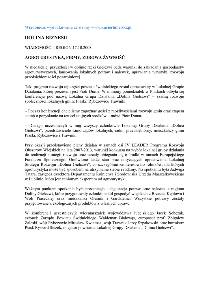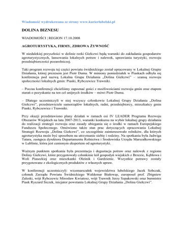 Wiadomość wydrukowana ze strony www.kurierlubelski.pl DOLINA BIZNESU WIADOMOŚCI | REGION 17.10.2008 AGROTURYSTYKA, FIRMY, ZDROWA śYWNOŚĆ W niedalekiej przyszłości w dolinie rzeki Giełczwi będą warunki do zakładania gospodarstw agroturystycznych, lansowania lokalnych potraw i nalewek, uprawiania turystyki, rozwoju przedsiębiorczości pozarolniczej. Taki program rozwoju tej części powiatu świdnickiego został opracowany w Lokalnej Grupie Działania, której prezesem jest Piotr Duma. W miniony poniedziałek w Piaskach odbyła się konferencja pod nazwą Lokalna Grupa Działania „Dolina Giełczwi” – szansą rozwoju społeczności lokalnych gmin: Piaski, Rybczewice Trawniki. – Poczas konferencji chcieliśmy zapoznać gości z moŜliwościami rozwoju gmin oraz etapem starań o pozyskanie na ten cel unijnych środków – mówi Piotr Duma. – Dlatego uczestniczyli w niej wszyscy członkowie Lokalnej Grupy Działania „Dolina Giełczwi”, przedstawiciele samorządów lokalnych, radni, przedsiębiorcy, mieszkańcy gmin Piaski, Rybczewice i Trawniki. Przy okazji przedstawiono plany działań w ramach osi IV LEADER Programu Rozwoju Obszarów Wiejskich na lata 2007-2013, warunki konkursu na wybór lokalnej grupy działania do realizacji strategii rozwoju oraz zasady ubiegania się o środki w ramach Europejskiego Funduszu Społecznego. Omówiono takŜe stan prac dotyczących opracowania Lokalnej Strategii Rozwoju „Dolina Giełczwi”, co szczególnie zainteresowało rolników, dla których agroturystyka moŜe być sposobem na utrzymanie siebie i rodziny. Na spotkaniu była Jadwiga Tatara, zastępca dyrektora Departamentu Rolnictwa i Środowiska Urzędu Marszałkowskiego w Lublinie, która jest cenionym ekspertem od agroturystyki. WaŜnym punktem spotkania była prezentacja i degustacja potraw oraz nalewek z regionu Doliny Giełczwi, które przygotowały członkinie kół gospodyń wiejskich z Brzezic, Kębłowa i Woli Piaseckiej oraz mieszkanki Oleśnik i Gardzienic. Wszystkie potrawy zostały przygotowane z ekologicznych produktów z własnych upraw. W konferencji uczestniczyli: wicemarszałek województwa lubelskiego Jacek Sobczak, członek Zarządu Powiatu Świdnickiego Waldemar Białowąs, europoseł prof. Zbigniew Zaleski, wójt Rybczewic Mirosław Kwiatosz, wójt Trawnik Jerzy Szpakowski oraz burmistrz Piask Ryszard Siczek, inicjator powstania Lokalnej Grupy Działania „Dolina Giełczwi”.