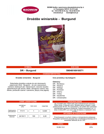 Drożdże winiarskie - Burgund SYMBOL KOD EAN DR – Burgund 5904816918571 CHARAKTERYSTYKA Drożdże winiarskie - Burgund Inne produkty z tej kategorii: Szlachetne drożdże w płynie do win domowychpojemność 20ml. Burgund – do win czerwonych, zarówno stołowych jak i deserowych; owoców wysoko garbnikowych jak aronia, śliwki, winogrono czarne, bez, wiśnie, porzeczki czarne i czerwone, jeżyny oraz jagody. Odmiany: DR – Bordeaux DR – Madera DR – Malaga DR – Portwein DR – Sherry DR – Tokay DR – Sauternes DR – Uniwersalne DANE LOGISTYCZNE Opakowanie jednostkowe PRZEZNACZENIE szer/gł/wys [cm] Ilość sztuk waga [kg] 7/1/11 1 0,020 Do 1l butelki wlać 150ml soku (lub rozdrobnionych owoców), 300ml wody, 2 łyżeczki cukru. Butelkę zakryć czopem z waty, pasteryzować 30 min. Po wystudzeniu, do butelki wlać zawartość wstrząśniętej uprzednio torebeczki. Całość pozostawić na 1-2 doby w temp.26ºC, po czym wlać do balonu z nastawem wina (5-25L). INFORMACJE DODATKOWE Opakowanie zbiorcze 24/16/11 100 2,20 Przechowywać w suchym miejscu w temperaturze pokojowej. Wszystkie wymienione powyżej rasy umożliwiają produkcję win o zawartości alkoholu do ok 14%. PKWiU VAT 10.89.13.0 23%