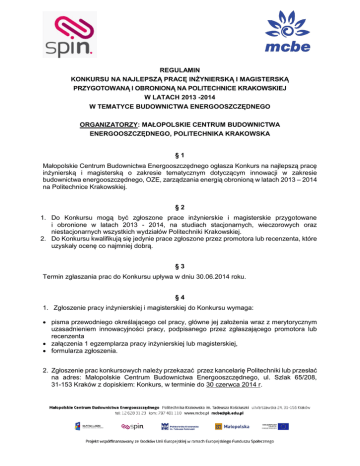 REGULAMIN KONKURSU NA NAJLEPSZĄ PRACĘ INŻYNIERSKĄ I MAGISTERSKĄ PRZYGOTOWANĄ I OBRONIONĄ NA POLITECHNICE KRAKOWSKIEJ W LATACH 2013 -2014 W TEMATYCE BUDOWNICTWA ENERGOOSZCZĘDNEGO ORGANIZATORZY: MAŁOPOLSKIE CENTRUM BUDOWNICTWA ENERGOOSZCZĘDNEGO, POLITECHNIKA KRAKOWSKA §1 Małopolskie Centrum Budownictwa Energooszczędnego ogłasza Konkurs na najlepszą pracę inżynierską i magisterską o zakresie tematycznym dotyczącym innowacji w zakresie budownictwa energooszczędnego, OZE, zarządzania energią obronioną w latach 2013 – 2014 na Politechnice Krakowskiej. §2 1. Do Konkursu mogą być zgłoszone prace inżynierskie i magisterskie przygotowane i obronione w latach 2013 - 2014, na studiach stacjonarnych, wieczorowych oraz niestacjonarnych wszystkich wydziałów Politechniki Krakowskiej. 2. Do Konkursu kwalifikują się jedynie prace zgłoszone przez promotora lub recenzenta, które uzyskały ocenę co najmniej dobrą. §3 Termin zgłaszania prac do Konkursu upływa w dniu 30.06.2014 roku. §4 1. Zgłoszenie pracy inżynierskiej i magisterskiej do Konkursu wymaga: pisma przewodniego określającego cel pracy, główne jej założenia wraz z merytorycznym uzasadnieniem innowacyjności pracy, podpisanego przez zgłaszającego promotora lub recenzenta załączenia 1 egzemplarza pracy inżynierskiej lub magisterskiej, formularza zgłoszenia. 2. Zgłoszenie prac konkursowych należy przekazać przez kancelarię Politechniki lub przesłać na adres: Małopolskie Centrum Budownictwa Energooszczędnego, ul. Szlak 65/208, 31-153 Kraków z dopiskiem: Konkurs, w terminie do 30 czerwca 2014 r. §5 Przy ocenie prac zgłoszonych do Konkursu będą brane pod uwagę: oryginalność, innowacyjność, poprawność merytoryczna, przydatność praktyczna, znajomość literatury przedmiotu, poprawność i aktualność doboru i wykorzystania źródeł. §6 1. Sponsorem nagród jest Małopolskie Centrum Budownictwa Energooszczędnego w ramach projektu PO KL Priorytet VIII: Regionalne kadry gospodarki, Działanie 8.2Transfer wiedzy 8.2.1: Wsparcie dla współpracy sfery nauki i przedsiębiorstw Tytuł: „SPIN – Model transferu innowacji w Małopolsce”. I nagroda II nagroda III nagroda Praca inżynierska 2000 zł 1500 zł 1000 zł Praca magisterska 2500 zł 2000 zł 1500 zł 2. Kapituła Konkursu składająca się z Rady Centrum dokonuje oceny prac i podziału nagród. 3. Wypłacone nagrody będą pomniejszone o podatek dochodowy od osób fizycznych. §7 1. Konkurs zostanie rozstrzygnięty w terminie do dnia 01.09.2014 roku. 2. Ogłoszenie wyników nastąpi nie później niż 30 dni po rozstrzygnięciu Konkursu. 3. Autorzy i promotorzy nadesłanych prac oraz jednostki naukowo-dydaktyczna, w której została wykonana praca, otrzymają pisemne zawiadomienie o wynikach Konkursu i terminie uroczystości wręczenia nagród. 4. Wyniki Konkursu zostaną podane do publicznej wiadomości w formie ogłoszeń na tablicach informacyjnych Uczelni oraz na stronach internetowych MCBE. ZGŁOSZENIE Zgłaszam pracę pt.: …............................................................................................................................................... .................................................................................................................................................... .................................................................................................................................................... .................................................................................................................................................... do konkursu na najlepszą pracę magisterską / inżynierską z dziedziny innowacji w zakresie budownictwa energooszczędnego, OZE, zarządzania energią w roku 2013 - 2014. Wydział i Instytut na którym obroniono pracę: .......................................................................... .................................................................................................................................................... Data obrony: .............................................................................................................................. Nazwisko i imię promotora pracy: ............................................................................................... .................................................................................................................................................... Nazwisko i imię autora pracy: ..................................................................................................... .................................................................................................................................................... Adres korespondencyjny zgłaszającego: ................................................................................. ................................................................................................................................................... E-mail zgłaszającego: ................................................................................................................ ……………………….. Podpis zgłaszającego Politechnika Krakowska Wydział………………………………….. Instytut…………………………………… Imię i nazwisko promotora / recenzenta…………………………….. PISMO PRZEWODNIE Tytuł pracy …............................................................................................................................................... .................................................................................................................................................... Cel pracy .................................................................................................................................................... ..............................................................