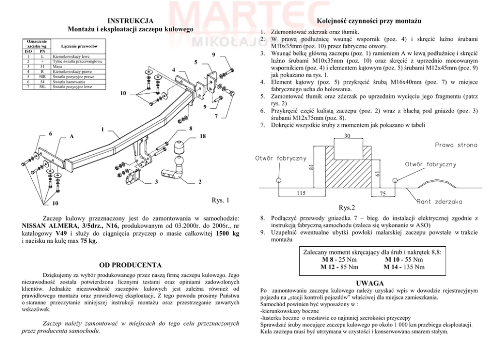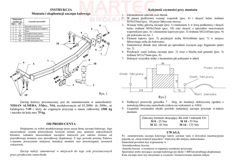 INSTRUKCJA MontaŜu i eksploatacji zaczepu kulowego Oznaczenie zacisku wg ISO PN 1 L 2 + 3 31 4 R 5 58R 6 54 7 58L Kolejność czynności przy montaŜu Łączenie przewodów 9 Kierunkowskazy lewe Tylne światła przeciwmgłowe Masa Kierunkowskazy prawe Światła pozycyjne prawe Światła hamowania Światła pozycyjne lewe 5 4 10 9 7 8 1 6 A 1. Zdemontować zderzak oraz tłumik. 2. W prawą podłuŜnicę wsunąć wspornik (poz. 4) i skręcić luźno śrubami M10x35mm (poz. 10) przez fabryczne otwory. 3. Wsunąć belkę główną zaczepu (poz. 1) ramieniem A w lewą podłuŜnicę i skręcić luźno śrubami M10x35mm (poz. 10) oraz skręcić z uprzednio mocowanym wspornikiem (poz. 4) i elementem kątowym (poz. 5) śrubami M12x45mm (poz. 9) jak pokazano na rys. 1. 4. Element kątowy (poz. 5) przykręcić śrubą M16x40mm (poz. 7) w miejsce fabrycznego ucha do holowania. 5. Zamontować tłumik oraz zderzak po uprzednim wycięciu jego fragmentu (patrz rys. 2) 6. Przykręcić część kulistą zaczepu (poz. 2) wraz z blachą pod gniazdo (poz. 3) śrubami M12x75mm (poz. 8). 7. Dokręcić wszystkie śruby z momentem jak pokazano w tabeli 30 35 18 3 2 115 115 75 65 Rys. 1 10 Rys.2 Zaczep kulowy przeznaczony jest do zamontowania w samochodzie: NISSAN ALMERA, 3/5drz., N16, produkowanym od 03.2000r. do 2006r., nr katalogowy V49 i słuŜy do ciągnięcia przyczep o masie całkowitej 1500 kg i nacisku na kulę max 75 kg. OD PRODUCENTA Dziękujemy za wybór produkowanego przez naszą firmę zaczepu kulowego. Jego niezawodność została potwierdzona licznymi testami oraz opiniami zadowolonych klientów. JednakŜe niezawodność zaczepów kulowych jest zaleŜna równieŜ od prawidłowego montaŜu oraz prawidłowej eksploatacji. Z tego powodu prosimy Państwa o staranne przeczytanie niniejszej instrukcji montaŜu oraz przestrzeganie zawartych wskazówek. Zaczep naleŜy zamontować w miejscach do tego celu przeznaczonych przez producenta samochodu. 8. Podłączyć przewody gniazdka 7 – bieg. do instalacji elektrycznej zgodnie z instrukcją fabryczną samochodu (zaleca się wykonanie w ASO) 9. Uzupełnić ewentualne ubytki powłoki malarskiej zaczepu powstałe w trakcie montaŜu Zalecany moment skręcający dla śrub i nakrętek 8,8: M 8 - 25 Nm M 10 - 55 Nm M 12 - 85 Nm M 14 - 135 Nm UWAGA Po zamontowaniu zaczepu kulowego naleŜy uzyskać wpis w dowodzie rejestracyjnym pojazdu na „stacji kontroli pojazdów” właściwej dla miejsca zamieszkania. Samochód powinien być wyposaŜony w : -kierunkowskazy boczne -lusterka boczne o rozstawie co najmniej szerokości przyczepy Sprawdzać śruby mocujące zaczepu kulowego po około 1 000 km przebiegu eksploatacji. Kula zaczepu musi być utrzymana w czystości i konserwowana smarem stałym. PPUH AUTO-HAK S.J. WyposaŜenie zaczepu: Produkcja Zaczepów Kulowych Henryk & Zbigniew Nejman 76-200 SŁUPSK ul. Słoneczna 16K tel/fax (059) 8-414-414; 8-414-413 E-mail: [email protected] www. autohak.com.pl Zaczep kulowy bez wyposaŜenia elektrycznego V49 Klasa: A50-X Nr kat. Przeznaczony do zamontowania w samochodzie: Producent: NISSAN Model: ALMERA Typ: 3/5drz., N16 produkowanym od 03.2000r. do 2006r. Dane techniczne: Wartość siły D : 8,0 kN maksymalna masa przyczepy: 1500 kg maksymalny nacisk na kulę: 75 kg Numer homologacji zgodnie z wytycznymi regulaminu EKG/ONZ 55.01: E20-55R-01 1244 KARTA GWARANCYJNA Producent udziela gwarancji niniejszą kartą gwarancyjną na okres 24 miesięcy licząc od dnia zakupu zaczepu kulowego do samochodu: NISSAN ALMERA N16 3/5 drz. produkowanego od 03.2000r. do 2006r. Data produkcji .............................. Data zakupu............................................. Zakres gwarancji obejmuje wyłącznie wady jakościowe wynikające z winy producenta. Gwarancja nie obejmuje natomiast uszkodzeń zawinionych przez nabywcę, wynikających z niewłaściwego montaŜu, uŜytkowania lub konserwacji, uszkodzeń mechanicznych, normalnego zuŜycia podczas eksploatacji itp. Gwarancja udzielona na zakupiony towar nie wyłącza, nie ogranicza ani nie zawiesza uprawnień kupującego wynikających z niezgodności towaru z umową. Reklamacje naleŜy zgłaszać w punkcie sprzedaŜy, składając jednocześnie kartę gwarancyjną. Usunięcie "wady" następuje po stwierdzeniu przez punkt sprzedaŜy wspólnie z producentem słuszności złoŜonej reklamacji. Reklamacja powinna być załatwiona w ciągu 14 dni od dnia uznania reklamacji. Karta gwarancyjna jest niewaŜna jeŜeli nie jest wypełniona i podpisana. Data zgłoszenia reklamacji: ................................................................... INFORMACJA WSTĘPNA Zaczep kulowy jest skonstruowany zgodnie z zasadami bezpieczeństwa ruchu drogowego. Zaczep kulowy jest elementem wpływającym na bezpieczeństwo jazdy i moŜe zostać zainstalowany wyłącznie przez personel wyspecjalizowany. Niedopuszczalne jest dokonywanie jakichkolwiek zmian w konstrukcji zaczepu. Powoduje to wygaśniecie dopuszczenia do stosowania. W przypadku obecności masy izolacyjnej lub osłony podwozia w miejscu przylegania zaczepu, naleŜy ją usunąć. Nieosłonięte miejsca karoserii oraz wywiercone otwory naleŜy pomalować farbą antykorozyjną. Informacjami wiąŜącymi odnośnie wartości obciąŜeń są dane podawane przez producenta samochodu, względnie wartości maksymalnej masy przyczepy oraz maksymalnego nacisku na kulę, przy czym wartości parametrów zaczepu kulowego nie mogą być przekroczone. Wzór do obliczania wartości siły D: Maks. masa przyczepy [kg] x Maks. masa samochodu [kg] Maks. masa przyczepy [kg] + Maks. masa samochodu [kg] X 9,81 = 1000 D [kN]