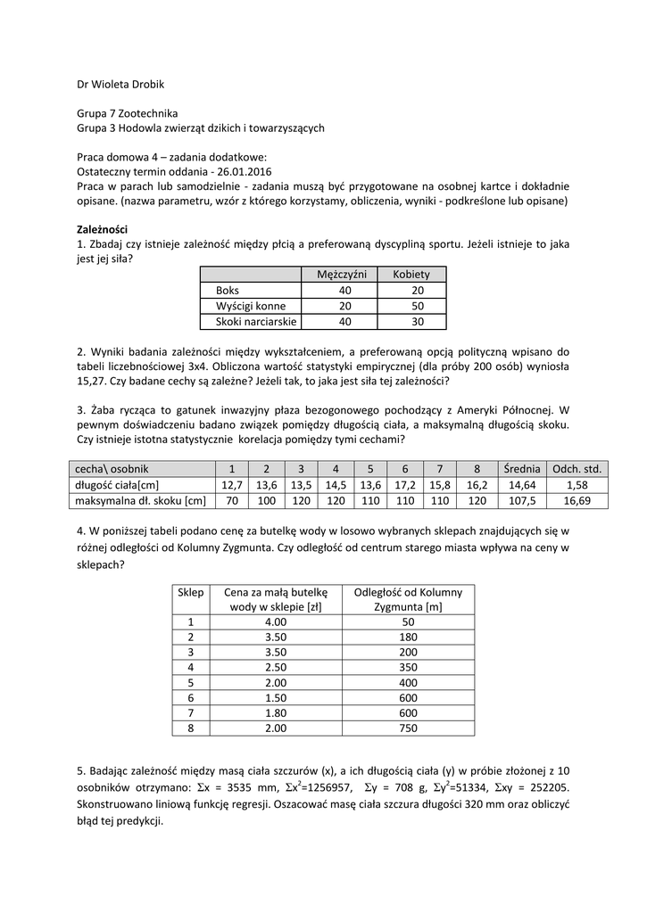 Dr Wioleta Drobik Grupa 7 Zootechnika Grupa 3 Hodowla zwierząt dzikich i towarzyszących Praca domowa 4 – zadania dodatkowe: Ostateczny termin oddania - 26.01.2016 Praca w parach lub samodzielnie - zadania muszą być przygotowane na osobnej kartce i dokładnie opisane. (nazwa parametru, wzór z którego korzystamy, obliczenia, wyniki - podkreślone lub opisane) Zależności 1. Zbadaj czy istnieje zależność między płcią a preferowaną dyscypliną sportu. Jeżeli istnieje to jaka jest jej siła? Mężczyźni Kobiety Boks 40 20 Wyścigi konne 20 50 Skoki narciarskie 40 30 2. Wyniki badania zależności między wykształceniem, a preferowaną opcją polityczną wpisano do tabeli liczebnościowej 3x4. Obliczona wartość statystyki empirycznej (dla próby 200 osób) wyniosła 15,27. Czy badane cechy są zależne? Jeżeli tak, to jaka jest siła tej zależności? 3. Żaba rycząca to gatunek inwazyjny płaza bezogonowego pochodzący z Ameryki Północnej. W pewnym doświadczeniu badano związek pomiędzy długością ciała, a maksymalną długością skoku. Czy istnieje istotna statystycznie korelacja pomiędzy tymi cechami? cecha\ osobnik długość ciała[cm] maksymalna dł. skoku [cm] 1 12,7 70 2 13,6 100 3 13,5 120 4 14,5 120 5 13,6 110 6 17,2 110 7 15,8 110 8 16,2 120 Średnia Odch. std. 14,64 1,58 107,5 16,69 4. W poniższej tabeli podano cenę za butelkę wody w losowo wybranych sklepach znajdujących się w różnej odległości od Kolumny Zygmunta. Czy odległość od centrum starego miasta wpływa na ceny w sklepach? Sklep 1 2 3 4 5 6 7 8 Cena za małą butelkę wody w sklepie [zł] 4.00 3.50 3.50 2.50 2.00 1.50 1.80 2.00 Odległość od Kolumny Zygmunta [m] 50 180 200 350 400 600 600 750 5. Badając zależność między masą ciała szczurów (x), a ich długością ciała (y) w próbie złożonej z 10 osobników otrzymano: Σx = 3535 mm, Σx2=1256957, Σy = 708 g, Σy2=51334, Σxy = 252205. Skonstruowano liniową funkcję regresji. Oszacować masę ciała szczura długości 320 mm oraz obliczyć błąd tej predykcji.