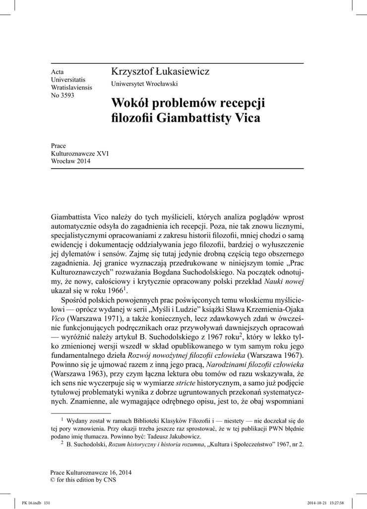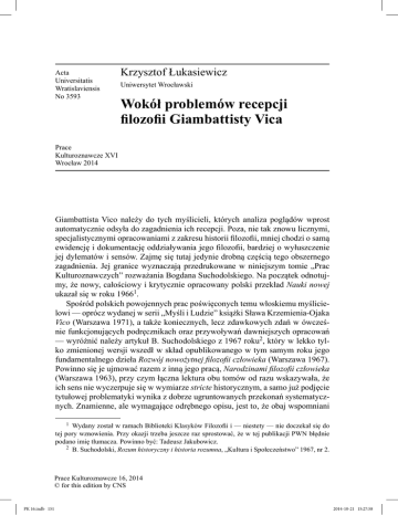 Acta Universitatis Wratislaviensis No 3593 Krzysztof Łukasiewicz Uniwersytet Wrocławski Wokół problemów recepcji filozofii Giambattisty Vica Prace Kulturoznawcze XVI Wrocław 2014 Giambattista Vico należy do tych myślicieli, których analiza poglądów wprost automatycznie odsyła do zagadnienia ich recepcji. Poza, nie tak znowu licznymi, specjalistycznymi opracowaniami z zakresu historii filozofii, mniej chodzi o samą ewidencję i dokumentację oddziaływania jego filozofii, bardziej o wyłuszczenie jej dylematów i sensów. Zajmę się tutaj jedynie drobną częścią tego obszernego zagadnienia. Jej granice wyznaczają przedrukowane w niniejszym tomie „Prac Kulturoznawczych” rozważania Bogdana Suchodolskiego. Na początek odnotujmy, że nowy, całościowy i krytycznie opracowany polski przekład Nauki nowej ukazał się w roku 19661. Spośród polskich powojennych prac poświęconych temu włoskiemu myślicielowi — oprócz wydanej w serii „Myśli i Ludzie” książki Sława Krzemienia-Ojaka Vico (Warszawa 1971), a także koniecznych, lecz zdawkowych zdań w ówcześnie funkcjonujących podręcznikach oraz przywoływań dawniejszych opracowań — wyróżnić należy artykuł B. Suchodolskiego z 1967 roku2, który w lekko tylko zmienionej wersji wszedł w skład opublikowanego w tym samym roku jego fundamentalnego dzieła Rozwój nowożytnej filozofii człowieka (Warszawa 1967). Powinno się je ujmować razem z inną jego pracą, Narodzinami filozofii człowieka (Warszawa 1963), przy czym łączna lektura obu tomów od razu wskazywała, że ich sens nie wyczerpuje się w wymiarze stricte historycznym, a samo już podjęcie tytułowej problematyki wynika z dobrze ugruntowanych przekonań systematycznych. Znamienne, ale wymagające odrębnego opisu, jest to, że obaj wspomniani 1 Wydany został w ramach Biblioteki Klasyków Filozofii i — niestety — nie doczekał się do tej pory wznowienia. Przy okazji trzeba jeszcze raz sprostować, że w tej publikacji PWN błędnie podano imię tłumacza. Powinno być: Tadeusz Jakubowicz. 2 B. Suchodolski, Rozum historyczny i historia rozumna, „Kultura i Społeczeństwo” 1967, nr 2. Prace Kulturoznawcze 16, 2014 © for this edition by CNS PK 16.indb 151 2014-10-21 15:27:58 152 Krzysztof Łukasiewicz wyżej polscy badacze Vikiańską koncepcję interpretowali w perspektywie antropologii filozoficznej3. Oprócz tego, że dzieliła ich różnica pokoleń oraz główne dziedziny zainteresowań, istotne jest to, że przypomniany powyżej artykuł z „Kultury i Społeczeństwa” nie był pierwszą wypowiedzią Suchodolskiego o autorze Nauki nowej. Analizując poglądy Stanisława Brzozowskiego, na czym Suchodolski skupił się w początkach lat trzydziestych ubiegłego stulecia, trudno było pominąć wypowiedzi twórcy Kultury i życia o neapolitańskim myślicielu sprzed wieków. Wszakże w swej szeroko dyskutowanej w okresie międzywojennym monografii o Brzozowskim ograniczył się Suchodolski jedynie do bardzo zwięzłych wzmianek — np. o tym, że intelektualny rozwój autora Idei prowadził „od Kanta i Fichtego do Vica”4. W porównaniu z dzisiejszymi szczegółowymi studiami nad relacją Brzozowski–Vico wygląda to nader skromnie, ale nie zaważył na tym jedynie brak dokumentacji źródłowej i wystarczająco pogłębionej literatury sekundarnej5. Zdawkowo też Suchodolski we wspomnianej książce potraktował kwestię polskiej modernistycznej recepcji poglądów włoskiego filozofa, a przecież oprócz Brzozowskiego nawiązywali doń inni ówcześni myśliciele i pisarze6. Z drugiej strony jednak stosunkowo szeroko Suchodolski charakteryzował filozofię przełomu XIX i XX wieku jako tło, na którym usamodzielniały się poglądy Brzozowskiego, i podłoże, z którego wybiórczo i twórczo czerpał. Nie uznał jednak za potrzebne przywoływać opinii o Vicu ważnego dla antypozytywistycznych dyskusji filozofa i noblisty Rudolfa Euckena7, któremu skądinąd poświęcił jeden ze swo3 Jest to dostrzegalne również w haśle „Vico”, jakie S. Krzemień-Ojak opracował na potrzeby dziewiątego tomu Powszechnej Encyklopedii Filozofii (Lublin 2008). 4 B. Suchodolski, Stanisław Brzozowski. Rozwój ideologii, Warszawa 1933, s. 114. 5 Co ciekawe, w okazjonalnym i przeznaczonym dla zagranicznego odbiory artykule Wandlungen in der philosophischen Atmosphäre in Polen („Slavische Rundschau” 1937) Roman Ingarden tak pisał: „W pierwszym dziesięcioleciu XX wieku rozwinął bardzo żywą działalność młodo zmarły pisarz i filozof Stanisław Brzozowski. Nawiązując do J.B. Vico kładł on nacisk na humanistyczną filozofię historii (nie wiedząc zresztą o Diltheyu) i podkreślał twórczą rolę człowieka w dziejach” (cyt. za: R. Ingarden, Główne kierunki filozofii polskiej, przeł. J. Kuczyński, „Studia Filozoficzne” 1973, nr 1, s. 14). 6 Zob. Z. Kuderowicz, Artyści i historia. Koncepcje historiozoficzne polskiego modernizmu, Wrocław 1980. „Poglądy te inspirowały refleksję zwolenników modernizmu nad historyczną rolą sztuki oraz grożącymi jej niebezpieczeństwami ze strony cywilizacji technicznej i organizacji życia zbiorowego” (s. 73). Ponadto B. Szymańska, Poeta i nieznane. Poglądy filozoficzne Antoniego Langego, Wrocław 1979; M. Podraza-Kwiatkowska, Ideał jedności doskonałej (o Antonim Langem jako krytyku), [w:] eadem, Somnambulicy — dekadenci — herosi, Kraków 1985, s. 340–389. Szerzej i bardziej autonomicznie poglądy Vica Kuderowicz charakteryzował w innych swych książkach: Filozofia dziejów, Warszawa 1983, s. 35–43, a także Filozofia nowożytnej Europy, Warszawa 1989, s. 258–267. 7 W wielokrotnie wydanej książce z roku 1890 Wielcy myśliciele i ich poglądy na życie (przeł. A. Zieleńczyk, Lwów-Poznań 1925) Eucken przyznawał: „Vico, który dziś jest więcej chwalony, niż czytany, jest bliższy Odrodzeniu i jego platonizmowi, niż Oświeceniu. Ale O