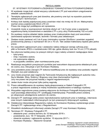 REGULAMIN 57. WYSTAWY FOTOGRAFII ŁÓDZKIEGO TOWARZYSTWA FOTOGRAFICZNEGO 1. 2. 3. 4. 5. 6. 7. 8. W wystawie mogą brać udział wszyscy członkowie ŁTF pod warunkiem uregulowania składek członkowskich. Tematyka zgłaszanych prac jest dowolna, ale powinny one być na wysokim poziomie estetycznym i technicznym. Krótszy bok każdej pojedynczej pracy powinien mieć nie mniej niż 30 cm. Maksymalny wymiar pracy pojedynczej 50cm x70 cm Prace nie mogą być podklejone ani oprawione. Uczestnik może w wyznaczonym terminie złożyć od 1 do 5 prac wraz z poprawnie wypełnioną Kartą Uczestnictwa w siedzibie ŁTF-u przy ulicy Piotrkowskiej 102 w Łodzi. Do wystawy można składać także zestawy prac (maksymalnie dwa) pod warunkiem zachowania spójności tematyki, techniki i formatu prac składowych. Zestaw może zawierać od 2 do 6 prac (minimalny rozmiar 20x30cm i powinien wypełnić powierzchnię planszy o wymiarach 50 cm x 70 cm. Taki zestaw traktowany będzie jako jedna praca. Do wszystkich zgłoszonych prac i zestawów należy dołączyć wersję cyfrową prac: pliki w formacie JPEG o rozdzielczości 300 dpi, gdzie dłuższy bok ma 15 cm (1772 pikseli). Na odwrocie każdej pracy (w prawym dolnym rogu) należy umieścić następujące dane: tytuł pracy, imię i nazwisko autora, rok wykonania zdjęcia, w przypadku zestawu: plan rozmieszczenia prac. 9. Realizacja wszystkich powyższych punktów jest warunkiem dopuszczenia składanych prac do oceny Jury. Decyduje o tym Komisarz Wystawy. 10. Jury powołane przez Zarząd ŁTF dokona kwalifikacji prac do wystawy oraz podziału nagród. Werdykt Jury jest ostateczny. 11. Jury może przyznać pięć nagród Za Twórczość Artystyczną dla najlepszych autorów roku. Są to Medale: Złoty, Srebrny i Brązowy oraz dwa równorzędne Dyplomy. Jury ma prawo nie przyznać każdej z nagród regulaminowych. 12. Jeden Autor może otrzymać tylko jedną nagrodę. 13. Prace zakwalifikowane do wystawy będą eksponowane w Galerii Fotografii ŁTF, a prace nagrodzone zostaną w miarę możliwości opublikowane w katalogu wystawy. 14. Wszystkie nagrodzone prace zostaną włączone do Archiwum Fotografii Artystycznej ŁTF, czyli pozostają własnością ŁTF i podlegają inwentaryzacji. Pozostałe prace zostaną po ekspozycji udostępnione autorom do zwrotu. 15. Zarząd ŁTF zastrzega sobie prawo reprodukowania wybranych prac w katalogu, internecie oraz innych materiałach informacyjnych (w tym prasowych) dotyczących wystawy. 16. Ostateczna interpretacja Regulaminu należy do Komisarza Wystawy wybieranego przez Zarząd ŁTF i ogłaszanego wraz z Regulaminem. 17. Wszelkich dodatkowych informacji udziela Zarząd ŁTF oraz Komisarz Wystawy. 18. Terminarz 57. Wystawy Fotografii ŁTF: składanie prac: zmiana terminu do 10 listopada 2016 r. posiedzenie Jury: 16-17 listopada. 2016 r. otwarcie wystawy i ogłoszenie wyników: 10 stycznia 2017 r. Komisarz Wystawy – Sławomir Grzanek Niniejszy regulamin został zatwierdzony przez Zarząd Łódzkiego Towarzystwa Fotograficznego na posiedzeniu w dniu 8 sierpnia 2016 r.