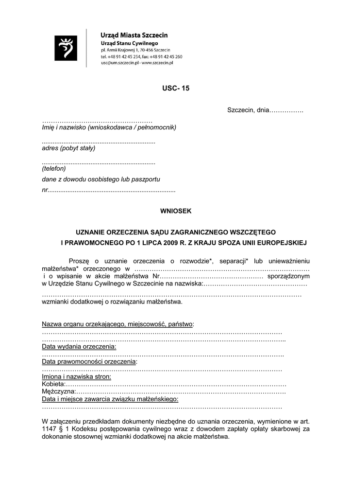 USC- 15 Szczecin, dnia……………. …………………………………………… Imię i nazwisko (wnioskodawca / pełnomocnik) ............................................................... adres (pobyt stały) ............................................................... (telefon) dane z dowodu osobistego lub paszportu nr....................................................................... WNIOSEK UZNANIE ORZECZENIA SĄDU ZAGRANICZNEGO WSZCZĘTEGO I PRAWOMOCNEGO PO 1 LIPCA 2009 R. Z KRAJU SPOZA UNII EUROPEJSKIEJ Proszę o uznanie orzeczenia o rozwodzie*, separacji* lub unieważnieniu małżeństwa* orzeczonego w ……………………………………………………………………… i o wpisanie w akcie małżeństwa Nr………………………………………… sporządzonym w Urzędzie Stanu Cywilnego w Szczecinie na nazwiska:………………………………………… ………………………………………………………………………………………………………… wzmianki dodatkowej o rozwiązaniu małżeństwa. Nazwa organu orzekającego, miejscowość, państwo: ………………………………………………………………………………………………… ………………………………………………………………………………………………….. Data wydania orzeczenia: …………………………………………………………………………………………………. Data prawomocności orzeczenia: ………………………………………………………………………………………………… Imiona i nazwiska stron: Kobieta:………………………………………………………………………………………… Mężczyzna:……………………………………………………………………………………. Data i miejsce zawarcia związku małżeńskiego: ………………………………………………………………………………………………… W załączeniu przedkładam dokumenty niezbędne do uznania orzeczenia, wymienione w art. 1147 § 1 Kodeksu postępowania cywilnego wraz z dowodem zapłaty opłaty skarbowej za dokonanie stosownej wzmianki dodatkowej na akcie małżeństwa. OŚWIADCZENIE W trakcie postępowania sądowego oboje posiadaliśmy miejsce zamieszkania za granicą. Jednocześnie oświadczam, że orzeczenie o rozwodzie nie było wcześniej wpisane przeze mnie jak i współmałżonka do Rejestru Stanu Cywilnego na terenie Rzeczypospolitej Polskiej, ani nie toczyło się przed sądem polskim postępowanie o rozwód mojego małżeństwa. W postępowaniu sądowym braliśmy czynny udział i nie byliśmy pozbawieni możliwości obrony. ……………………..………………… podpis wnioskodawcy * niepotrzebne skreślić