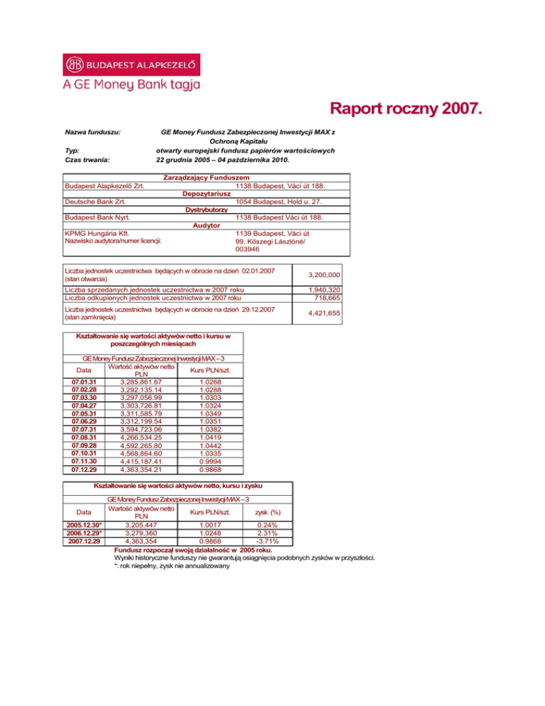 Raport roczny 2007. Nazwa funduszu: Typ: Czas trwania: GE Money Fundusz Zabezpieczonej Inwestycji MAX z Ochroną Kapitału otwarty europejski fundusz papierów wartościowych 22 grudnia 2005 – 04 października 2010. Zarządzający Funduszem 1138 Budapest, Váci út 188. Depozytariusz Deutsche Bank Zrt. 1054 Budapest, Hold u. 27. Dystrybutorzy Budapest Bank Nyrt. 1138 Budapest Váci út 188. Audytor KPMG Hungária Kft. 1139 Budapest, Váci út Nazwisko audytora/numer licencji: 99. Kőszegi Lászlóné/ 003946 Budapest Alapkezelő Zrt. Liczba jednostek uczestnictwa będących w obrocie na dzień 02.01.2007 (stan otwarcia) 3,200,000 Liczba sprzedanych jednostek uczestnictwa w 2007 roku Liczba odkupionych jednostek uczestnictwa w 2007 roku 1,940,320 718,665 Liczba jednostek uczestnictwa będących w obrocie na dzień 29.12.2007 (stan zamknięcia) 4,421,655 Kształtowanie się wartości aktywów netto i kursu w poszczególnych miesiącach GE Money Fundusz Zabezpieczonej Inwestycji MAX – 3 Wartość aktywów netto Data Kurs PLN/szt. PLN 07.01.31 3,285,861.67 1.0268 07.02.28 3,292,135.14 1.0288 07.03.30 3,297,056.99 1.0303 07.04.27 3,303,726.81 1.0324 07.05.31 3,311,585.79 1.0349 07.06.29 3,312,199.54 1.0351 07.07.31 3,594,723.06 1.0382 07.08.31 4,266,534.25 1.0419 07.09.28 4,592,265.80 1.0442 07.10.31 4,568,864.60 1.0335 07.11.30 4,415,187.41 0.9994 07.12.29 4,363,354.21 0.9868 Kształtowanie się wartości aktywów netto, kursu i zysku GE Money Fundusz Zabezpieczonej Inwestycji MAX – 3 Wartość aktywów netto Data Kurs PLN/szt. zysk (%) PLN 2005.12.30* 3,205,447 1.0017 0.24% 2006.12.29* 3,279,360 1.0248 2.31% 2007.12.29 4,363,354 0.9868 -3.71% Fundusz rozpoczął swoją działalność w 2005 roku. Wyniki historyczne funduszy nie gwarantują osiągnięcia podobnych zysków w przyszłości. *: rok niepełny, zysk nie annualizowany Informacje dotyczące transakcji na instrumentach pochodnych Typ: Produkty w tle: Produkty pochodne nie - giełdowe 1/12 HSCEI Index; 1/12 NKY Index; 1/12 SPX Index; 1/12 SX5E Index; 1/9 GOLDLNAM Cmdty; 1/9 LOAHDY Cmdty; 1/9 LOCADY Cmdty; 1/6 EPEU Index; 1/6 TSEREIT Index Wartość nominalna: Wartość aktywów: Dzień zawarcia umowy: Termin zapadalności: Kurs: 4,600,000 -299,460 2007.10.01 2010.10.06 -6.51 Zmiany zaistniałe w działalności Zarządzającego Funduszem oraz ważniejsze czynniki mające wpływ na kształtowanie się polityki inwestycyjnej, pozostałe informacje W ciągu 2007 roku nie zaszły żadne istotne zmiany w działalności Zarządzającego Funduszem. Zmiana zasad wyceny aktywów występujących w portfelu Funduszu weszła w życie od dnia 01 marca 2007 roku. Cykl rynków kapitałowych rozpoczął się w październiku 2007 roku. Pozostałe informacje W ciągu roku Fundusz nie korzystał z kredytów. Sytuacja makroekonomiczna i rynków kapitałowych – 2007 rok. Rynek obligacji państwowych i papierów dewizowych Rok 2007 charakteryzowały duże wahania na rynku obligacji państwowych. Na początku roku krzywa zysku wykazywała jeszcze znaczny spadek na poziomie 150 punktów bazowych z poziomu podstawowych 8,00%. Podczas wyceny spadku oprocentowania podmioty zagraniczne w pierwszych miesiącach bardzo szybko o około 200 miliardów forintów zwiększyły swoje zaangażowanie w węgierskie obligacje państwowe, zaś w pozostałej części roku nie wystąpiły już dalsze istotne zmiany tym zakresie. Mimo, że do sierpnia Węgierski Bank Narodowy przeprowadził obniżkę o 25 punktów bazowych, to kształtowanie się zysków benchmark odnotowało dalszy istotny spadek odsetek podstawowych. Wzmocnienie było większe w przypadku transakcji krótkoterminowych, w związku z czym krzywa zysków stała się bardziej pochyła. Marże ryzyka dotyczące zysków w euro uległy znacznemu zawężeniu, spadły poniżej dołka okresu ostatnich pięciu lat. W drugiej połowie roku rozpoczęła się natomiast moderacja oczekiwań spadków oprocentowania. Otoczenie zewnętrzne stawało się coraz bardziej negatywne, a i wewnętrzna dezinflacja też zaczęła utykać ze względu na globalny szok cen żywności i energii. Banki centralne w regionie również weszły w cykl zwyżek, co w dużym stopniu limitowało działalność Narodowego Banku Węgierskiego. Na koniec roku z węgierskiej krzywej już niemal całkowicie zniknęły oczekiwane wcześniej spadki oprocentowania. Na rynku obligacji państwowych oprócz zmiany oczekiwań w zakresie oprocentowania spodziewane kształtowanie się popytu i podaży również działało na niekorzyść dalszego umocnienia. W przypadku otwartych funduszy emerytalnych w wyniku negatywnego oddziaływania re-alokacji na obligacje nastąpił istotny spadek popytu na obligacje państwowe. Po stronie podażowej mimo spadku deficytu budżetowego emisja netto w 2008 roku nie będzie wykazywała znacznego spadku. Międzynarodowy rynek akcji Globalne rynki akcji zamknęły bardzo pracowity rok 2007. Rok upłynął w zasadzie pod znakiem wzrostów – indeks światowy MSCI wykazał wzrost o 9,69% w skali roku – aczkolwiek w trakcie 2007 roku miały również miejsce trzy istotne korekty: w marcu -6%, podczas lata -10%, i wreszcie po listopadowym szczycie na skutek pogłębiania się kryzysu rynku hipotecznego do końca grudnia indeks stracił ze swojej wartości ponad 8%. W Ameryce istotny wzrost odnotowano w przypadku papierów firm technologicznych, reprezentujący ten sektor indeks NASDAQ zdrożał o 19,20%, zaś S&P 500 wzrósł jedynie o 5,48%. Paneuropejski indeks DJ Eurostoxx 50 osiągnął wyniki podobne do osiągniętych w 2006 roku: +10,41% (w 2006 roku 39%). W Europie odnotowano wzrost niemieckiego DAX, który w trakcie roku zdrożał o 22,29%, podczas gdy japoński Nikkei 225 osiągnął jakże rozczarowujący wynik -10,23%. W 2007 roku konkurencję dla giełd międzynarodowe stanowiły rynki rozwijające się, spośród których najpoważniejsze wyniki odnotowały Chiny, Szanghaj przyniósł zysk 97,95%, brazylijski