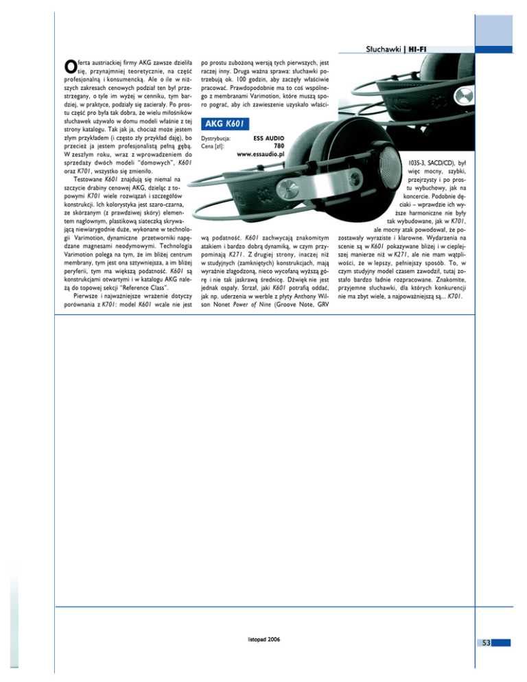 S³uchawki HI-FI O ferta austriackiej firmy AKG zawsze dzieli³a siê, przynajmniej teoretycznie, na czêœæ profesjonaln¹ i konsumenck¹. Ale o ile w ni¿szych zakresach cenowych podzia³ ten by³ przestrzegany, o tyle im wy¿ej w cenniku, tym bardziej, w praktyce, podzia³y siê zaciera³y. Po prostu czêœæ pro by³a tak dobra, ¿e wielu mi³oœników s³uchawek u¿ywa³o w domu modeli w³aœnie z tej strony katalogu. Tak jak ja, chocia¿ mo¿e jestem z³ym przyk³adem (i czêsto z³y przyk³ad dajê), bo przecie¿ ja jestem profesjonalist¹ pe³n¹ gêb¹. W zesz³ym roku, wraz z wprowadzeniem do sprzeda¿y dwóch modeli “domowych”, K601 oraz K701, wszystko siê zmieni³o. Testowane K601 znajduj¹ siê niemal na szczycie drabiny cenowej AKG, dziel¹c z topowymi K701 wiele rozwi¹zañ i szczegó³ów konstrukcji. Ich kolorystyka jest szaro-czarna, ze skórzanym (z prawdziwej skóry) elementem nag³ownym, plastikow¹ siateczk¹ skrywaj¹c¹ niewiarygodnie du¿e, wykonane w technologii Varimotion, dynamiczne przetworniki napêdzane magnesami neodymowymi. Technologia Varimotion polega na tym, ¿e im bli¿ej centrum membrany, tym jest ona sztywniejsza, a im bli¿ej peryferii, tym ma wiêksz¹ podatnoœæ. K601 s¹ konstrukcjami otwartymi i w katalogu AKG nale¿¹ do topowej sekcji “Reference Class”. Pierwsze i najwa¿niejsze wra¿enie dotyczy porównania z K701: model K601 wcale nie jest po prostu zubo¿on¹ wersj¹ tych pierwszych, jest raczej inny. Druga wa¿na sprawa: s³uchawki potrzebuj¹ ok. 100 godzin, aby zaczê³y w³aœciwie pracowaæ. Prawdopodobnie ma to coœ wspólnego z membranami Varimotion, które musz¹ sporo pograæ, aby ich zawieszenie uzyska³o w³aœci- AKG K601 Dystrybucja: Cena [z³] : ESS AUDIO 780 www.essaudio.pl w¹ podatnoœæ. K601 zachwycaj¹ znakomitym atakiem i bardzo dobr¹ dynamik¹, w czym przypominaj¹ K271. Z drugiej strony, inaczej ni¿ w studyjnych (zamkniêtych) konstrukcjach, maj¹ wyraŸnie z³agodzon¹, nieco wycofan¹ wy¿sz¹ górê i nie tak jaskraw¹ œrednicê. DŸwiêk nie jest jednak ospa³y. Strza³, jaki K601 potrafi¹ oddaæ, jak np. uderzenia w werble z p³yty Anthony Wilson Nonet Power of Nine (Groove Note, GRV luty 2005 2006 listopad 1035-3, SACD/CD), by³ wiêc mocny, szybki, przejrzysty i po prostu wybuchowy, jak na koncercie. Podobnie dêciaki – wprawdzie ich wy¿sze harmoniczne nie by³y tak wybudowane, jak w K701, ale mocny atak powodowa³, ¿e pozostawa³y wyraziste i klarowne. Wydarzenia na scenie s¹ w K601 pokazywane bli¿ej i w cieplejszej manierze ni¿ w K271, ale nie mam w¹tpliwoœci, ¿e w lepszy, pe³niejszy sposób. To, w czym studyjny model czasem zawodzi³, tutaj zosta³o bardzo ³adnie rozpracowane. Znakomite, przyjemne s³uchawki, dla których konkurencji nie ma zbyt wiele, a najpowa¿niejsz¹ s¹... K701. 53