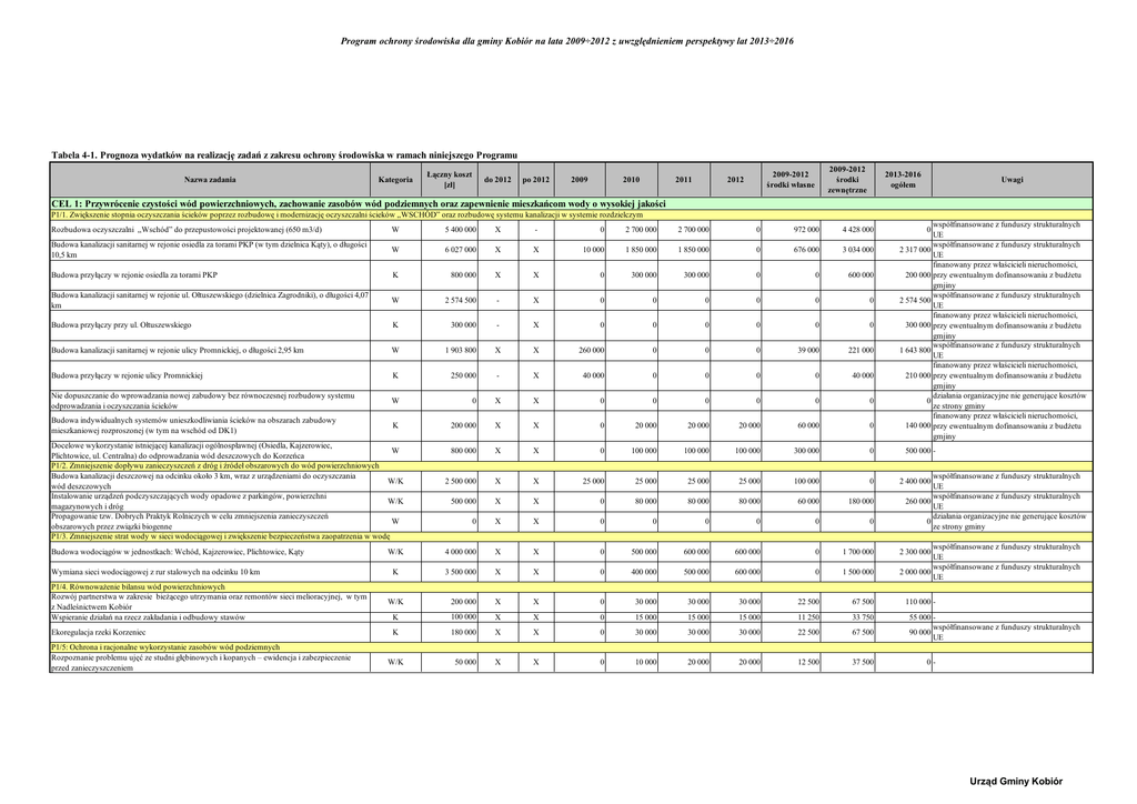 Program ochrony środowiska dla gminy Kobiór na lata 2009÷2012 z uwzględnieniem perspektywy lat 2013÷2016 Tabela 4-1. Prognoza wydatków na realizację zadań z zakresu ochrony środowiska w ramach niniejszego Programu Nazwa zadania Kategoria Łączny koszt [zł] do 2012 po 2012 2009 2010 2011 2009-2012 środki zewnętrzne 2009-2012 środki własne 2012 2013-2016 ogółem Uwagi CEL 1: Przywrócenie czystości wód powierzchniowych, zachowanie zasobów wód podziemnych oraz zapewnienie mieszkańcom wody o wysokiej jakości P1/1. Zwiększenie stopnia oczyszczania ścieków poprzez rozbudowę i modernizację oczyszczalni ścieków „WSCHÓD” oraz rozbudowę systemu kanalizacji w systemie rozdzielczym Rozbudowa oczyszczalni „Wschód” do przepustowości projektowanej (650 m3/d) W 5 400 000 X - 0 2 700 000 2 700 000 0 972 000 4 428 000 Budowa kanalizacji sanitarnej w rejonie osiedla za torami PKP (w tym dzielnica Kąty), o długości 10,5 km W 6 027 000 X X 10 000 1 850 000 1 850 000 0 676 000 3 034 000 Budowa przyłączy w rejonie osiedla za torami PKP K 800 000 X X 0 300 000 300 000 0 0 600 000 Budowa kanalizacji sanitarnej w rejonie ul. Ołtuszewskiego (dzielnica Zagrodniki), o długości 4,07 km W 2 574 500 - X 0 0 0 0 0 0 Budowa przyłączy przy ul. Ołtuszewskiego K 300 000 - X 0 0 0 0 0 0 Budowa kanalizacji sanitarnej w rejonie ulicy Promnickiej, o długości 2,95 km W 1 903 800 X X 260 000 0 0 0 39 000 221 000 Budowa przyłączy w rejonie ulicy Promnickiej K 250 000 - X 40 000 0 0 0 0 40 000 Nie dopuszczanie do wprowadzania nowej zabudowy bez równoczesnej rozbudowy systemu odprowadzania i oczyszczania ścieków W 0 X X 0 0 0 0 0 0 Budowa indywidualnych systemów unieszkodliwiania ścieków na obszarach zabudowy mieszkaniowej rozproszonej (w tym na wschód od DK1) K 200 000 X X 0 20 000 20 000 20 000 60 000 0 800 000 X X 0 100 000 100 000 100 000 300 000 0 2 500 000 X X 25 000 25 000 25 000 25 000 100 000 0 500 000 X X 0 80 000 80 000 80 000 60 000 180 000 0 X X 0 0 0 0 0 0 W/K 4 000 000 X X 0 500 000 600 000 600 000 0 1 700 000 K 3 500 000 X X 0 400 000 500 000 600 000 0 1 500 000 Docelowe wykorzystanie istniejącej kanalizacji ogólnospławnej (Osiedla, Kajzerowiec, W Plichtowice, ul. Centralna) do odprowadzania wód deszczowych do Korzeńca P1/2. Zmniejszenie dopływu zanieczyszczeń z dróg i źródeł obszarowych do wód powierzchniowych Budowa kanalizacji deszczowej na odcinku około 3 km, wraz z urządzeniami do oczyszczania W/K wód deszczowych Instalowanie urządzeń podczyszczających wody opadowe z parkingów, powierzchni W/K magazynowych i dróg Propagowanie tzw. Dobrych Praktyk Rolniczych w celu zmniejszenia zanieczyszczeń W obszarowych przez związki biogenne P1/3. Zmniejszenie strat wody w sieci wodociągowej i zwiększenie bezpieczeństwa zaopatrzenia w wodę Budowa wodociągów w jednostkach: Wchód, Kajzerowiec, Plichtowice, Kąty Wymiana sieci wodociągowej z rur stalowych na odcinku 10 km P1/4. Równoważenie bilansu wód powierzchniowych Rozwój partnerstwa w zakresie bieżącego utrzymania oraz remontów sieci melioracyjnej, w tym z Nadleśnictwem Kobiór Wspieranie działań na rzecz zakładania i odbudowy stawów Ekoregulacja rzeki Korzeniec P1/5: Ochrona i racjonalne wykorzystanie zasobów wód podziemnych Rozpoznanie problemu ujęć ze studni głębinowych i kopanych – ewidencja i zabezpieczenie przed zanieczyszczeniem W/K 200 000 X X 0 30 000 30 000 30 000 22 500 67 500 K 100 000 X X 0 15 000 15 000 15 000 11 250 33 750 K 180 000 X X 0 30 000 30 000 30 000 22 500 67 500 W/K 50 000 X X 0 10 000 20 000 20 000 12 500 37 500 współfinansowane z funduszy strukturalnych UE współfinansowane z funduszy strukturalnych 2 317 000 UE finanowany przez właścicieli nieruchomości, 200 000 przy ewentualnym dofinansowaniu z budżetu gmjiny współfinansowane z funduszy strukturalnych 2 574 500 UE finanowany przez właścicieli nieruchomości, 300 000 przy ewentualnym dofinansowaniu z budżetu gmjiny współfinansowane z funduszy strukturalnych 1 643 800 UE finanowany przez właścicieli nieruchomości, 210 000 przy ewentualnym dofinansowaniu z budżetu gmjiny działania organizacyjne nie generujące kosztów 0 ze strony gminy finanowany przez właścicieli nieruchomości, 140 000 przy ewentualnym dofinansowaniu z budżetu gmjiny 0 500 000 współfinansowane z funduszy strukturalnych UE współfinansowane z funduszy strukturalnych 260 000 UE działania organizacyjne nie generujące kosztów 0 ze strony gminy 2 400 000 współfinansowane z funduszy strukturalnych UE współfinansowane z funduszy strukturalnych 2 000 000 UE 2 300 000 110 000 55 000 współfinansowane z funduszy strukturalnych 90 000 UE 0- Urząd Gminy Kobiór Program ochrony środowiska dla gminy Kobiór na lata 2009÷2012 z uwzględnieniem perspektywy lat 2013÷2016 Nazwa zadania Kategoria Łączny koszt [zł] do 2012 po 2012 X X 2009 2010 2011 2009-2012 środki zewnętrzne 2009-2012 środki własne 2012 2013-2016 ogółem Uwagi CEL 2: Pogodzenie rozwoju gminy z wymogami ochrony gleb i ochrony terenu przed dewastacją P2/1. Zachowanie funkcji rolniczej gminy oraz naturalnego charakteru gleb rolniczych w jak najdłuższej perspektywie czasu Utrzymanie funkcji rolniczych na terenach sąsiadujących z obszarami leśnymi oraz w W 0 południowej i zachodniej części osady Wapnowanie gruntów rolnych nadmiernie zakwaszonych oraz zwiększenie nawożenia K 30 000 organicznego 100 000 Uporządkowanie terenu dawnego starorzecza Korzeńca (w tym drenaż terenu) W 10 000 Promocja proekologicznych form rolnictwa (w tym zielarstwa) W 10 000 Promocja agroturystyki W 20 000 Prowadzenie okresowych badań gleb rolniczych K P2/2. Całkowite wyeliminowanie problemu gruntów zdewastowanych i zdegradowanych Unikanie w miarę możliwości wydzielania nowych terenów dla działalności gospodarczej W 0 (preferowanie dotychczasowych terenów działalności przemysłowej) Zachowanie zasobów kopalin pospolitych jako 