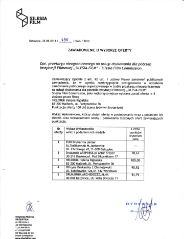 SILESIA FILM Katowice,23.09.2013 | I DAG/2013 ZAWIADOMIENIE O WYBORZE OFERTY Dot. przetargunieograniczonego na ustugidrukowaniadla potrzeb lnstytucji Filmowej ,,SlLESlA-FlLlA" - SilesfoFilm Commission. Zamawiającyzgodnie z art. 92 ust. 1 ustawy Prawo zamówień publicznych zawiadamia, że w wyniku rozstrzygnięcia postępowania o udzielenie zamówieniapublicznegoorganizowanego w trybie przetargunieograniczonego na ustugidrukowaniadla potrzebInstytucjiFitmowej,,SlLESIA-FlL/vl" jako najkorzystniejsza SilesiaFilm Commission, wybranazostatofertanr 3 z|ozonaprzez firmę HELDRUK HelenaRąbalska 8f.z00 Malbork,ul. Partyzantów3b Punktacjaoferty'100pkt (cenajedynymkryterium) WykazWykonawców,którzy zt'oĄIiofertyw postępowaniu wraz z podaniemich siedzib oraz streszczeniemoceny i porównaniaztożonychofert zawierających punktację. Nr WykazWykonawców oferty wrazz podaniemich siedzib 1 f 3 4 5 PUHDrukarnia Janter St.Terlikowski ; M.Jankowicz Ul. Chrobrego 4'1,11 -300Biskupiec pl Artur Freyer DrukarniaARTPRESS. 30-z16Kraków;ul.PodSikornikiem 17 HELDRUKHelena Rąbatska 82-200Matbork,U[.Partyzantów3b OficynaDrukarskaJ.Chmielewski Ut. Sokotowska'l 2a,01-142Warszawa DRUKARN IAARCHIDIECEZJALNA 40-048Katowice, Ut. Wita Stwosza 11 Liczba punktów kryterium cena 70,67 100,00 )5,92 54,79 DYF t Mąń lnsgtucJa Fllmowa S!LESIAFItM u[. Górnicza 5 4o-oog Katowice T. 32 206 88 61 F,32 259 83 88 NIP634-o12-57-90 REc0N276654897