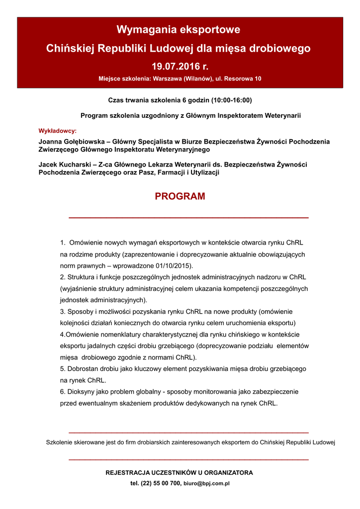 Wymagania eksportowe Chińskiej Republiki Ludowej dla mięsa drobiowego 19.07.2016 r. Miejsce szkolenia: Warszawa (Wilanów), ul. Resorowa 10 Czas trwania szkolenia 6 godzin (10:00-16:00) Program szkolenia uzgodniony z Głównym Inspektoratem Weterynarii Wykładowcy: Joanna Gołębiowska – Główny Specjalista w Biurze Bezpieczeństwa Żywności Pochodzenia Zwierzęcego Głównego Inspektoratu Weterynaryjnego Jacek Kucharski – Z-ca Głównego Lekarza Weterynarii ds. Bezpieczeństwa Żywności Pochodzenia Zwierzęcego oraz Pasz, Farmacji i Utylizacji PROGRAM _____________________________________________ 1. Omówienie nowych wymagań eksportowych w kontekście otwarcia rynku ChRL na rodzime produkty (zaprezentowanie i doprecyzowanie aktualnie obowiązujących norm prawnych – wprowadzone 01/10/2015). 2. Struktura i funkcje poszczególnych jednostek administracyjnych nadzoru w ChRL (wyjaśnienie struktury administracyjnej celem ukazania kompetencji poszczególnych jednostek administracyjnych). 3. Sposoby i możliwości pozyskania rynku ChRL na nowe produkty (omówienie kolejności działań koniecznych do otwarcia rynku celem uruchomienia eksportu) 4.Omówienie nomenklatury charakterystycznej dla rynku chińskiego w kontekście eksportu jadalnych części drobiu grzebiącego (doprecyzowanie podziału elementów mięsa drobiowego zgodnie z normami ChRL). 5. Dobrostan drobiu jako kluczowy element pozyskiwania mięsa drobiu grzebiącego na rynek ChRL. 6. Dioksyny jako problem globalny - sposoby monitorowania jako zabezpieczenie przed ewentualnym skażeniem produktów dedykowanych na rynek ChRL. _____________________________________________ Szkolenie skierowane jest do firm drobiarskich zainteresowanych eksportem do Chińskiej Republiki Ludowej _____________________________________________ REJESTRACJA UCZESTNIKÓW U ORGANIZATORA tel. (22) 55 00 700, [email protected] ZGŁOSZENIE UDZIAŁU Wymagania eksportowe Chińskiej Republiki Ludowej dla mięsa drobiowego 19.07.2016 r. Miejsce szkolenia: Warszawa (Wilanów), ul. Resorowa 10 I. Dane uczestnika: A/ imię i nazwisko uczestnika: ............................................................ stanowisko: ........................................................... B/ imię i nazwisko uczestnika: ............................................................ stanowisko: ........................................................... C/ imię i nazwisko uczestnika: ............................................................ stanowisko: ........................................................... II. Dane nabywcy potrzebne do wystawienia faktury VAT: 1. Pełna nazwa firmy: …..................................................................................................................................................... 2. Adres firmy: …................................................................................................................................................................ 3. Telefon: .................................................... Fax: ........................................... e-mail: ...................................................... 4. NIP: …............................................................................................................................................................................. III. Opłata za udział w szkoleniu jednej osoby obejmuje: • materiały szkoleniowe, serwis kawowy, lunch oraz świadectwo ukończenia szkolenia □ 850 zł x liczba osób …..................... = ….............................. zł + 23% VAT IV. Warunki uczestnictwa: 1. Podstawą do wzięcia udziału w szkoleniu jest wypełnienie i przesłanie niniejszego zgłoszenia faxem lub e-mailem na adres organizatora. 2. Przesłanie do Biura Promocji Jakości Sp. z o.o. wypełnionego i podpisanego formularza zgłoszeniowego stanowi zawarcie wiążącej umowy pomiędzy zgłaszającym a Biurem Promocji Jakości. Faktura pro forma jest standardowo wystawiana i wysyłana emailem lub faxem po otrzymaniu formularza zgłoszeniowego. 3. Prosimy o dokonanie wpłaty w terminie 14 dni od wysłania zgłoszenia, ale nie później niż dzień przed rozpoczęciem szkolenia. 4. Wpłaty należy dokonać na konto: Biuro Promocji Jakości Sp. z o.o. – BPJ Bank Millennium: 59 1160 2202 0000 0000 4947 8666 5. W przypadku pisemnej rezygnacji z uczestnictwa w terminie do 14 dni przed dniem szkolenia, uczestnik zobowiązany jest do uiszczenia opłaty manipulacyjnej w wysokości 20% opłaty za udział w szkoleniu + 23% VAT. 6. W przypadku pisemnej rezygnacji z uczestnictwa w terminie późniejszym niż 14 dni lub braku udziału w szkoleniu, uczestnik zobowiązany jest do uiszczenia pełnej kwoty wynikającej z przesłanego zgłoszenia. 7. Nieodwołanie zgłoszenia powoduje obciążenie pełnymi kosztami udziału w szkoleniu. 8. Niedokonanie wpłaty nie jest jednoznaczne z rezygnacją z udziału w szkoleniu. 9. Po wcześniejszym uzgodnieniu z organizatorem istnieje możliwość zmiany osoby zgłoszonej do udziału w szkoleniu. 10. Organizator zastrzega sobie prawo do zmian w programie oraz zmiany terminu lub odwołania szkolenia. 11. W przypadku wyczerpania liczby miejsc lub odwołania szkolenia z winy organizatora, uczestnikowi zwrócona zostanie cała kwota wpłaty. Zgodnie z ustawą z dnia 29 sierpnia 1997 r. o ochronie danych osobowych (Dz.U. 1997 r. Nr 133 poz. 833) Biuro Promocji Jakości Sp. z o.o. z siedzibą w Warszawie (dalej BPJ), informuje, że jest administratorem danych osobowych. Wyrażam zgodę na przetwarzanie danych osobowych w celach promocji i marketingu działalności prowadzonej przez BPJ, świadczonych usług oraz oferowanych produktów, a także w celu promocji ofert klientów BPJ. Wyrażam również zgodę na otrzymywanie drogą elektroniczną ofert oraz informacji handlowych dotyczących BPJ oraz klientów BPJ. Wyrażającemu zgodę na przetwarzanie danych osobowych przysługuje prawo kontroli przetwarzan