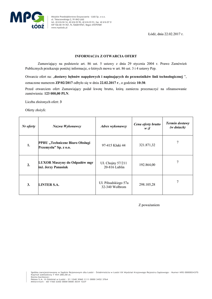 Łódź, dnia 22.02.2017 r. INFORMACJA Z OTWARCIA