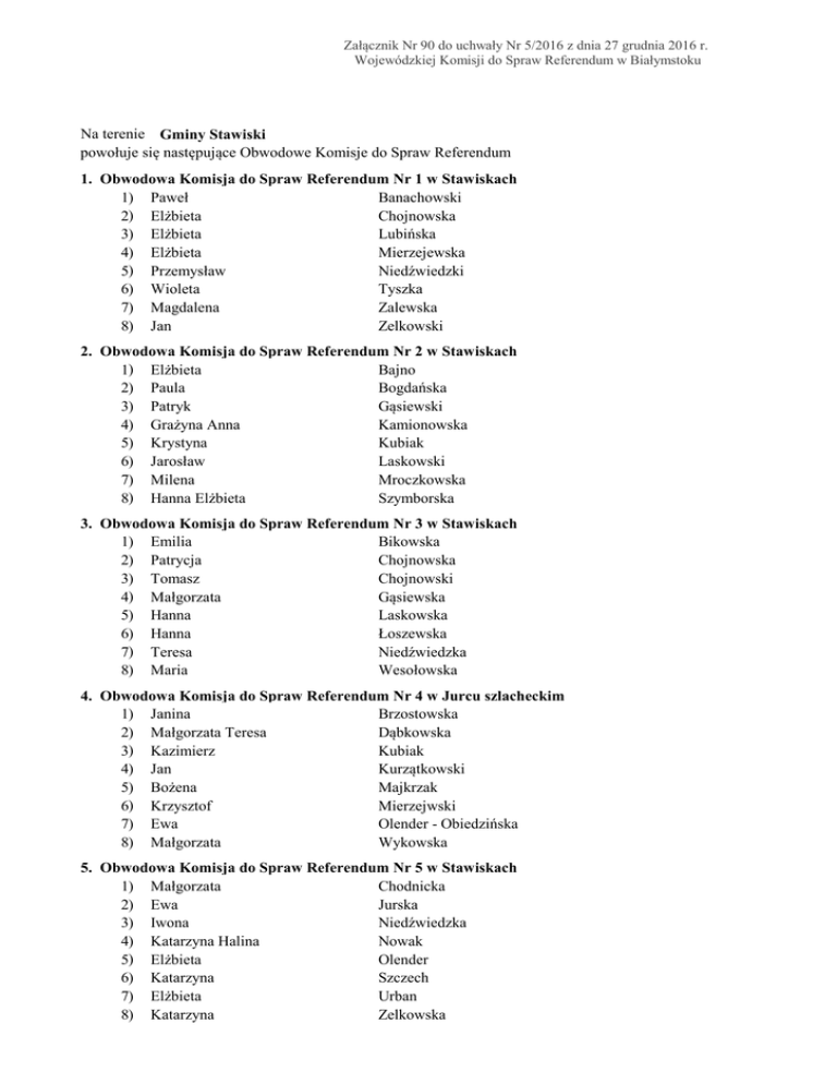 Załącznik Nr 90 do uchwały Nr 5/2016 z dnia 27 grudnia 2016 r. Wojewódzkiej Komisji do Spraw Referendum w Białymstoku Na terenie Gminy Stawiski powołuje się następujące Obwodowe Komisje do Spraw Referendum 1. Obwodowa Komisja do Spraw Referendum Nr 1 w Stawiskach 1) Paweł Banachowski 2) Elżbieta Chojnowska 3) Elżbieta Lubińska 4) Elżbieta Mierzejewska 5) Przemysław Niedźwiedzki 6) Wioleta Tyszka 7) Magdalena Zalewska 8) Jan Zelkowski 2. Obwodowa Komisja do Spraw Referendum Nr 2 w Stawiskach 1) Elżbieta Bajno 2) Paula Bogdańska 3) Patryk Gąsiewski 4) Grażyna Anna Kamionowska 5) Krystyna Kubiak 6) Jarosław Laskowski 7) Milena Mroczkowska 8) Hanna Elżbieta Szymborska 3. Obwodowa Komisja do Spraw Referendum Nr 3 w Stawiskach 1) Emilia Bikowska 2) Patrycja Chojnowska 3) Tomasz Chojnowski 4) Małgorzata Gąsiewska 5) Hanna Laskowska 6) Hanna Łoszewska 7) Teresa Niedźwiedzka 8) Maria Wesołowska 4. Obwodowa Komisja do Spraw Referendum Nr 4 w Jurcu szlacheckim 1) Janina Brzostowska 2) Małgorzata Teresa Dąbkowska 3) Kazimierz Kubiak 4) Jan Kurzątkowski 5) Bożena Majkrzak 6) Krzysztof Mierzejwski 7) Ewa Olender - Obiedzińska 8) Małgorzata Wykowska 5. Obwodowa Komisja do Spraw Referendum Nr 5 w Stawiskach 1) Małgorzata Chodnicka 2) Ewa Jurska 3) Iwona Niedźwiedzka 4) Katarzyna Halina Nowak 5) Elżbieta Olender 6) Katarzyna Szczech 7) Elżbieta Urban 8) Katarzyna Zelkowska 6. Obwodowa Komisja do Spraw Referendum Nr 6 w Wysokim Małym 1) Łukasz Daniel Bagiński 2) Paweł Bogusz 3) Karol Chiliński 4) Agnieszka Gwiazdowska 5) Jolanta Konopka 6) Marta Kowalewska 7) Bogdan Laskowski 8) Kazimierz Zelkowski 7. Obwodowa Komisja do Spraw Referendum Nr 7 w Porytem 1) Marek Chiliński 2) Rafał Dobrowolski 3) Grzegorz Mroczkowski 4) Andrzej Śmiarowski 5) Krystyna Terepka 6) Joanna Tyszka 7) Patryk Zegarowicz 8) Martyna Zelkowska 8. Obwodowa Komisja do Spraw Referendum Nr 8 w Budach Stawiskich 1) Agnieszka Jadwiga Góralczyk 2) Jacek Kalicki 3) Elżbieta Krasińska 4) Stefan Józef Nerkowski 5) Hubert Rafałowski 6) Alina Sokołowska 7) Teresa Zaręba 8) Halina Żurawska