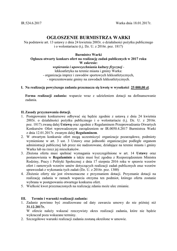 IR.524.6.2017 Warka dnia 18.01.2017r. OGŁOSZENIE BURMISTRZA WARKI Na podstawie art. 13 ustawy z dnia 24 kwietnia 2003r. o działalności pożytku publicznego i o wolontariacie (t.j. Dz. U. z 2016r. poz. 1817) Burmistrz Warki Ogłasza otwarty konkurs ofert na realizację zadań publicznych w 2017 roku W zakresie: wspierania i upowszechniania kultury fizycznej lekkoatletyka na terenie miasta i gminy Warka: - organizacja imprez i zawodów sportowych lekkoatletycznych, - reprezentowanie gminy na zawodach lekkoatletycznych. I. Na realizację powyższego zadania przeznacza się kwotę w wysokości 25 000,00 zł. Forma realizacji zadania: wsparcie wraz z udzieleniem dotacji na dofinansowanie zadania. II. Zasady przyznawania dotacji. 1. Postępowanie konkursowe odbywać się będzie zgodnie z ustawą z dnia 24 kwietnia 2003r. o działalności pożytku publicznego i o wolontariacie (t.j. Dz. U. z 2016r. poz. 1817) zwaną dalej Ustawą oraz zgodnie z Regulaminem Przeprowadzania Otwartych Konkursów Ofert wprowadzonym zarządzeniem nr IR.0050.4.2017 Burmistrza Warki z dnia 12.01.2017r. zwanym dalej Regulaminem. 2. W otwartym konkursie ofert mogą uczestniczyć organizacje pozarządowe, podmioty wymienione w art. 3 ust. 3 Ustawy oraz jednostki organizacyjne podległe organom administracji publicznej lub przez nie nadzorowane, działające na terenie miasta i gminy Warka lub na rzecz jej mieszkańców. 3. Złożona oferta musi spełniać wymagania wyszczególnione w art. 14 Ustawy oraz postanowienia w Regulaminie a także musi być zgodna z Rozporządzeniem Ministra Rodziny, Pracy i Polityki Społecznej z dnia 17 sierpnia 2016 roku w sprawie wzorów ofert i ramowych wzorów umów dotyczących realizacji zadań publicznych oraz wzorów sprawozdań z wykonania tych zadań (Dz. U. z 2016r. poz. 1300) 4. Złożenie oferty nie jest równoznaczne z przyznaniem dotacji. Przyznanie dotacji na realizację zadania w ramach wsparcia otrzyma ten podmiot, którego oferta zostanie wybrana w postępowaniu otwartego konkursu ofert. 5. Wielkość kwot przeznaczonych na realizację zdania może ulec zmianie. III. Termin i warunki realizacji zadania: 1. Zadanie powinno być zrealizowane od daty zawarcia umowy do nie później niż 31.12.2017r. W ofercie należy wskazać rzeczywisty okres realizacji zadania, które nie będzie wykraczał poza wskazane terminy. 2. Szczegółowe warunki realizacji zadania zostaną określone w umowie. IV. Termin składania ofert: 1. Oferty należy składać lub przesłać drogą pocztową do Urzędu Miejskiego w Warce Pl. St. Czarnieckiego 1, 05-660 Warka, w BIURZE OBSŁUGI INTERESANTA do dnia 08.02.2017r. Wymagany termin związania z ofertą – do 31.12.2017r. 2. Ofertę (wzór wg załącznika nr 1) wraz z wymaganymi załącznikami należy składać w formie pisemnej pod rygorem nieważności. 3. Wszystkie pozycje formularza oferty muszą zostać wypełnione. W przypadku, gdy dana pozycja oferty nie odnosi się do oferty lub zadania, należy wpisać np. „nie dotyczy”. 4. Zaleca się umieszczenie oferty w zamkniętej kopercie z adnotacją: „Konkurs na realizację zadania publicznego nr IR.524.6.2017 pod nazwą: Wspieranie i upowszechnianie kultury fizycznej: lekkoatletyka na terenie miasta i gminy Warka” 5. Oferty, które zostaną złożone po tym terminie (niezależnie od stempla pocztowego) nie będą brane pod uwagę w konkursie i zostaną zwrócone oferentowi. 6. Odpowiedzialność za dostarczenie oferty w terminie spoczywa na podmiocie składającym ofertę i żadne wyjaśnienia dotyczące opóźnień nie będą brane pod uwagę. 7. Do oferty należy dołączyć: kopię aktualnego odpisu z Krajowego Rejestru Sądowego lub innego Rejestru lub ewidencji; kopię aktualnego statutu stowarzyszenia lub organizacji. 8. Wszystkie dokumenty i oświadczenia dołączone do oferty należy składać w formie podpisanego oryginału lub kopii poświadczonej za zgodność z oryginałem na każdej stronie. Dokumenty muszą być podpisane przez osoby upoważnione do składania oświadczeń woli ze strony organizacji. Podpisy osób upoważnionych muszą być zgodne ze statutem lub innym dokumentem określającym sposób reprezentacji oferenta i składania oświadczeń woli w imieniu oferenta. Uwaga: podmioty ubiegające się o dotację na zadanie publiczne, które realizowały zadania dotowane przez Gminę Warka w roku 2016 będą mogły otrzymać dotację, dopiero po przyjęciu sprawozdania za 2016 rok. 9. Formularz oferty dostępny jest na stronie internetowej Urzędu Miejskiego w Warce pod adresem www.warka.pl/oko Dodatkowych informacji udzielają osoby: Magdalena Lewandowska, tel. (048) 665 12 68, fax (048) 665 12 25 V. Termin, tryb i kryteria stosowane przy dokonywaniu wyboru oferty 1. Oferty będą rozpatrywane przez Komisję Konkursową powołaną przez Burmistrza Warki. 2. Rozstrzygnięcie konkursu nastąpi w terminie nie przekraczającym 30 dni od dnia upływu terminu składania ofert. Termin ten może być przedłużony jedynie w przypadkach związanych z uzupełnieniem złożonej oferty o dodatkowe 30 dni. 3. Kryteria stosowane przy dokonywaniu wyboru oferty: Wybór oferty będzie się odbywał w dwóch etapach: I etap – wymogi formalne, II etap – wymogi merytoryczne. Przy rozpatrywaniu ofert dotyczących realizacji zadania uwzględnia się: I etap – wymogi formalne: 1) Czy oferta została złożona w wymaganym w ogłoszeniu terminie? 2) Czy oferta została złożona przez podmiot uprawniony? 3) Czy oferta została sporządzona na właściwym formularzu? 4) Czy projekt jest zgodny z tematyką konkursu? 5) Czy dołączono wszystkie wymagane załączniki? 6) Czy wszystkie rubryki zawarte w formularzu oferty zostały wypełnione? 7) Czy oferta została podpisana przez osoby do tego uprawnione? 8) Czy proponowane zadanie zawarte w ofercie jest realizowane na rzecz Gminy Warka lub jej mieszkańców? Na wszystkie powyższe pytania wymagane będą odpowiedzi na tak. W razie choć je