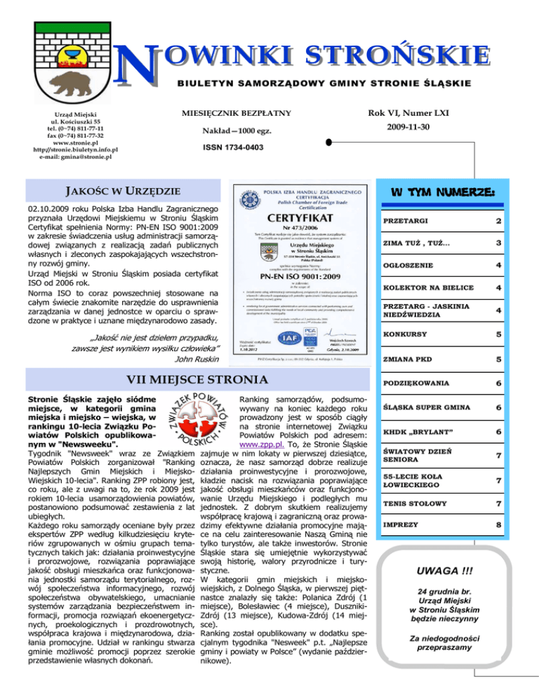 N OWINKI OWINKI STROŃSKIE STROŃSKIE BIULETYN SAMORZĄDOWY GMINY STRONIE ŚLĄSKIE Urząd Miejski ul. Kościuszki 55 tel. (0~74) 811-77-11 fax (0~74) 811-77-32 www.stronie.pl http://stronie.biuletyn.info.pl e-mail: [email protected] MIESIĘCZNIK BEZPŁATNY Rok VI, Numer LXI Nakład—1000 egz. 2009-11-30 ISSN 1734-0403 W TYM NUMERZE: JAKOŚC W URZĘDZIE 02.10.2009 roku Polska Izba Handlu Zagranicznego przyznała Urzędowi Miejskiemu w Stroniu Śląskim Certyfikat spełnienia Normy: PN-EN ISO 9001:2009 w zakresie świadczenia usług administracji samorządowej związanych z realizacją zadań publicznych własnych i zleconych zaspokajających wszechstronny rozwój gminy. Urząd Miejski w Stroniu Śląskim posiada certyfikat ISO od 2006 rok. Norma ISO to coraz powszechniej stosowane na całym świecie znakomite narzędzie do usprawnienia zarządzania w danej jednostce w oparciu o sprawdzone w praktyce i uznane międzynarodowo zasady. „Jakość nie jest dziełem przypadku, zawsze jest wynikiem wysiłku człowieka” John Ruskin VII MIEJSCE STRONIA Stronie Śląskie zajęło siódme miejsce, w kategorii gmina miejska i miejsko – wiejska, w rankingu 10-lecia Związku Powiatów Polskich opublikowanym w "Newsweeku". Tygodnik "Newsweek" wraz ze Związkiem Powiatów Polskich zorganizował "Ranking Najlepszych Gmin Miejskich i MiejskoWiejskich 10-lecia". Ranking ZPP robiony jest, co roku, ale z uwagi na to, Ŝe rok 2009 jest rokiem 10-lecia usamorządowienia powiatów, postanowiono podsumować zestawienia z lat ubiegłych. KaŜdego roku samorządy oceniane były przez ekspertów ZPP według kilkudziesięciu kryteriów zgrupowanych w ośmiu grupach tematycznych takich jak: działania proinwestycyjne i prorozwojowe, rozwiązania poprawiające jakość obsługi mieszkańca oraz funkcjonowania jednostki samorządu terytorialnego, rozwój społeczeństwa informacyjnego, rozwój społeczeństwa obywatelskiego, umacnianie systemów zarządzania bezpieczeństwem informacji, promocja rozwiązań ekoenergetycznych, proekologicznych i prozdrowotnych, współpraca krajowa i międzynarodowa, działania promocyjne. Udział w rankingu stwarza gminie moŜliwość promocji poprzez szerokie przedstawienie własnych dokonań. Ranking samorządów, podsumowywany na koniec kaŜdego roku prowadzony jest w sposób ciągły na stronie internetowej Związku Powiatów Polskich pod adresem: www.zpp.pl. To, Ŝe Stronie Śląskie zajmuje w nim lokaty w pierwszej dziesiątce, oznacza, Ŝe nasz samorząd dobrze realizuje działania proinwestycyjne i prorozwojowe, kładzie nacisk na rozwiązania poprawiające jakość obsługi mieszkańców oraz funkcjonowanie Urzędu Miejskiego i podległych mu jednostek. Z dobrym skutkiem realizujemy współpracę krajową i zagraniczną oraz prowadzimy efektywne działania promocyjne mające na celu zainteresowanie Naszą Gminą nie tylko turystów, ale takŜe inwestorów. Stronie Śląskie stara się umiejętnie wykorzystywać swoją historię, walory przyrodnicze i turystyczne. W kategorii gmin miejskich i miejskowiejskich, z Dolnego Śląska, w pierwszej piętnastce znalazły się takŜe: Polanica Zdrój (1 miejsce), Bolesławiec (4 miejsce), DusznikiZdrój (13 miejsce), Kudowa-Zdrój (14 miejsce). Ranking został opublikowany w dodatku specjalnym tygodnika "Nesweek" p.t. „Najlepsze gminy i powiaty w Polsce” (wydanie październikowe). PRZETARGI 2 ZIMA TUś , TUś… 3 OGŁOSZENIE 4 KOLEKTOR NA BIELICE 4 PRZETARG - JASKINIA NIEDŹWIEDZIA 4 KONKURSY 5 ZMIANA PKD 5 PODZIĘKOWANIA 6 ŚLĄSKA SUPER GMINA 6 KHDK „BRYLANT” 6 ŚWIATOWY DZIEŃ SENIORA 7 55-LECIE KOŁA ŁOWIECKIEGO 7 TENIS STOŁOWY 7 IMPREZY 8 UWAGA !!! 24 grudnia br. Urząd Miejski w Stroniu Śląskim będzie nieczynny Za niedogodności przepraszamy ROK VI, NUMER LXI STR. 2 PRZETARGI Burmistrz Stronia Śląskiego ogłasza pierwszy przetarg ustny nieograniczony na sprzedaŜ n/w nieruchomości, stanowiących własność Gminy Stronie Śląskie: PołoŜenie Strachocin Nr i pow. działki w m2 43 3 673m2 Stary Gierałtów 211/1 2084m2 Strachocin 35/4 2400m 2 Stary Gierałtów 352/5 2000m 2 Stary Gierałtów 352/6 2000m 2 Stary Gierałtów 352/7 2000 m 2 Stary Gierałtów 352/8 2017 m 2 Stronie Śląskie wieś 139 6140 m 2 Stary Gierałtów 316/1 7101m2 Stary Gierałtów 160/12 1958m2 Strachocin 44/4 2774m 2 Stronie Śląskie ul. Polna Stronie Śląskie ul. Polna Stronie Śląskie . ul. Polna Stronie Śląskie ul. Polna . Stronie Śląskie ul. Mickiewicza 5/6 2020m2 5/7 1563m2 5/8 2009m 2 5/10 2115m 2 240/3 1473m 2 Opis nieruchomości Niezabudowana nieruchomość . Przez teren działki przebiega napowietrzna linia energetyczna. Istnieje moŜliwość podłączenia do instalacji wodociągowej, kanalizacyjnej i gazowej . Niezabudowana nieruchomość . Działka nie jest wyposaŜona w Ŝadne urządzenia infrastruktury technicznej. Istnieje moŜliwość podłączenia energii elektrycznej z napowietrznej linii energetycznej. Dostęp komunikacyjny –bezpośrednio z głównej drogi asfaltowej. Niezabudowana nieruchomość . Przez teren działki przebiega linia energetyczna niskiego napięcia nie utrudniająca zabudowę. Nieruchomość niezabudowana . Uzbrojenie- brak, istnieje moŜliwość doprowadzenia energii elektrycznej z sąsiednich działek. Nieruchomość niezabudowana . Uzbrojenie- brak, istnieje moŜliwość doprowadzenia energii elektrycznej z sąsiednich działek. Nieruchomość niezabudowana . Uzbrojeniebrak, istnieje moŜliwość doprowadzenia energii elektrycznej z sąsiednich działek. Nieruchomość niezabudowana . Uzbrojeniebrak, istnieje moŜliwość doprowadzenia energii elektrycznej z sąsiednich działek. Nieruchomość niezabudowana. Przez teren działki przebiega napowietrzna linia telefoniczna nie utrudniająca zabudowę. Istnieje moŜliwość podłączenia do linii energetycznej niskiego napięcia. Nieruchomość nie zabudowana. Przez teren działki przebiega linia energetyczna niskiego napięcia. Nieruchomo