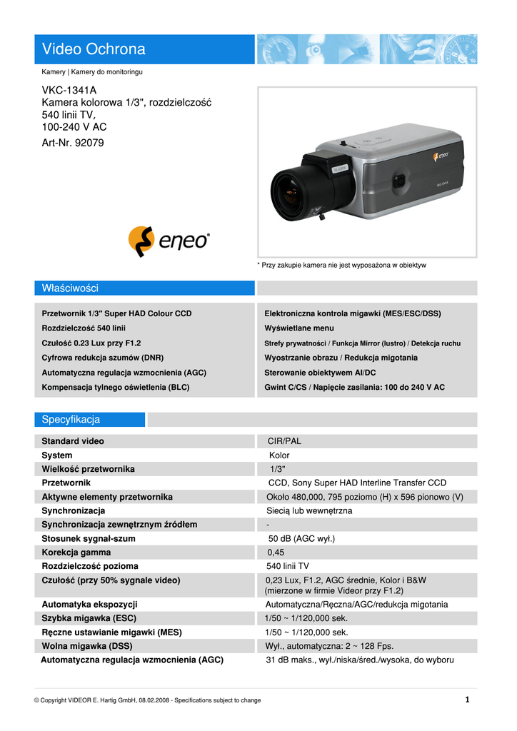 Video Ochrona Kamery | Kamery do monitoringu VKC-1341A Kamera kolorowa 1/3", rozdzielczoœæ 540 linii TV, 100-240 V AC Art-Nr. 92079 * Przy zakupie kamera nie jest wyposa¿ona w obiektyw W³aœciwoœci Przetwornik 1/3" Super HAD Colour CCD Elektroniczna kontrola migawki (MES/ESC/DSS) Rozdzielczoœæ 540 linii Wyœwietlane menu Czu³oœæ 0.23 Lux przy F1.2 Strefy prywatnoœci / Funkcja Mirror (lustro) / Detekcja ruchu Cyfrowa redukcja szumów (DNR) Wyostrzanie obrazu / Redukcja migotania Automatyczna regulacja wzmocnienia (AGC) Sterowanie obiektywem AI/DC Kompensacja tylnego oœwietlenia (BLC) Gwint C/CS / Napiêcie zasilania: 100 do 240 V AC Specyfikacja Standard video CIR/PAL System Kolor Wielkoœæ przetwornika 1/3" Przetwornik CCD, Sony Super HAD Interline Transfer CCD Aktywne elementy przetwornika Oko³o 480,000, 795 poziomo (H) x 596 pionowo (V) Synchronizacja Sieci¹ lub wewnêtrzna Synchronizacja zewnêtrznym Ÿród³em - Stosunek sygna³-szum 50 dB (AGC wy³.) Korekcja gamma 0,45 Rozdzielczoœæ pozioma 540 linii TV Czu³oœæ (przy 50% sygnale video) 0,23 Lux, F1.2, AGC œrednie, Kolor i B&W (mierzone w firmie Videor przy F1.2) Automatyka ekspozycji Automatyczna/Rêczna/AGC/redukcja migotania Szybka migawka (ESC) 1/50 ~ 1/120,000 sek. Rêczne ustawianie migawki (MES) 1/50 ~ 1/120,000 sek. Wolna migawka (DSS) Wy³., automatyczna: 2 ~ 128 Fps. Automatyczna regulacja wzmocnienia (AGC) 31 dB maks., wy³./niska/œred./wysoka, do wyboru © Copyright VIDEOR E. Hartig GmbH, 08.02.2008 - Specifications subject to change 1 VKC-1341A (Specyfikacja c.d.) Balans bieli Automatyczny (AWB/ATW): 1800K ~ 10500K Rêczny: R-gain, B-gain, Korekcja przys³ony (APC) Pozioma i pionowa Funkcja redukcji migotania 1/120 sek. prze³¹czana w³./wy³. Filtr podczerwieni Nie Prze³¹czanie trybu pracy kolor/b&w Przez menu Strefy prywatnoœci W³./wy³. (prze³¹czane) Wyœwietlanie funkcji OSD Kolor/B&W, AGC, DNR, Mirror (poziomo), BLC, balans bieli, przes³ona AI/DC, ostroœæ, ESC/MES, prêdkoœæ migawki, migotanie, strefy prywatnoœci w³./wy³., ID kamery, domyœlne/preset Kompensacja tylnego oœwietlenia BLC, wy³./niska/œred./wysoka prze³¹czana Wyœwietlanie tekstu Nazwa kamery, w³./wy³. (prze³¹czane) Funkcja detekcji ruchu 4 obszary, prze³¹czana w³./wy³. Korekcja ostroœci 0 ~ 31, prze³¹czana w³./wy³. Monta¿ obiektywu Gwint typu C/CS Sterowanie przys³on¹ Rêczne, automatyczna przes³ona/kontrola napiêciem DC Numer ID kamery Przez wyœwietlanie tekstu Regulacja zewnêtrzna Menu, kursor góra/dó³/lewo/prawo, ogniskowa od podstawy obiektywu Wyjœcie video (typ) CVBS Wyjœcie video 1Vp-p, composite, 75 ohmów, BNC Po³¹czenia zewnêtrzne Video (BNC), Auto-przes³ona/kontrola napiêciem DC, zasilanie Port szeregowy Nie Monta¿ kamery Gwint 1/4" - 20 UNC na górnej oraz dolnej czêœci obudowy Napiêcie zasilania 230 V AC, (100 ~ 240 V AC) 50/60 Hz Pobór mocy 4,5 wat Zakres temperatury pracy -10 stopni C ~ +50 stopni C Wymiary (wys. x szer. x g³êb.) Patrz rysunek w za³¹czeniu Kolor Obudowa: Pantone 877C, Boki: Pantone Cool Gray 11C Waga Oko³o. 310 g Wyposa¿enie Kamera, Pierœcieñ C/CS, Instrukcja Accessories © Copyright VIDEOR E. Hartig GmbH, 08.02.2008 - Specifications subject to change 2 VKC-1341A Oficjalny Dystrybutor w Polsce ® Nowe Systemy i Technologie NSyTech Sp. z o.o. 00-367 Warszawa Ul.Kopernika 3 Tel: (22) 8287907 8287908 Fax: (22) 8287909 http://www.nsytech.pl e-mail: [email protected] © Copyright VIDEOR E. Hartig GmbH, 08.02.2008 - Specifications subject to change 3