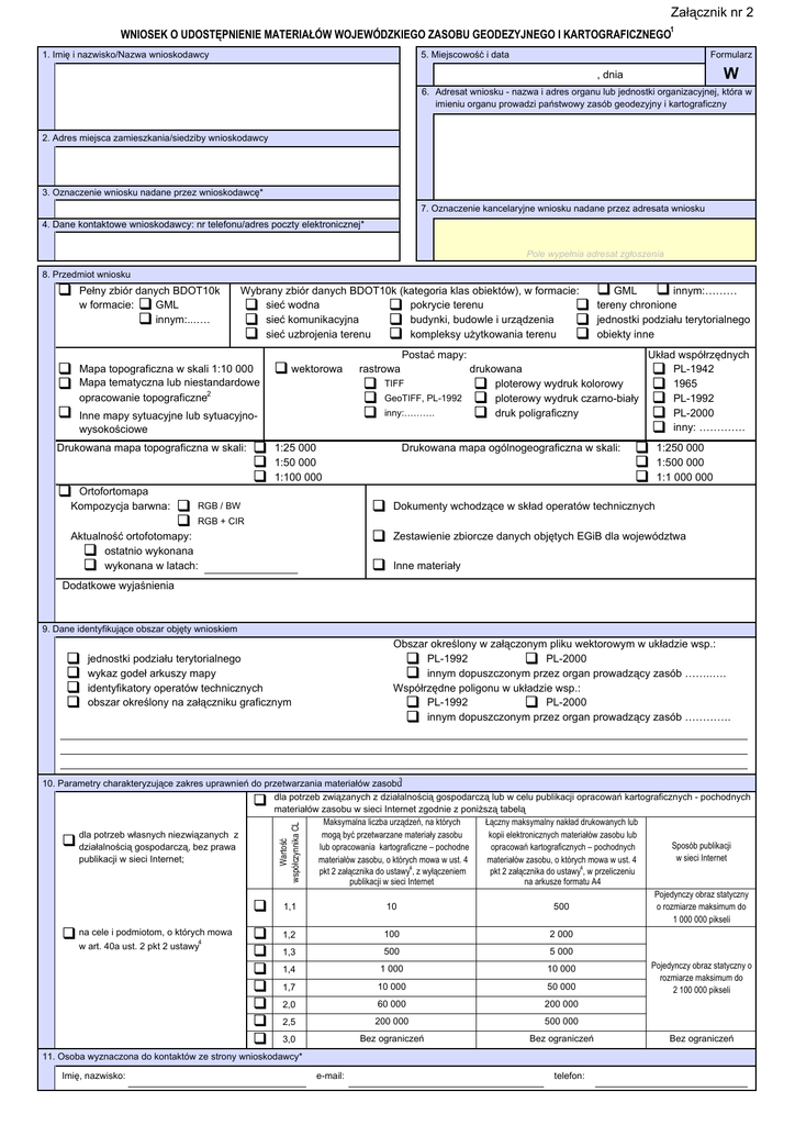 Załącznik nr 2 1 WNIOSEK O UDOSTĘPNIENIE MATERIAŁÓW WOJEWÓDZKIEGO ZASOBU GEODEZYJNEGO I KARTOGRAFICZNEGO 1. Imię i nazwisko/Nazwa wnioskodawcy 5. Miejscowość i data Formularz W , dnia 6. Adresat wniosku - nazwa i adres organu lub jednostki organizacyjnej, która w imieniu organu prowadzi państwowy zasób geodezyjny i kartograficzny 2. Adres miejsca zamieszkania/siedziby wnioskodawcy 3. Oznaczenie wniosku nadane przez wnioskodawcę* 7. Oznaczenie kancelaryjne wniosku nadane przez adresata wniosku 4. Dane kontaktowe wnioskodawcy: nr telefonu/adres poczty elektronicznej* Pole wypełnia adresat zgłoszenia 8. Przedmiot wniosku Wybrany zbiór danych BDOT10k (kategoria klas obiektów), w formacie: GML innym:……… sieć wodna pokrycie terenu tereny chronione sieć komunikacyjna budynki, budowle i urządzenia jednostki podziału terytorialnego sieć uzbrojenia terenu kompleksy użytkowania terenu obiekty inne Pełny zbiór danych BDOT10k w formacie: GML innym:...…. Mapa topograficzna w skali 1:10 000 Mapa tematyczna lub niestandardowe opracowanie topograficzne2 wektorowa Inne mapy sytuacyjne lub sytuacyjnowysokościowe Drukowana mapa topograficzna w skali: Ortofortomapa Kompozycja barwna: Postać mapy: rastrowa drukowana TIFF ploterowy wydruk kolorowy GeoTIFF, PL-1992 ploterowy wydruk czarno-biały inny:………. druk poligraficzny 1:25 000 1:50 000 1:100 000 RGB / BW Drukowana mapa ogólnogeograficzna w skali: Układ współrzędnych PL-1942 1965. PL-1992 PL-2000 inny: …………. 1:250 000 1:500 000 1:1 000 000 Dokumenty wchodzące w skład operatów technicznych Zestawienie zbiorcze danych objętych EGiB dla województwa Inne materiały RGB + CIR Aktualność ortofotomapy: ostatnio wykonana wykonana w latach: Dodatkowe wyjaśnienia 9. Dane identyfikujące obszar objęty wnioskiem Obszar określony w załączonym pliku wektorowym w układzie wsp.: PL-1992 PL-2000 innym dopuszczonym przez organ prowadzący zasób ……..…. Współrzędne poligonu w układzie wsp.: PL-1992 PL-2000 innym dopuszczonym przez organ prowadzący zasób …………. jednostki podziału terytorialnego wykaz godeł arkuszy mapy identyfikatory operatów technicznych obszar określony na załączniku graficznym 10. Parametry charakteryzujące zakres uprawnień do przetwarzania materiałów zasobu3 dla potrzeb związanych z działalnością gospodarczą lub w celu publikacji opracowań kartograficznych - pochodnych materiałów zasobu w sieci Internet zgodnie z poniższą tabelą Maksymalna liczba urządzeń, na których Łączny maksymalny nakład drukowanych lub kopii elektronicznych materiałów zasobu lub mogą być przetwarzane materiały zasobu dla potrzeb własnych niezwiązanych z Sposób publikacji działalnością gospodarczą, bez prawa lub opracowania kartograficzne – pochodne opracowań kartograficznych – pochodnych w sieci Internet publikacji w sieci Internet; materiałów zasobu, o których mowa w ust. 4 materiałów zasobu, o których mowa w ust. 4 pkt 2 załącznika do ustawy4, z wyłączeniem pkt 2 załącznika do ustawy4, w przeliczeniu publikacji w sieci Internet na arkusze formatu A4 Pojedynczy obraz statyczny 1,1 10 500 o rozmiarze maksimum do 1 000 000 pikseli na cele i podmiotom, o których mowa 100 2 000 1,2 w art. 40a ust. 2 pkt 2 ustawy4 500 5 000 1,3 Wartość współczynnika CL 1,4 1 000 10 000 1,7 10 000 50 000 2,0 60 000 200 000 2,5 200 000 500 000 3,0 Bez ograniczeń Bez ograniczeń 11. Osoba wyznaczona do kontaktów ze strony wnioskodawcy* Imię, nazwisko: e-mail: telefon: Pojedynczy obraz statyczny o rozmiarze maksimum do 2 100 000 pikseli Bez ograniczeń 12. Forma przekazania i sposób odbioru materiałów postać nieelektroniczna Sposób udostępnienia: postać elektroniczna serwer FTP / e-mail odbiór osobisty wysyłka na adres: płyta CD/DVD nośnik zewnętrzny wnioskodawcy jak w nagłówku e-mail: inny usługa sieciowa udostępniania 5 4 usługa , o której mowa w ust. 20 załącznika do ustawy : 6 miesięcy 3 miesiące 1 rok serwer FTP: 13. Dodatkowe wyjaśnienia i uwagi wnioskodawcy WNIOSKODAWCA Imię, nazwisko oraz podpis wnioskodawcy 6 Przypisy: 1. 2. 3. 4. 5. Informacje o aktualnie dostępnych materiałach wojewódzkiego zasobu geodezyjnego i kartograficznego udostępnia organ prowadzący ten zasób. Uszczegółowienie wniosku o udostępnienie map specjalnych lub niestandardowych opracowań topograficznych zawiera formularz W1. Dopuszczalne jest wskazanie tylko jednego celu. Ustawa z dnia 17 maja 1989 r. Prawo geodezyjne i kartograficzne (Dz. U. z 2010 r., Nr 193, poz. 1287, z późn. zm.). Udostępnienie w formie okresowej usługi sieciowej ma zastosowanie w przypadku udostępniania ortofotomapy lub opracowań kartograficznych, tworzonych na podstawie odpowiednich baz danych, o których mowa w art. 4 ust. 1a pkt 1-3, 7, 8, 10, 11 lub ust. 1b ustawy - Prawo geodezyjne i kartograficzne. 6. Podpis odręczny, podpis elektroniczny, o którym mowa w art. 3 pkt 1 ustawy z dnia 18 września 2001 r. o podpisie elektronicznym, bezpieczny podpis elektroniczny, o którym mowa w art. 3 pkt 2 ustawy z dnia 18 września 2001 r. o podpisie elektronicznym, podpis potwierdzony profilem zaufanym ePUAP, o którym mowa w art. 3 pkt 15 ustawy z dnia 17 lutego 2005 r. o informatyzacji działalności podmiotów realizujących zadania publiczne lub w przypadku składania wniosku za pomocą systemu teleinformatycznego, o którym mowa w przepisach wydanych na podstawie art. 40 ust. 8 ustawy - Prawo geodezyjne i kartograficzne, identyfikator umożliwiający weryfikację wnioskodawcy w tym systemie. * Informacja nieobowiązkowa. Wyjaśnienia: 1. Formularze drukowane nie muszą uwzględniać oznaczeń kolorystycznych. 2. Pola formularza można rozszerzać w zależności od potrzeb. W przypadku wypełniania formularza w postaci papierowej formularz może być uzupełniany załącznikami zawierającymi informacje, których nie uda się zamieścić w formularzu. Formularz 1. Uszczegó
