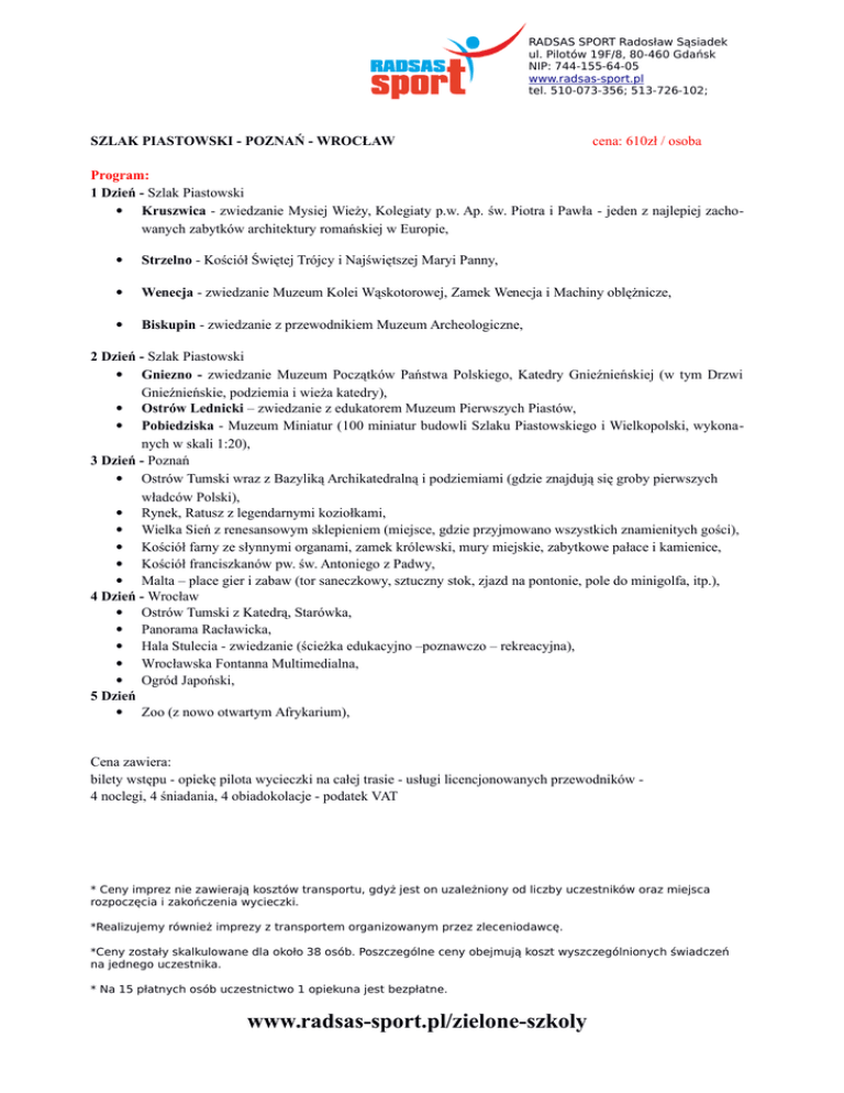 RADSAS SPORT Radosław Sąsiadek ul. Pilotów 19F/8, 80-460 Gdańsk NIP: 744-155-64-05 www.radsas-sport.pl tel. 510-073-356; 513-726-102; SZLAK PIASTOWSKI - POZNAŃ - WROCŁAW cena: 610zł / osoba Program: 1 Dzień - Szlak Piastowski Kruszwica - zwiedzanie Mysiej Wieży, Kolegiaty p.w. Ap. św. Piotra i Pawła - jeden z najlepiej zachowanych zabytków architektury romańskiej w Europie, Strzelno - Kościół Świętej Trójcy i Najświętszej Maryi Panny, Wenecja - zwiedzanie Muzeum Kolei Wąskotorowej, Zamek Wenecja i Machiny oblężnicze, Biskupin - zwiedzanie z przewodnikiem Muzeum Archeologiczne, 2 Dzień - Szlak Piastowski Gniezno - zwiedzanie Muzeum Początków Państwa Polskiego, Katedry Gnieźnieńskiej (w tym Drzwi Gnieźnieńskie, podziemia i wieża katedry), Ostrów Lednicki – zwiedzanie z edukatorem Muzeum Pierwszych Piastów, Pobiedziska - Muzeum Miniatur (100 miniatur budowli Szlaku Piastowskiego i Wielkopolski, wykonanych w skali 1:20), 3 Dzień - Poznań Ostrów Tumski wraz z Bazyliką Archikatedralną i podziemiami (gdzie znajdują się groby pierwszych władców Polski), Rynek, Ratusz z legendarnymi koziołkami, Wielka Sień z renesansowym sklepieniem (miejsce, gdzie przyjmowano wszystkich znamienitych gości), Kościół farny ze słynnymi organami, zamek królewski, mury miejskie, zabytkowe pałace i kamienice, Kościół franciszkanów pw. św. Antoniego z Padwy, Malta – place gier i zabaw (tor saneczkowy, sztuczny stok, zjazd na pontonie, pole do minigolfa, itp.), 4 Dzień - Wrocław Ostrów Tumski z Katedrą, Starówka, Panorama Racławicka, Hala Stulecia - zwiedzanie (ścieżka edukacyjno –poznawczo – rekreacyjna), Wrocławska Fontanna Multimedialna, Ogród Japoński, 5 Dzień Zoo (z nowo otwartym Afrykarium), Cena zawiera: bilety wstępu - opiekę pilota wycieczki na całej trasie - usługi licencjonowanych przewodników 4 noclegi, 4 śniadania, 4 obiadokolacje - podatek VAT * Ceny imprez nie zawierają kosztów transportu, gdyż jest on uzależniony od liczby uczestników oraz miejsca rozpoczęcia i zakończenia wycieczki. *Realizujemy również imprezy z transportem organizowanym przez zleceniodawcę. *Ceny zostały skalkulowane dla około 38 osób. Poszczególne ceny obejmują koszt wyszczególnionych świadczeń na jednego uczestnika. * Na 15 płatnych osób uczestnictwo 1 opiekuna jest bezpłatne. www.radsas-sport.pl/zielone-szkoly