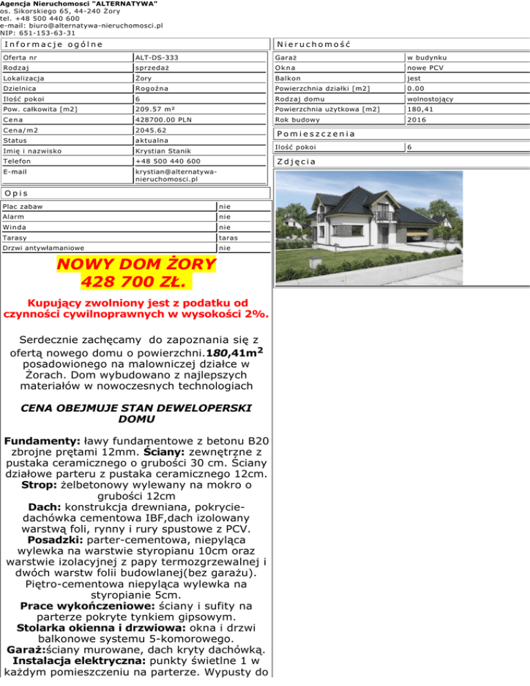 Agencja Nieruchomosci "ALTERNATYWA" os. Sikorskiego 65, 44-240 Żory tel. +48 500 440 600 e-mail: [email protected] NIP: 651-153-63-31 Informacje ogólne Nieruchomość Oferta nr ALT-DS-333 Garaż w budynku Rodzaj sprzedaż Okna nowe PCV Lokalizacja Żory Balkon jest Dzielnica Rogoźna Powierzchnia działki [m2] 0.00 Ilość pokoi 6 Rodzaj domu wolnostojący Pow. całkowita [m2] 209.57 m² Powierzchnia użytkowa [m2] 180,41 Cena 428700.00 PLN Rok budowy 2016 Cena/m2 2045.62 Status aktualna Imię i nazwisko Krystian Stanik Telefon +48 500 440 600 E-mail [email protected] Pomieszczenia Ilość pokoi Zdjęcia Opis Plac zabaw nie Alarm nie Winda nie Tarasy taras Drzwi antywłamaniowe nie NOWY DOM ŻORY 428 700 ZŁ. Kupujący zwolniony jest z podatku od czynności cywilnoprawnych w wysokości 2%. Serdecznie zachęcamy do zapoznania się z ofertą nowego domu o powierzchni.180,41m2 posadowionego na malowniczej działce w Żorach. Dom wybudowano z najlepszych materiałów w nowoczesnych technologiach CENA OBEJMUJE STAN DEWELOPERSKI DOMU Fundamenty: ławy fundamentowe z betonu B20 zbrojne prętami 12mm. Ściany: zewnętrzne z pustaka ceramicznego o grubości 30 cm. Ściany działowe parteru z pustaka ceramicznego 12cm. Strop: żelbetonowy wylewany na mokro o grubości 12cm Dach: konstrukcja drewniana, pokryciedachówka cementowa IBF,dach izolowany warstwą foli, rynny i rury spustowe z PCV. Posadzki: parter-cementowa, niepyląca wylewka na warstwie styropianu 10cm oraz warstwie izolacyjnej z papy termozgrzewalnej i dwóch warstw folii budowlanej(bez garażu). Piętro-cementowa niepyląca wylewka na styropianie 5cm. Prace wykończeniowe: ściany i sufity na parterze pokryte tynkiem gipsowym. Stolarka okienna i drzwiowa: okna i drzwi balkonowe systemu 5-komorowego. Garaż:ściany murowane, dach kryty dachówką. Instalacja elektryczna: punkty świetlne 1 w każdym pomieszczeniu na parterze. Wypusty do 6 gniazdek po 2 w każdym pomieszczeniu na parterze. Opłatę za przyłączenie do sieci ponosi sprzedający, przyłącze wykonuje dostawca energii. Cena nie obejmuje montażu osprzętu elektrycznego. Instalacja sanitarna: kanalizacja-rury PCV w budynku. Woda-rury PP(FV plast), przyłącze do miejskiej sieci wodociągowej, opłaca sprzedający. Cena nie obejmuje białego montażu. Instalacja CO: rury PP z włóknem szklanym. Instalacja gazowa: wewnętrzna instalacja gazowa do pieca CO oraz zewnętrzne przyłącze do sieci gazowej, które wykonuje dostawca gazu. Umowę o włączenie do sieci gazowej zawiera Kupujący. Opłatę za włączenie do sieci ponosi sprzedający. Rozkład pomieszczeń: Parter: komunikacja,łazienka,pokój, kuchnia,salon, schowek, pomieszczenie gospodarcze, garaż. Piętro: komunikacja, 4 pokoje, łazienka Zapraszamy na prezentację. Zapewniamy Państwu przeprowadzenie transakcji od momentu prezentacji do chwili przekazania nieruchomości, oraz pomoc w uzyskaniu najdogodniejszego kredytu hipotecznego. Zapraszamy do odwiedzin naszej strony. www.alternatywa-nieruchomosci.pl Kontakt: Krystian Stanik tel. 500 440 600 [email protected] ( licencja zawodowa nr 21811 ) Nieruchomości "Alternatywa" Os. Sikorskiego 65 ( za sklepem meble Bodzio ) 44-240 Żory www.alternatywa-nieruchomosci.pl Agencja Nieruchomosci "ALTERNATYWA" os. Sikorskiego 65, 44-240 Żory tel. +48 500 440 600 e-mail: [email protected] NIP: 651-153-63-31