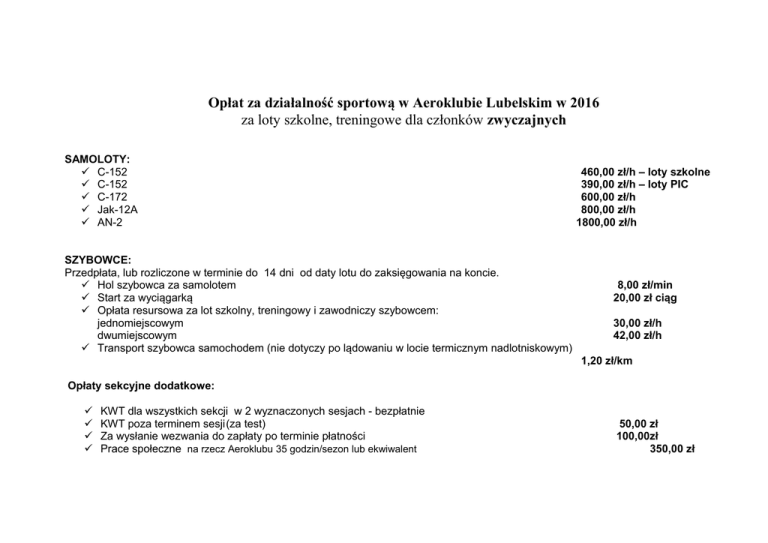 Opłat za działalność sportową w Aeroklubie Lubelskim w 2016 za loty szkolne, treningowe dla członków zwyczajnych SAMOLOTY: C-152 C-152 C-172 Jak-12A AN-2 SZYBOWCE: Przedpłata, lub rozliczone w terminie do 14 dni od daty lotu do zaksięgowania na koncie. Hol szybowca za samolotem Start za wyciągarką Opłata resursowa za lot szkolny, treningowy i zawodniczy szybowcem: jednomiejscowym dwumiejscowym Transport szybowca samochodem (nie dotyczy po lądowaniu w locie termicznym nadlotniskowym) 460,00 zł/h – loty szkolne 390,00 zł/h – loty PIC 600,00 zł/h 800,00 zł/h 1800,00 zł/h 8,00 zł/min 20,00 zł ciąg 30,00 zł/h 42,00 zł/h 1,20 zł/km Opłaty sekcyjne dodatkowe: KWT dla wszystkich sekcji w 2 wyznaczonych sesjach - bezpłatnie KWT poza terminem sesji(za test) Za wysłanie wezwania do zapłaty po terminie płatności Prace społeczne na rzecz Aeroklubu 35 godzin/sezon lub ekwiwalent 50,00 zł 100,00zł 350,00 zł Opłaty za loty szkolne i treningowe dla członków stowarzyszonych SAMOLOTY: C-152 Jak-12A C-172 AN-2 Teoretyczny kurs samolotowy PPL(A) (bezpłatny w przypadku szkolenia praktycznego w Aeroklubie Lubelskim) Praktyczny kurs samolotowy PPL(A) SZYBOWCE: Szkolenie podstawowe za wyciągarką Hol za samolotem (nie dotyczy szkolenia podstawowego) Start za wyciagarką (nie dotyczy szkolenia podstawowego) Opłata resursowa za lot szkolny, treningowy i zawodniczy szybowcem: jednomiejscowym dwumiejscowym BALONY: Szkolenie teoretyczne Szkolenie praktyczne - za wydanie zaświadczenia o ukończeniu szkolenia praktycznego 540,00 zł/h (9,00 zł/min) 1 000,00 zł/h(16,70 zł/min) 800,00 zł/h(13,33 zł/min) 2 500,00 zł/h(41,66zł/min) 1 800,00 zł 20 700,00 zł (45h lotów) 3 500,00 zł 12,00 zł/min 25,00 zł/ ciąg 90,00 zł/h 100,00 zł/h 950,00 zł 1000,00 zł Opłaty sekcyjne dodatkowe: KWT ( za test) Za wysłanie wezwania do zapłaty po terminie płatności Roczna składka dla członków stowarzyszonych sekcji szybowcowej, samolotowej, balonowej w pierwszym roku (składka zawiera NNW ) Roczna składka sekcja modelarska dla członków stowarzyszonych- młodzież poniżej 16 roku życia(składka zawiera NNW ) 50,00 zł 100,00 zł lotniczego 51,00 zł 63,00 zł Roczna składka sekcyjna dla członków stowarzyszonych w sekcji modelarskiej, samolotowej, szybowcowej, mikrolotowej, balonowej składka zawiera NNW-(nie dotyczy w pierwszym sezonie szkolenia podstawowego) 291,00 zł Zwolnienia z opłat za loty: Decyzją Zarządu Aeroklubu Lubelskiego na podstawie pisemnych podań składanych do Dyrektora Aeroklubu.