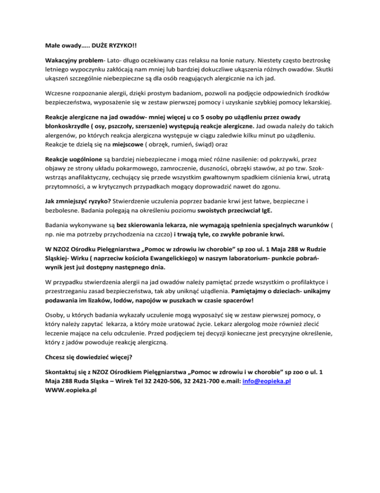 Małe owady….. DUŻE RYZYKO!! Wakacyjny problem- Lato- długo oczekiwany czas relaksu na łonie natury. Niestety często beztroskę letniego wypoczynku zakłócają nam mniej lub bardziej dokuczliwe ukąszenia różnych owadów. Skutki ukąszeo szczególnie niebezpieczne są dla osób reagujących alergicznie na ich jad. Wczesne rozpoznanie alergii, dzięki prostym badaniom, pozwoli na podjęcie odpowiednich środków bezpieczeostwa, wyposażenie się w zestaw pierwszej pomocy i uzyskanie szybkiej pomocy lekarskiej. Reakcje alergiczne na jad owadów- mniej więcej u co 5 osoby po użądleniu przez owady błonkoskrzydłe ( osy, pszczoły, szerszenie) występują reakcje alergiczne. Jad owada należy do takich alergenów, po których reakcja alergiczna występuje w ciągu zaledwie kilku minut po użądleniu. Reakcje te dzielą się na miejscowe ( obrzęk, rumieo, świąd) oraz Reakcje uogólnione są bardziej niebezpieczne i mogą mied różne nasilenie: od pokrzywki, przez objawy ze strony układu pokarmowego, zamroczenie, duszności, obrzęki stawów, aż po tzw. Szokwstrząs anafilaktyczny, cechujący się przede wszystkim gwałtownym spadkiem ciśnienia krwi, utratą przytomności, a w krytycznych przypadkach mogący doprowadzid nawet do zgonu. Jak zmniejszyd ryzyko? Stwierdzenie uczulenia poprzez badanie krwi jest łatwe, bezpieczne i bezbolesne. Badania polegają na określeniu poziomu swoistych przeciwciał IgE. Badania wykonywane są bez skierowania lekarza, nie wymagają spełnienia specjalnych warunków ( np. nie ma potrzeby przychodzenia na czczo) i trwają tyle, co zwykłe pobranie krwi. W NZOZ Ośrodku Pielęgniarstwa „Pomoc w zdrowiu iw chorobie” sp zoo ul. 1 Maja 288 w Rudzie Sląskiej- Wirku ( naprzeciw kościoła Ewangelickiego) w naszym laboratorium- punkcie pobraowynik jest już dostępny następnego dnia. W przypadku stwierdzenia alergii na jad owadów należy pamiętad przede wszystkim o profilaktyce i przestrzeganiu zasad bezpieczeostwa, tak aby uniknąd użądlenia. Pamiętajmy o dzieciach- unikajmy podawania im lizaków, lodów, napojów w puszkach w czasie spacerów! Osoby, u których badania wykazały uczulenie mogą wyposażyd się w zestaw pierwszej pomocy, o który należy zapytad lekarza, a który może uratowad życie. Lekarz alergolog może również zlecid leczenie mające na celu odczulenie. Przed podjęciem tej decyzji konieczne jest precyzyjne określenie, który z jadów powoduje reakcję alergiczną. Chcesz się dowiedzied więcej? Skontaktuj się z NZOZ Ośrodkiem Pielęgniarstwa „Pomoc w zdrowiu i w chorobie” sp zoo o ul. 1 Maja 288 Ruda Sląska – Wirek Tel 32 2420-506, 32 2421-700 e.mail: [email protected] WWW.eopieka.pl