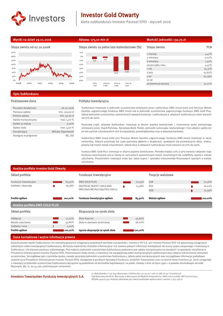 Investor Gold Otwarty Karta subfunduszu Investor Parasol SFIO - styczeń 2016 Wyniki na dzień 29.01.2016 Stopa zwrotu od 07.10.2008 Aktywa: 173,10 mln zł Wartość jednostki: 132,75 zł Stopa zwrotu za pełne lata kalendarzowe (%) Stopa zwrotu 1 miesiąc 3 miesiące 6 miesięcy od początku roku 1 rok 3 lata 5 lat 10 lat od pierwszej wyceny PLN 4,47% -2,02% 1,50% 4,47% -15,31% -31,82% -25,39% 32,72% Opis Subfunduszu Podstawowe dane Polityka inwestycyjna Początek działalności 06.10.2008 Pierwsza wpłata min. 100,00 zł Kolejna wpłata min. 50,00 zł Opłata manipulacyjna max. 5,00 % Opłata za wykup 0,00% Opłata stała Zarządzający max. 4,00 % Mikołaj Stępniewski Dostępny w programie IKE, ISO Subfundusz inwestuje w jednostki uczestnictwa emitowane przez subfundusz DWS Invest Gold and Precious Metals Equities zagranicznego funduszu DWS Invest lub w jednostki uczestnictwa zagranicznego funduszu DWS Gold Plus. Udział jednostek uczestnictwa wymienionych powyżej funduszy i subfunduszy w aktywach Subfunduszu może wynosić od 70% do 100%. Pozostałą część aktywów Subfundusz inwestuje w dłużne papiery wartościowe i instrumenty rynku pieniężnego emitowane przez Skarb Państwa, Narodowy Bank Polski, jednostki samorządu terytorialnego i inne władze publiczne (w tym państw członkowskich Unii Europejskiej), przedsiębiorstwa oraz w depozyty bankowe. Subfundusz DWS Invest Gold and Precious Metals Equities zagranicznego funduszu DWS Invest inwestuje w akcje emitentów, których przychody lub zyski pochodzą głównie z eksploracji, wydobycia lub przetwarzania złota, srebra, platyny lub innych metali szlachetnych. Udział akcji w aktywach subfunduszu może wynosić od 70% do 100%. Fundusz DWS Gold Plus inwestuje w dłużne papiery wartościowe. Ponadto między 20% a 50% wartości aktywów tego funduszu inwestowane jest w lokaty na rachunkach powierniczych metali szlachetnych lub certyfikaty oparte o metale szlachetne. Przedmiotem inwestycji może być także kupno i sprzedaż instrumentów finansowych opartych o metale szlachetne. Analiza portfela Investor Gold Otwarty Skład portfela Fundusze inwestycyjne Pozycje walutowe Fundusze inwestycyjne 83,92% DWS GOLD PLUS 70,54% EUR 70,58% Gotówka i depozyty 16,08% DEUTSCHE INVEST I GOLD AND PRECIOUS METALS EQUITIES USD LC 13,38% PLN 16,03% USD 13,39% Fundusze inwestycyjne ogółem 83,92% Portfel ogółem 100,00% Waluta ogółem 100,00% Analiza portfela DWS GOLD PLUS Skład portfela Ekspozycja na rynek złota Obligacje 51,20% Złoto fizyczne 43,80% Metale szlachetne 43,80% Złoto w dostawie terminowej 56,20% Gotówka i inne 5,00% Portfel ogółem 100,00% Łączna ekspozycja na rynek złota 100,00% Dane kontaktowe i ważne informacje prawne Dotychczasowe wyniki Subfunduszu nie stanowią gwarancji osiągnięcia podobnych wyników w przyszłości. Investors TFI S.A. ani Investor Parasol SFIO nie gwarantują osiągnięcia założonych celów inwestycyjnych Subfunduszu. Niniejszy materiał ma charakter informacyjny i nie zawiera pełnych informacji niezbędnych do oceny ryzyka związanego z inwestycją w Subfundusz i nie stanowi przekazu reklamowego. Przy nabyciu jednostek uczestnictwa Subfunduszu pobierana jest opłata manipulacyjna na zasadach i w wysokości określonej w Prospekcie Informacyjnym Investor Parasol SFIO. Prezentowane stopy zwrotu z inwestycji nie uwzględniają opłat manipulacyjnych pobieranych przy nabyciu lub konwersji jednostek uczestnictwa. Szczegółowy opis czynników ryzyka, zasady sprzedaży jednostek uczestnictwa Subfunduszu, tabela opłat manipulacyjnych oraz szczegółowe informacje podatkowe zawarte są w Prospekcie Informacyjnym Investor Parasol SFIO, dostępnym w punktach dystrybucji Funduszu, siedzibie Towarzystwa oraz na stronie www.investors.pl. Zyski osiągnięte z inwestycji w jednostki uczestnictwa Subfunduszu obciążone są podatkiem od dochodów kapitałowych, na podst. Ustawy z dnia 26 lipca 1991 r. o podatku dochodowym od osób fizycznych, (Dz. U. 00.14.176 z późniejszymi zmianami). Investors Towarzystwo Funduszy Inwestycyjnych S.A. ul. Mokotowska 1 I 00-640 Warszawa I Infolinia 801 00 33 70 I +48 22 588 18 45 I investors.pl Sąd Rejonowy dla M.St. Warszawy w Warszawie XII Wydział Gospodarczy I KRS 0000227685 I NIP 1070001525 REGON 140027134 I Kapitał zakładowy jest równy kapitałowi wpłaconemu i wynosi 7 257 190 zł