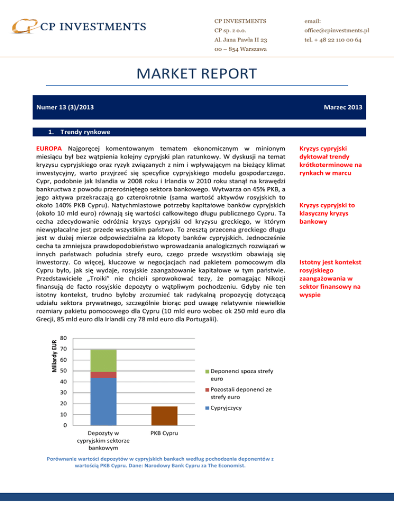 CP INVESTMENTS email: CP sp. z o.o. [email protected] Al. Jana Pawła II 23 tel. + 48 22 110 00 64 00 – 854 Warszawa MARKET REPORT Numer 13 (3)/2013 Marzec 2013 1. Trendy rynkowe Miliardy EUR EUROPA Najgoręcej komentowanym tematem ekonomicznym w minionym miesiącu był bez wątpienia kolejny cypryjski plan ratunkowy. W dyskusji na temat kryzysu cypryjskiego oraz ryzyk związanych z nim i wpływającym na bieżący klimat inwestycyjny, warto przyjrzeć się specyfice cypryjskiego modelu gospodarczego. Cypr, podobnie jak Islandia w 2008 roku i Irlandia w 2010 roku stanął na krawędzi bankructwa z powodu przerośniętego sektora bankowego. Wytwarza on 45% PKB, a jego aktywa przekraczają go czterokrotnie (sama wartość aktywów rosyjskich to około 140% PKB Cypru). Natychmiastowe potrzeby kapitałowe banków cypryjskich (około 10 mld euro) równają się wartości całkowitego długu publicznego Cypru. Ta cecha zdecydowanie odróżnia kryzys cypryjski od kryzysu greckiego, w którym niewypłacalne jest przede wszystkim państwo. To zresztą przecena greckiego długu jest w dużej mierze odpowiedzialna za kłopoty banków cypryjskich. Jednocześnie cecha ta zmniejsza prawdopodobieństwo wprowadzania analogicznych rozwiązań w innych państwach południa strefy euro, czego przede wszystkim obawiają się inwestorzy. Co więcej, kluczowe w negocjacjach nad pakietem pomocowym dla Cypru było, jak się wydaje, rosyjskie zaangażowanie kapitałowe w tym państwie. Przedstawiciele „Troiki” nie chcieli sprowokować tezy, że pomagając Nikozji finansują de facto rosyjskie depozyty o wątpliwym pochodzeniu. Gdyby nie ten istotny kontekst, trudno byłoby zrozumieć tak radykalną propozycję dotyczącą udziału sektora prywatnego, szczególnie biorąc pod uwagę relatywnie niewielkie rozmiary pakietu pomocowego dla Cypru (10 mld euro wobec ok 250 mld euro dla Grecji, 85 mld euro dla Irlandii czy 78 mld euro dla Portugalii). 80 70 60 50 Deponenci spoza strefy euro 40 Pozostali deponenci ze strefy euro 30 20 Cypryjczycy 10 0 Depozyty w cypryjskim sektorze bankowym PKB Cypru Porównanie wartości depozytów w cypryjskich bankach według pochodzenia deponentów z wartością PKB Cypru. Dane: Narodowy Bank Cypru za The Economist. Kryzys cypryjski dyktował trendy krótkoterminowe na rynkach w marcu Kryzys cypryjski to klasyczny kryzys bankowy Istotny jest kontekst rosyjskiego zaangażowania w sektor finansowy na wyspie CP INVESTMENTS email: CP sp. z o.o. [email protected] Al. Jana Pawła II 23 tel. + 48 22 110 00 64 00 – 854 Warszawa Istnieje niebezpieczeństwo opuszczenia strefy euro przez Cypr, co będzie poważnym ciosem dla wspólnej waluty i stworzy precedens, którego Bruksela bardzo silnie się obawia. Agencja ratingowa Moody’s uważa, że ryzyko wyjścia Cypru należy określić jako znaczące („substantial”), co stało się przyczyną obniżenia ratingu emitentów cypryjskich do poziomu maksymalnie Caa2. Sytuacja pozostaje dynamiczna, po otwarciu cypryjskich banków 28 marca ryzyko paniki bankowej wzrasta. O ile jednak nie wydarzy się nic niespodziewanego, sytuacja powinna zostać opanowana, przede wszystkim kosztem sektora prywatnego. Ostateczny plan zatwierdzony 25 marca zakłada likwidację drugiego co do wielkości banku Laiki, którego koszty poniosą jego obligatariusze oraz posiadacze depozytów przekraczających 100 tys. euro (ma to przynieść ok. 4,2 mld euro). Dobre aktywa Laiki przejmie Bank of Cyprus, największy bank komercyjny na wyspie, który również przejdzie głęboką restrukturyzację, finansowaną także przez jego akcjonariuszy oraz większych deponentów. Opanowanie sytuacji nie oznacza oczywiście rozwiązania problemów, a raczej kolejne kupno czasu. Gospodarka Cypru, według różnych szacunków, może skurczyć się w 2013 roku o 5-10%, co z może spowodować konieczność odpisów kredytów przez banki cypryjskie i eskalację kryzysu. Z kryzysu cypryjskiego wypływają jeszcze co najmniej dwie lekcje. Po pierwsze, brak pewności, czy analogiczne problemy nie dotkną w najbliższym czasie inne państwa unii walutowej o podobnej charakterystyce (niewielki gospodarki o przerośniętym sektorze bankowym) – Maltę, Słowenię a w dalszej kolejności np. Luksemburg. Po drugie, coraz wyraźniej rysuje się kluczowa rola EBC w gaszeniu kolejnych ognisk kryzysu w strefie euro. To właśnie bank centralny, jako dostarczyciel płynności dla zagrożonych banków, jest głównym rozgrywającym w ramach tzw. „Troiki” USA Wobec powrotu kłopotów w strefie euro, niemal niezauważone przez komentatorów pozostało ważne oświadczenie szefa FED, Bena Bernanke. Poprawiająca się sytuacja na amerykańskim rynku pracy (stopa bezrobocia spadła w lutym do 7,7% - poziomu najniższego od września 2008 roku) spowodowała obawy przed zakończeniem programu skupu aktywów w ramach tzw. „QE3+” o wartości 85 mld dolarów miesięcznie. Bernanke ostatecznie przeciął te spekulacje oświadczając 20 marca, że FED nie zmieni swojej polityki w najbliższym czasie. Jednocześnie zapewnił, że stopy procentowe pozostaną na niezmienionym poziomie, jeżeli stopa bezrobocia nie spadnie poniżej 6,5%, a oczekiwania inflacyjne nie wzrosną powyżej 2,5% (stopa inflacji w lutym wyniosła 2%). Amerykańska gospodarka w recesji lat 2008-2009 straciła około 8,8 mln miejsc pracy, a w przeciągu ostatnich trzech lat „odzyskała” zaledwie 5,5 mln. Ryzyko opuszczenia strefy euro przez Cypr jest akcentowane przez analityków… … ale nie powinno być zakładane jako scenariusz bazowy Sytuację Cypru pogarsza słaby obraz realnej sfery gospodarki Obawy o kondycję innych „bankowych” gospodarek strefy FED zapowiedział kontynuację programu QE3+ Stopa bezrobocia w USA, choć spada, to pozostaje na poziomie silnie odbiegającym od równowagi sprzed kryzysu Stopa bezrobocia w USA w latach 2006-2013 jako procent ludności aktywnej zawodowo. Źródło: tradingeconomi