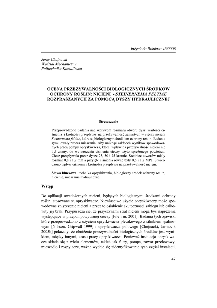 Inżynieria Rolnicza 13/2006 Jerzy Chojnacki Wydział Mechaniczny Politechnika Koszalińska OCENA PRZEŻYWALNOŚCI BIOLOGICZNYCH ŚRODKÓW OCHRONY ROŚLIN: NICIENI - STEINERNEMA FELTIAE ROZPRASZANYCH ZA POMOCĄ DYSZY HYDRAULICZNEJ Streszczenie Przeprowadzono badania nad wpływem rozmiaru otworu dysz, wartości ciśnienia i krotności przepływu na przeżywalność zawartych w cieczy nicieni Steinernema feltiae, które są biologicznym środkiem ochrony roślin. Badania symulowały proces mieszania. Aby uniknąć zakłóceń wyników spowodowanych pracą pompy opryskiwacza, której wpływ na przeżywalność nicieni nie był znany, do wytworzenia ciśnienia cieczy użyto sprężonego powietrza. Ciecz przepływała przez dysze 25, 50 i 75 krotnie. Średnice otworów miały rozmiar 0,8 i 1,2 mm a przyjęte ciśnienia równe były 0,6 i 1,2 MPa. Stwierdzono wpływ ciśnienia i krotności przepływu na przeżywalność nicieni. Słowa kluczowe: technika opryskiwania, biologiczny środek ochrony roślin, nicienie, mieszanie hydrauliczne. Wstęp Do aplikacji owadożernych nicieni, będących biologicznymi środkami ochrony roślin, stosowane są opryskiwacze. Niewłaściwe użycie opryskiwaczy może spowodować zniszczenie nicieni a przez to osłabienie skuteczności zabiegu lub całkowity jej brak. Przypuszcza się, że przyczynami strat nicieni mogą być naprężenia występujące w przepompowywanej cieczy [File i in. 2001]. Badania tych zjawisk, które przeprowadzono z użyciem opryskiwacza plecakowego z silnikiem spalinowym [Nilsson, Gripwall 1999] i opryskiwacza polowego [Chojnacki, Jarmocik 2005b] pokazały, że obniżenie przeżywalności biologicznych środków jest wynikiem, między innymi, czasu pracy opryskiwacza. Ponieważ instalacja opryskiwacza składa się z wielu elementów, takich jak filtry, pompa, zawór przelewowy, mieszadło i rozpylacze, ważne wydaje się zidentyfikowanie tych części instalacji, 47 Jerzy Chojnacki które mają istotny wpływ na śmiertelność nicieni. W dotychczasowych badaniach próbowano określić przede wszystkim wpływ parametrów pracy rozpylaczy na przeżywalność nicieni [Chojnacki, Jarmocik 2005a; File i in. 2001]. Szkody nicieni oceniano po jednokrotnym przepływie przez rozpylacze cieczy. W instalacji opryskiwacza istnieją jednak dysze, przez które ciecz krąży wielokrotnie. Są to dysze mieszadeł strumieniowych. Mieszadła strumieniowe stosowane są obecnie w większości produkowanych na świecie opryskiwaczy. Powinny znajdować się również w opryskiwaczach, za pomocą których aplikuje się biologiczne środki ochrony roślin ponieważ nicienie mają większy ciężar właściwy od wody i nie mieszane z wodą szybko opadają na dno zbiornika. Ciecz rozpylana przez opryskiwacz, w którym nie ma mieszadła, może początkowo zawierać nadmierną ilość nicieni by pod koniec opryskiwania nie zawierać ich prawie wcale [Chapple, Gwynn 1999]. Sedymentacja nicieni może wpływać również na obniżenie ich przeżywalności w opryskiwaczu, gdyż gromadzące się na dnie zbiornika są częściej niż ciecz przepompowywane poprzez instalację opryskiwacza [Chojnacki, Jarmocik 2005b]. Mieszadło może również bezpośrednio niekorzystnie wpływać na przeżywalność nicieni, ponieważ krążą przez nie wielokrotnie, przez co narażone są na uszkodzenia. Cel badań Celem badań było poszerzenie wiedzy o odporności na zniszczenie biologicznego środka ochrony roślin – owadożernych nicieni. Szczególnym celem było uzyskanie informacji o spadku odporności nicieni spowodowanym wpływem zjawisk występujących podczas wielokrotnego przepływu przez dyszę hydrauliczną zawierającej je cieczy. Próbowano także ocenić jak bardzo inne czynniki, poza krotnością przepływu, takie jak ciśnienie cieczy oraz rozmiar średnicy otworu dyszy mają wpływ na śmiertelność nicieni. Z punktu widzenia praktycznego badania dawały możliwość uzyskania wiedzy o wpływie na straty nicieni otworów w mieszadłach strumieniowych i rozpylaczach oraz szczelin w uchylonym zaworze przelewowym. Hipotezy Postawiono hipotezę, że przeżywalność nicieni, zmieszanych z cieczą, podczas przepływu przez dyszę jest zależna od wielokrotności przepływu cieczy, ciśnienia cieczy i rozmiaru otworu dyszy. 48 Ocena przeżywalności... Materiał i metody Do badań użyte zostały larwy inwazyjne owadobójczych nicieni Steinernema feltiae, które są biologicznym środkiem ochrony roślin, przeznaczonym głównie do zwalczania ziemiórek. Zawartość nicieni w cieczy roboczej użytej w badaniach wynosiła ok. 1000 szt. w 1 ml. Przepływ cieczy przez dyszę wymuszano za pomocą sprężonego powietrza po to by uniknąć zakłóceń wyników spowodowanych pracą pompy, której wpływ na przeżywalność nicieni nie był znany. W tym celu stworzono przyrząd do wielokrotnego przepompowania cieczy za pomocą powietrza. Budowa przyrządu przedstawiona jest na rysunku 1. Po wlaniu cieczy do zbiorniczka, zamykano zaworem przewód wlewowy a otwierano dopływ powietrza ze sprężarki, następnie otwierano dopływ cieczy do dyszy. Pod dyszą, w odległości 0,5 metra, znajdowało się naczynie, do którego zbierano ciecz. Następnie zebraną ciecz z powrotem wlewano do zbiorniczka w przyrządzie. Rys. 1. Fig. 1. Przyrząd do wielokrotnego przepompowywania cieczy przez dyszę hydrauliczną Device for multiple pumping of liquid through hydraulic nozzle 49 Jerzy Chojnacki Przyjęto do badań dwie średnice otworów dyszy – 0,8 i 1,2 mm. Dobrane zostały tak by powierzchnia większego otworu była dwukrotnością powierzchni mniejszego otworu. Były to ceramiczne krążki z rozpylaczy „Albuz”. Badania przeprowadzono dla dwóch wartości ciśnienia powietrza: 0,6 MPa i 1,2 MPa. Miarą odporności na zniszczenie nicieni była ich przeżywalność po przemieszczeniu się przez otwór dyszy. Przeżywalność nicieni wyznaczano z pobieranych próbek cieczy jako stosu