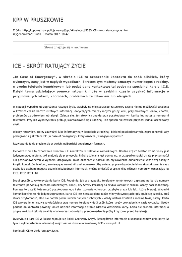 KPP W PRUSZKOWIE Źródło: http://kpppruszkow.policja.waw.pl/ppr/aktualnosci/8185,ICE-skrot-ratujacy-zycie.html Wygenerowano: Środa, 8 marca 2017, 18:42 Strona znajduje się w archiwum. ICE – SKRÓT RATUJĄCY ŻYCIE „In Case of Emergency”, w skrócie ICE to oznaczenie kontaktu do osób bliskich, który wykorzystywany jest w nagłych wypadkach. Skrótem tym możemy oznaczyć numer kogoś z rodziny, w swoim telefonie komórkowym lub podać dane kontaktowe tej osoby na specjalnej karcie I.C.E. Dzięki temu udzielający pomocy ratownik może w szybkim czasie uzyskać informacje o przyjmowanych lekach, chorobach, problemach ze zdrowiem lub alergiach. W sytuacji wypadku lub zagrożenia naszego życia, przybyły na miejsce zespół ratunkowy często nie ma możliwości ustalenia w krótkim czasie bardzo istotnych informacji, dotyczących między innymi grupy krwi, przyjmowanych leków, chorób, problemów ze zdrowiem lub alergii. Zdarza się, że ratownicy znajdą przy poszkodowanym kartkę lub notes z numerami telefonów. Przy ich wykorzystaniu próbują skontaktować się z rodziną. Ten sposób nie zawsze przynosi jednak oczekiwany efekt. Włoscy ratownicy, którzy zauważyli lukę informacyjną w kontakcie z rodziną i bliskimi poszkodowanych, zaproponowali, aby posługiwać się skrótem ICE (In Case of Emergency), który oznacza „w nagłym wypadku”. Rozwiązanie takie przyjęło się w dwóch, najbardziej popularnych formach. Pierwsza z nich to oznaczanie skrótem ICE kontaktów w telefonie komórkowym. Bardzo często telefon komórkowy jest jedynym przedmiotem, jaki znajduje się przy osobie, której udzielana jest pomoc np. w przypadku nagłej utraty przytomności lub poszkodowanemu w wypadku drogowym. Takie oznaczenie pozwoli na błyskawiczne odnalezienie właściwej osoby z książki kontaktów telefonu, zawierającej nawet kilkuset numerów. Aby zwiększyć prawdopodobieństwo skontaktowania się z osobą lub osobami mogącą udzielić niezbędnych informacji, można umieścić w spisie kilka różnych numerów, oznaczając je: ICE1, ICE2, ICE3, itd. Drugi sposób to wykorzystanie karty ICE. Podobnie, jak w przypadku telefonów komórkowych zapisane na karcie numery telefonów pozwalają służbom ratunkowym, Policji, czy Straży Pożarnej na szybki kontakt z bliskimi osoby poszkodowanej. Pomaga to ustalić tożsamość poszkodowanego i stan zdrowia (choroby, przebyte urazy lub leki, które bierze). Wypadki komunikacyjne, to nie jedyne zagrożenie. Karta ICE jest niezastąpiona także w innych sytuacjach: gdy zgubi się dziecko, ktoś straci przytomność, albo nie potrafi podać swoich danych osobowych – wtedy ułatwia kontakt z rodziną takiej osoby. Karta ICE zawiera imię i nazwisko właściciela oraz numery telefonów do 3 osób, które należy powiadomić w razie wypadku. Osoby podane do kontaktu powinny umieć udzielić informacji o stanie zdrowia właściciela karty. Karta nie zawiera informacji o grupie krwi, bo i tak nie zwalnia ona lekarza z obowiązku przeprowadzenia próby krzyżowej przed transfuzją. Dystrybucją kart ICE w Polsce zajmuje się Polski Czerwony Krzyż. Szczegółowe informacje o sposobie zamówienia karty (w tym z wykorzystaniem internetu) znajdziesz na stronie internetowej PCK – www.pck.pl Pamiętaj! ICE to skrót ratujący życie. mm/io (wykorzystano informacje ze strony www.pck.pl) Ocena: 0/5 (0) Tweetnij