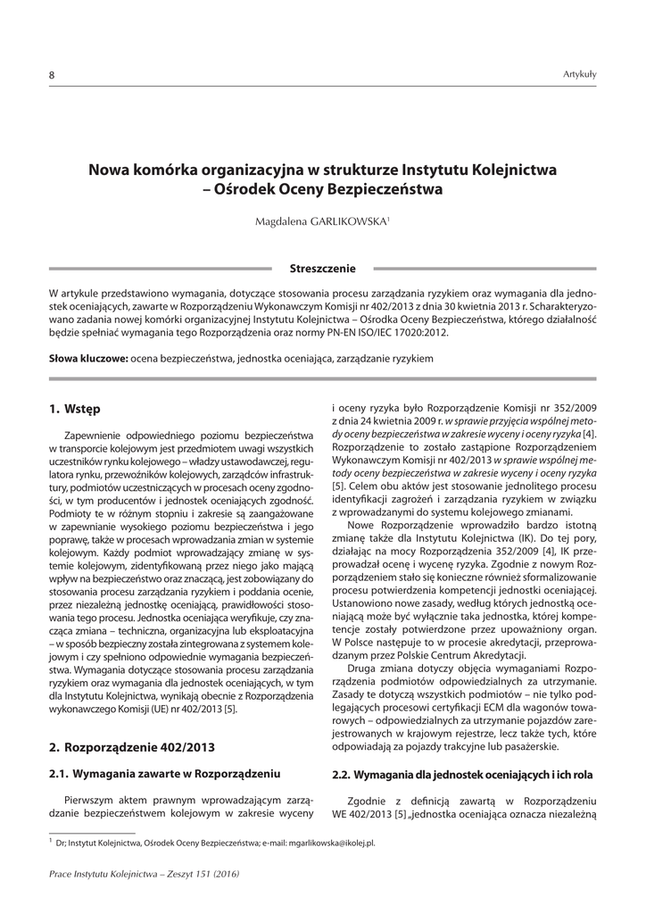Artykuäy 8 Nowa komórka organizacyjna w strukturze Instytutu Kolejnictwa – Ośrodek Oceny Bezpieczeństwa Magdalena GARLIKOWSKA1 Streszczenie W artykule przedstawiono wymagania, dotyczące stosowania procesu zarządzania ryzykiem oraz wymagania dla jednostek oceniających, zawarte w Rozporządzeniu Wykonawczym Komisji nr 402/2013 z dnia 30 kwietnia 2013 r. Scharakteryzowano zadania nowej komórki organizacyjnej Instytutu Kolejnictwa – Ośrodka Oceny Bezpieczeństwa, którego działalność będzie spełniać wymagania tego Rozporządzenia oraz normy PN-EN ISO/IEC 17020:2012. Słowa kluczowe: ocena bezpieczeństwa, jednostka oceniająca, zarządzanie ryzykiem 2. Rozporządzenie 402/2013 i oceny ryzyka było Rozporządzenie Komisji nr 352/2009 z dnia 24 kwietnia 2009 r. w sprawie przyjęcia wspólnej metody oceny bezpieczeństwa w zakresie wyceny i oceny ryzyka [4]. Rozporządzenie to zostało zastąpione Rozporządzeniem Wykonawczym Komisji nr 402/2013 w sprawie wspólnej metody oceny bezpieczeństwa w zakresie wyceny i oceny ryzyka [5]. Celem obu aktów jest stosowanie jednolitego procesu identyfikacji zagrożeń i zarządzania ryzykiem w związku z wprowadzanymi do systemu kolejowego zmianami. Nowe Rozporządzenie wprowadziło bardzo istotną zmianę także dla Instytutu Kolejnictwa (IK). Do tej pory, działając na mocy Rozporządzenia 352/2009 [4], IK przeprowadzał ocenę i wycenę ryzyka. Zgodnie z nowym Rozporządzeniem stało się konieczne również sformalizowanie procesu potwierdzenia kompetencji jednostki oceniającej. Ustanowiono nowe zasady, według których jednostką oceniającą może być wyłącznie taka jednostka, której kompetencje zostały potwierdzone przez upoważniony organ. W Polsce następuje to w procesie akredytacji, przeprowadzanym przez Polskie Centrum Akredytacji. Druga zmiana dotyczy objęcia wymaganiami Rozporządzenia podmiotów odpowiedzialnych za utrzymanie. Zasady te dotyczą wszystkich podmiotów – nie tylko podlegających procesowi certyfikacji ECM dla wagonów towarowych – odpowiedzialnych za utrzymanie pojazdów zarejestrowanych w krajowym rejestrze, lecz także tych, które odpowiadają za pojazdy trakcyjne lub pasażerskie. 2.1. Wymagania zawarte w Rozporządzeniu 2.2. Wymagania dla jednostek oceniających i ich rola Pierwszym aktem prawnym wprowadzającym zarządzanie bezpieczeństwem kolejowym w zakresie wyceny Zgodnie z definicją zawartą w Rozporządzeniu WE 402/2013 [5] „jednostka oceniająca oznacza niezależną 1. Wstęp Zapewnienie odpowiedniego poziomu bezpieczeństwa w transporcie kolejowym jest przedmiotem uwagi wszystkich uczestników rynku kolejowego – władzy ustawodawczej, regulatora rynku, przewoźników kolejowych, zarządców infrastruktury, podmiotów uczestniczących w procesach oceny zgodności, w tym producentów i jednostek oceniających zgodność. Podmioty te w różnym stopniu i zakresie są zaangażowane w zapewnianie wysokiego poziomu bezpieczeństwa i jego poprawę, także w procesach wprowadzania zmian w systemie kolejowym. Każdy podmiot wprowadzający zmianę w systemie kolejowym, zidentyfikowaną przez niego jako mającą wpływ na bezpieczeństwo oraz znaczącą, jest zobowiązany do stosowania procesu zarządzania ryzykiem i poddania ocenie, przez niezależną jednostkę oceniającą, prawidłowości stosowania tego procesu. Jednostka oceniająca weryfikuje, czy znacząca zmiana – techniczna, organizacyjna lub eksploatacyjna – w sposób bezpieczny została zintegrowana z systemem kolejowym i czy spełniono odpowiednie wymagania bezpieczeństwa. Wymagania dotyczące stosowania procesu zarządzania ryzykiem oraz wymagania dla jednostek oceniających, w tym dla Instytutu Kolejnictwa, wynikają obecnie z Rozporządzenia wykonawczego Komisji (UE) nr 402/2013 [5]. 1 Dr; Instytut Kolejnictwa, Ośrodek Oceny Bezpieczeństwa; e-mail: [email protected]. Prace Instytutu Kolejnictwa – Zeszyt 151 (2016) Nowa komórka organizacyjna w strukturze Instytutu Kolejnictwa – OĈrodek Oceny Bezpieczeþstwa i kompetentną wewnętrzną lub zewnętrzną osobę, organizację lub podmiot, które przeprowadzają badanie w celu ocenienia na podstawie dowodów, zdolności systemu do spełnienia wymogów bezpieczeństwa, które się do niego stosują”. Jednostka oceniająca nie może być zaangażowana bezpośrednio ani jako upoważniony przedstawiciel: w projektowanie, wytwarzanie, budowę, wprowadzanie do obrotu, eksploatację lub utrzymanie ocenianego systemu. Jednostka nie może również przeprowadzać w imieniu wnioskodawcy procesu oceny znaczenia zmiany lub wyceny i oceny ryzyka. Jej rolą jest niezależna, zewnętrzna ocena zgodności z zasadami prawidłowości i kompletności przeprowadzenia procesu zarządzania ryzykiem oraz zapewnienie, że wprowadzona zmiana może być bezpiecznie wdrożona i kontrolowana. Rolą jednostki oceniającej jest wsparcie podmiotu wprowadzającego zmianę w procesie zarządzania ryzykiem przez sprawdzenie i potwierdzenie, czy proces zarządzania ryzykiem został przeprowadzony prawidłowo i kompleksowo pod względem formalnym i merytorycznym. Jednostka ocenia też, czy konieczne jest podjęcie dodatkowych działań analitycznych lub wdrożenie jakichkolwiek innych rozwiązań w zakresie środków nadzoru do zapewnienia odpowiedniego poziomu bezpieczeństwa po wprowadzeniu danej zmiany. W celu dokonania niezależnej oceny adekwatności stosowania procesu zarządzania ryzykiem jednostka oceniająca: a) zapewnia pełne zrozumienie znaczącej zmiany na podstawie dokumentacji dostarczonej przez wnioskodawcę, b) przeprowadza ocenę procesów zarządzania bezpieczeństwem i jakością podczas projektowania i realizacji znaczącej zmiany, jeśli procesy te nie są już certyfikowane przez odpowiednią jednostkę oceniającą zgodność, c) przeprowadza ocenę stosowania tych procesów zarządzania bezpieczeństwem i jakością podczas projektowania i realizacji znaczącej zmiany. Zak