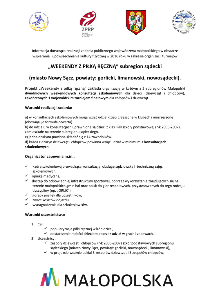 Informacja dotycząca realizacji zadania publicznego województwa małopolskiego w obszarze wspierania i upowszechniania kultury fizycznej w 2016 roku w zakresie organizacji turniejów „WEEKENDY Z PIŁKĄ RĘCZNĄ” subregion sądecki (miasto Nowy Sącz, powiaty: gorlicki, limanowski, nowosądecki). Projekt „Weekendy z piłką ręczną” zakłada organizację w każdym z 5 subregionów Małopolski dwudniowych weekendowych konsultacji szkoleniowych dla dzieci (dziewcząt i chłopców), zakończonych 1 wojewódzkim turniejem finałowym dla chłopców i dziewcząt. Warunki realizacji zadania: a) w konsultacjach szkoleniowych mogą wziąć udział dzieci zrzeszone w klubach i niezrzeszone (obowiązuje formuła otwarta). b) do udziału w konsultacjach uprawnione są dzieci z klas II-III szkoły podstawowej (r-k 2006-2007), zamieszkałe na terenie subregionu sądeckiego. c) jedna drużyna powinna składać się z 14 zawodników. d) każda z drużyn dziewcząt i chłopców powinna wziąć udział w minimum 3 konsultacjach szkoleniowych. Organizator zapewnia m.in.: kadrę szkoleniową prowadzącą konsultację, obsługę sędziowską i techniczną zajęć szkoleniowych, opiekę medyczną, dostęp do odpowiedniej infrastruktury sportowej, poprzez wykorzystanie znajdujących się na terenie małopolskich gmin hal oraz boisk do gier zespołowych, przystosowanych do tego rodzaju dyscypliny (np. „ORLIK”), gorący posiłek dla uczestników, zwrot kosztów dojazdu, wynagrodzenia dla szkoleniowców. Warunki uczestnictwa: 1. Cel: popularyzacja piłki ręcznej wśród dzieci, dostarczenie radości dzieciom poprzez udział w grach i zabawach, 2. Uczestnicy: zespoły dziewcząt i chłopców (r-k 2006-2007) szkół podstawowych subregionu sądeckiego (miasto Nowy Sącz, powiaty: gorlicki, nowosądecki, limanowski), w projekcie weźmie udział 5 zespołów dziewcząt i 5 zespołów chłopców, 3. Terminy i miejsce: konsultacje (4 spotkania) przewidziane są: po jednej konsultacji w maju, czerwcu, wrześniu i październiku 2016 roku (szczegółowe informacje po zakwalifikowaniu szkół), finał (zwycięska drużyna dziewcząt i chłopców) zaplanowano w październiku 2016 w Krakowie, hala sportowa Powiatowego Zespołu Placówek Oświatowych w Bieczu, ul. Kazimierza Wielkiego 11a, hala sportowa Zespołu Szkolno – Przedszkolnego w Libuszy, Libusza 679, 4. Wytyczne dotyczące zespołów: drużyna liczy do 14 zawodników + opiekun, posiadanie ważnych legitymacji szkolnych, 5. Wytyczne szkoleniowe: szkolenie przeprowadzone zostanie zgodnie z wytycznymi Rady Trenerów Związku Piłki Ręcznej w Polsce, 6. Zgłoszenia: wypełniona karta zgłoszenia do 20.04.2016 (decyduje kolejność zgłoszeń), zgłoszenia należy wysłać e-mailem na adres: [email protected] zgodnie z założeniami projektu w szkoleniu weźmie udział 5 zespołów chłopców i 5 zespołów dziewcząt, 7. Inne: zastrzega się prawo do zmian w wytycznych dotyczących realizacji projektu Weekendy z piłką ręczną 2016. Koordynator subregionu sądeckiego Wojciech Bajorek, +48 669 408 594, e-mail: [email protected] „Projekt realizowany jest przy wsparciu finansowym Województwa Małopolskiego”.