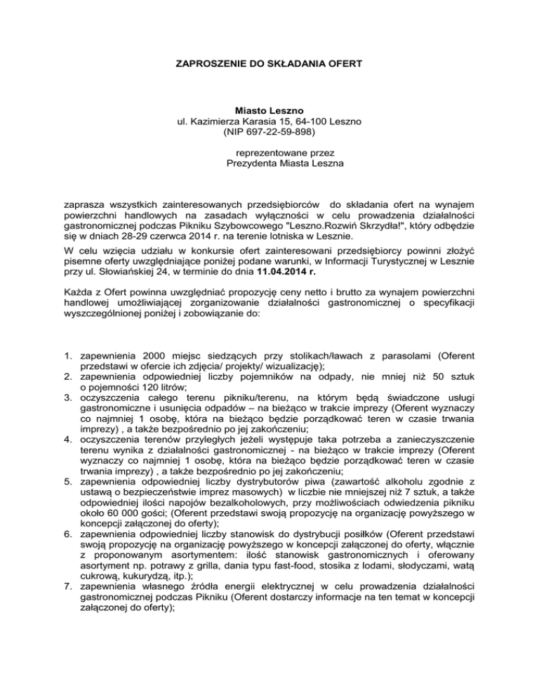 ZAPROSZENIE DO SKŁADANIA OFERT Miasto Leszno ul. Kazimierza Karasia 15, 64-100 Leszno (NIP 697-22-59-898) reprezentowane przez Prezydenta Miasta Leszna zaprasza wszystkich zainteresowanych przedsiębiorców do składania ofert na wynajem powierzchni handlowych na zasadach wyłączności w celu prowadzenia działalności gastronomicznej podczas Pikniku Szybowcowego "Leszno.Rozwiń Skrzydła!", który odbędzie się w dniach 28-29 czerwca 2014 r. na terenie lotniska w Lesznie. W celu wzięcia udziału w konkursie ofert zainteresowani przedsiębiorcy powinni złożyć pisemne oferty uwzględniające poniżej podane warunki, w Informacji Turystycznej w Lesznie przy ul. Słowiańskiej 24, w terminie do dnia 11.04.2014 r. Każda z Ofert powinna uwzględniać propozycję ceny netto i brutto za wynajem powierzchni handlowej umożliwiającej zorganizowanie działalności gastronomicznej o specyfikacji wyszczególnionej poniżej i zobowiązanie do: 1. zapewnienia 2000 miejsc siedzących przy stolikach/ławach z parasolami (Oferent przedstawi w ofercie ich zdjęcia/ projekty/ wizualizację); 2. zapewnienia odpowiedniej liczby pojemników na odpady, nie mniej niż 50 sztuk o pojemności 120 litrów; 3. oczyszczenia całego terenu pikniku/terenu, na którym będą świadczone usługi gastronomiczne i usunięcia odpadów – na bieżąco w trakcie imprezy (Oferent wyznaczy co najmniej 1 osobę, która na bieżąco będzie porządkować teren w czasie trwania imprezy) , a także bezpośrednio po jej zakończeniu; 4. oczyszczenia terenów przyległych jeżeli występuje taka potrzeba a zanieczyszczenie terenu wynika z działalności gastronomicznej - na bieżąco w trakcie imprezy (Oferent wyznaczy co najmniej 1 osobę, która na bieżąco będzie porządkować teren w czasie trwania imprezy) , a także bezpośrednio po jej zakończeniu; 5. zapewnienia odpowiedniej liczby dystrybutorów piwa (zawartość alkoholu zgodnie z ustawą o bezpieczeństwie imprez masowych) w liczbie nie mniejszej niż 7 sztuk, a także odpowiedniej ilości napojów bezalkoholowych, przy możliwościach odwiedzenia pikniku około 60 000 gości; (Oferent przedstawi swoją propozycję na organizację powyższego w koncepcji załączonej do oferty); 6. zapewnienia odpowiedniej liczby stanowisk do dystrybucji posiłków (Oferent przedstawi swoją propozycję na organizację powyższego w koncepcji załączonej do oferty, włącznie z proponowanym asortymentem: ilość stanowisk gastronomicznych i oferowany asortyment np. potrawy z grilla, dania typu fast-food, stosika z lodami, słodyczami, watą cukrową, kukurydzą, itp.); 7. zapewnienia własnego źródła energii elektrycznej w celu prowadzenia działalności gastronomicznej podczas Pikniku (Oferent dostarczy informacje na ten temat w koncepcji załączonej do oferty); 8. przygotowania i wydania 300 bezpłatnych posiłków regeneracyjnych (np. kiełbasa/mięso z grilla + pieczywo + napój) dla wolontariuszy obsługujących Piknik Szybowcowy (Oferent przedstawi swoją propozycję na skład posiłku w koncepcji załączonej do oferty); 9. zorganizowania namiotu VIP-owskiego z zagwarantowaniem nielimitowanych bezpłatnych napojów bezalkoholowych i piwa (zgodnie z ustawą o bezpieczeństwie imprez masowych) i wyżywienia dla 100 osób dziennie spełniającego następujące warunki: a. namiot zlokalizowany będzie w strefie VIP, b. wyposażony zostanie w podłogę, stoliki i miejsca siedzące ( min. 25 miejsc siedzących) c. namiot będzie posiadał również miejsca siedzące na zewnątrz przy stolikach z parasolami (min. 20 miejsc siedzących) i odgrodzony będzie np. płotkiem (tzw. ogródek) d. wydzielone zostanie miejsce na kabinę sanitarna typu TOY TOY (kabinę na swój koszt dostarczy Zamawiający, Oferent będzie na bieżąco dbał o jej czystość) e. namiot będzie funkcjonował przez dwa dni, w godzinach trwania pikniku w tym również koncertu gwiazdy muzycznej, f. dostęp do namiotu będą miały osoby posiadające odpowiedni identyfikator (identyfikatory zostaną wyprodukowane przez Organizatora w ilości 100 szt, kontrola dostępu zostanie zapewniona przez Organizatora). Oferent przedstawi w koncepcji załączonej do oferty przykładowe zdjęcia / projekt / wizualizację namiotu VIP wraz z proponowanym menu, wyposażeniem i dekoracjami. 10. Oferent załączy do oferty informacje o swoim doświadczeniu w prowadzeniu działalności gastronomicznej w czasie dużych imprez. 11. przestrzegania wszelkich porządkowych poleceń organizatora Pikniku; 12. Organizator nie dopuszcza umieszczania przez wybranego Oferenta na terenie Pikniku nośników reklamowych poza obrandowanymi elementami niezbędnego wyposażenia (np. namioty, parasole), zgodnie z zasadami przedstawionymi poniżej. Bez zgody Organizatora dopuszcza się jedynie stosowanie elementów wyposarzenia, które opatrzone są informacjami/ brandingiem wybranego Oferenta. Jeśli elementy wyposarzenia są opatrzone informacjami / brandingiem innej marki, należy to zaznaczyć w ofercie w celu uzyskania zgody Organizatora. 13. Zamawiający udostępni Oferentowi przyłącze wodne i obciąży go kosztami za zużycie wody podczas imprezy. Oferta musi być podpisana przez osobę lub osoby uprawnione do reprezentowania Oferenta. Ponadto oferta powinna zostać sporządzona w języku polskim oraz zawierać: pełną nazwę Oferenta; siedzibę i dokładny adres Oferenta; dane kontaktowe, w szczególności numer telefonu; nr NIP, Regon; osobę do kontaktu; koncepcję wykorzystania powierzchni handlowej w celu prowadzenia działalności gastronomicznej w czasie Pikniku Szybowcowego, zgodnie z wymogami przedstawionymi powyżej; 7. oświadczenie o zdolności organizacyjnej i ekonomicznej do zrealizowania na wynajętej powierzchni usług gastronomicznych o wskazanej w niniejszym zapytaniu specyfikacji; 1. 2. 3. 4. 5. 6. 8. oświadczenie iż koncepcję wykorzystania powierzchni handlowej w celu prowadzenia działalności gastronomicz
