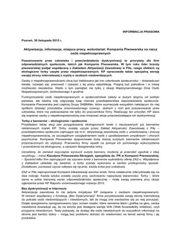 INFORMACJA PRASOWA Poznań, 30 listopada 2012 r. Aktywizacja, informacja, miejsca pracy, wolontariat: Kompania Piwowarska na rzecz osób niepełnosprawnych Poszanowanie praw człowieka i przeciwdziałanie dyskryminacji to priorytety dla firm odpowiedzialnych społecznie, takich jak Kompania Piwowarska. W tym roku lider branży piwowarskiej podjął współpracę z Zakładem Aktywizacji Zawodowej w Pile, czego efektem są ekologiczne torby uszyte przez niepełnosprawnych. KP opracowała także specjalną wersję swojej strony internetowej z myślą o osobach niedowidzących. Osoby z niepełnosprawnościami chcą być traktowane jak inni członkowie społeczności – doświadczać świata, rozwijać się, pracować i czerpać z tej pracy satysfakcję. Pragną być potrzebne i w miarę możliwości niezależne. Warto o tym pamiętać nie tylko z okazji Międzynarodowego Dnia Osób Niepełnosprawnych, obchodzonego 3 grudnia. Funkcjonowanie osób niepełnosprawnych w społeczeństwie zależy w dużym stopniu od polityki państwa, ale istotną rolę odgrywają tutaj również przedsiębiorstwa odpowiedzialne społecznie. Kompania Piwowarska jest częścią Grupy SABMiller, która wyznaczyła wszystkim należącym do niej spółkom dziesięć priorytetów zrównoważonego rozwoju. Jednym z nich jest poszanowanie praw człowieka, które ma zastosowanie nie tylko do pracowników firmy. Realizując ten priorytet, KP stara się wspierać osoby z niepełnosprawnością oraz inicjować akcje przeciwdziałające ich dyskryminacji. Torby z bannerów – ekologicznie i społecznie Przykładem takiej akcji jest przygotowanie ekologicznych toreb z nieużywanych już bannerów reklamowych marek KP. Torby zostały uszyte przez Zakład Aktywności Zawodowej z Piły – przedsiębiorstwo społeczne zajmujące się m.in. aktywizacją zawodową osób z umiarkowaną i znaczą niepełnosprawnością, ze szczególnym uwzględnieniem osób z upośledzeniem umysłowym i chorych psychicznie. Kompania Piwowarska dysponowała dużą ilością zużytych bannerów reklamowych przeznaczonych do utylizacji. Pracownicy firmy wpadli na pomysł ich ponownego wykorzystania i przerobienia na ekologiczne, a zarazem designerskie torby. Uznaliśmy, że zamiast zwyczajnie wyrzucić zużyte bannery, możemy je przerobić zgodnie z ideą recyklingu – mówi Klaudyna Polanowska-Skrzypek, specjalista ds. PR w Kompanii Piwowarskiej. – Spośród kilku firm zajmujących się szyciem toreb z bannerów wybraliśmy ofertę ZAZ-u. Współpraca z Zakładem układała się świetnie, a torby zostały wykonane w bardzo profesjonalny sposób. Dodatkowo, ponieważ szycie odbywa się ręcznie, każda torba jest unikatowa. ZAZ w Pile zaproponował Kompanii kilkadziesiąt wzorów toreb, firma ostatecznie zdecydowała się na dwa rodzaje. Każda sztuka została uszyta przy zachowaniu najwyższej staranności. Torby – które same w sobie stanowią wyraz odpowiedzialności społecznej – miały swoją premierę przy okazji ogłoszenia przez KP Raportu zrównoważonego rozwoju 2012. Bez dyskryminacji w Internecie Aktywizacja zawodowa to nie jedyna inicjatywa KP związana z osobami niepełnosprawnymi. W ramach współpracy z fundacją „Bez Dyskryminacji” firma przystosowała swoją stronę internetową do potrzeb osób niedowidzących i niewidomych, tak że mogą one swobodnie się po niej poruszać. Dzięki specjalnemu oprogramowaniu typu screen reader, które zamienia tekst i grafikę na głos, osoba niewidoma dowiaduje się, że na stronie jest dostępna wersja WAI (Web Accessibility Initiative), czyli przyjazna niewidomym. Testy pokazały, że dostęp dla osób niewidomych do wszystkich informacji na stronie jest bardzo dobry – mogą bez problemu dotrzeć do wiadomości na temat samej firmy i jej produktów. Ze specjalnej wersji strony, dostępnej pod adresem www. wai.kp.pl, mogą bez trudu korzystać także osoby niedowidzące. Użyto tutaj czcionki o rozmiarze większym niż standardowy, a dodatkowo można ją powiększać, używając skrótu na klawiaturze „CTRL +”. Co więcej, strona została wykonana w kontrastowych kolorach – wszystkie teksty napisane są żółtą lub pomarańczową czcionką na czarnym tle. Taki dobór barw tworzy wyraźny kontrast, dzięki czemu osoby mające problemy ze wzrokiem mogą odczytać treść. Na rzecz lokalnych społeczności Kompania Piwowarska stara się również zatrudniać osoby niepełnosprawne. W roku rozliczeniowym F12 (kwiecień 2011 – marzec 2012) w firmie pracowało dziewięć osób z orzeczoną niepełnosprawnością, w tym trzy niepełnosprawne w stopniu umiarkowanym i sześć – w stopniu lekkim. Na koniec warto wspomnieć o licznych działaniach wolontariackich podejmowanych przez pracowników Kompanii Piwowarskiej na rzecz osób niepełnosprawnych. Co kwartał w ramach wolontariatu pracowniczego realizowanych jest ok. 10 projektów pod hasłem „Kompania Wolontariuszy”, z których część ma za zadanie wesprzeć osoby z niepełnosprawnościami poprzez współpracę z wybranymi fundacjami i stowarzyszeniami. Obecnie trwają trzy takie projekty: wolontariusze KP pomagają Wspólnocie Chleb Życia w Warszawie, Zespołowi Szkół Nr 11 w Białymstoku i Domowi Pomocy Społecznej dla Dzieci prowadzonemu przez Zgromadzenie Sióstr Serafitek w Poznaniu. Do redaktora: Kompania Piwowarska – Lider branży piwowarskiej w Polsce Kompania Piwowarska jest największym przedsiębiorstwem piwowarskim w Polsce. Kilkusetletnie doświadczenia w warzeniu piwa, nowoczesne technologie i rygorystyczne przestrzeganie zasad produkcji na światowym poziomie gwarantują najwyższą jakość naszych produktów. Do portfela marek KP należą najpopularniejsze polskie piwa – m.in. Tyskie, Żubr, Lech, Dębowe Mocne, Redd's, a także międzynarodowe marki premium: Pilsner Urquell, Grolsch oraz Peroni Nastro Azzurro. Kompania Piwowarska (utworzona w 1999 roku) posiada trzy browary (w Tychach, Poznaniu