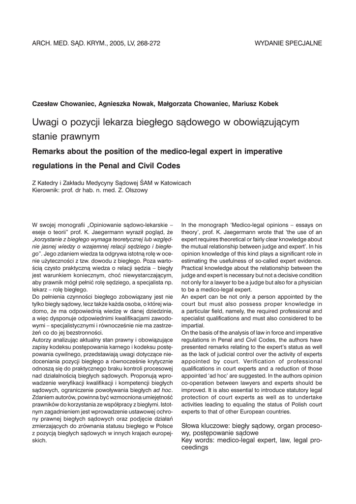 ARCH. MED. SĄD. KRYM., 2005, LV, 268-272 WYDANIE SPECJALNE Czesław Chowaniec, Agnieszka Nowak, Małgorzata Chowaniec, Mariusz Kobek Uwagi o pozycji lekarza biegłego sądowego w obowiązującym stanie prawnym Remarks about the position of the medico-legal expert in imperative regulations in the Penal and Civil Codes Z Katedry i Zakładu Medycyny Sądowej ŚAM w Katowicach Kierownik: prof. dr hab. n. med. Z. Olszowy W swojej monografii „Opiniowanie sądowo-lekarskie – eseje o teorii” prof. K. Jaegermann wyraził pogląd, że „korzystanie z biegłego wymaga teoretycznej lub względnie jasnej wiedzy o wzajemnej relacji sędziego i biegłego”. Jego zdaniem wiedza ta odgrywa istotną rolę w ocenie użyteczności z tzw. dowodu z biegłego. Poza wartością czysto praktyczną wiedza o relacji sędzia – biegły jest warunkiem koniecznym, choć niewystarczającym, aby prawnik mógł pełnić rolę sędziego, a specjalista np. lekarz – rolę biegłego. Do pełnienia czynności biegłego zobowiązany jest nie tylko biegły sądowy, lecz także każda osoba, o której wiadomo, że ma odpowiednią wiedzę w danej dziedzinie, a więc dysponuje odpowiednimi kwalifikacjami zawodowymi – specjalistycznymi i równocześnie nie ma zastrzeżeń co do jej bezstronności. Autorzy analizując aktualny stan prawny i obowiązujące zapisy kodeksu postępowania karnego i kodeksu postępowania cywilnego, przedstawiają uwagi dotyczące niedoceniania pozycji biegłego a równocześnie krytycznie odnoszą się do praktycznego braku kontroli procesowej nad działalnością biegłych sądowych. Proponują wprowadzenie weryfikacji kwalifikacji i kompetencji biegłych sądowych, ograniczenie powoływania biegłych ad hoc. Zdaniem autorów, powinna być wzmocniona umiejętność prawników do korzystania ze współpracy z biegłymi. Istotnym zagadnieniem jest wprowadzenie ustawowej ochrony prawnej biegłych sądowych oraz podjęcie działań zmierzających do zrównania statusu biegłego w Polsce z pozycją biegłych sądowych w innych krajach europejskich. In the monograph ‘Medico-legal opinions – essays on theory’, prof. K. Jaegermann wrote that ‘the use of an expert requires theoretical or fairly clear knowledge about the mutual relationship between judge and expert’. In his opinion knowledge of this kind plays a significant role in estimating the usefulness of so-called expert evidence. Practical knowledge about the relationship between the judge and expert is necessary but not a decisive condition not only for a lawyer to be a judge but also for a physician to be a medico-legal expert. An expert can be not only a person appointed by the court but must also possess proper knowledge in a particular field, namely, the required professional and specialist qualifications and must also considered to be impartial. On the basis of the analysis of law in force and imperative regulations in Penal and Civil Codes, the authors have presented remarks relating to the expert’s status as well as the lack of judicial control over the activity of experts appointed by court. Verification of professional qualifications in court experts and a reduction of those appointed ‘ad hoc’ are suggested. In the authors opinion co-operation between lawyers and experts should be improved. It is also essential to introduce statutory legal protection of court experts as well as to undertake activities leading to equaling the status of Polish court experts to that of other European countries. Słowa kluczowe: biegły sądowy, organ procesowy, postępowanie sądowe Key words: medico-legal expert, law, legal proceedings Nr 4 UWAGI O POZYCJI LEKARZA BIEGŁEGO SĄDOWEGO CEL PRACY Celem pracy jest próba analizy i dyskusji obowiązujących aktualnie przepisów prawnych dotyczących lekarza – biegłego sądowego. Obejmuje: zasady wpisywania się lekarzy na listę biegłych sądowych, zasady powoływania biegłego sądowego w postępowaniu karnym i cywilnym, dopuszczenia dowodu z opinii biegłego, zasad wynagrodzenia biegłego za wykonaną pracę. I. Lekarz w roli biegłego sądowego Art. 2 pkt. 1 Ustawy o zawodzie lekarza [1] mówi, że „wykonywanie zawodu lekarza polega na udzielaniu przez osobę posiadającą wymagane kwalifikacje potwierdzone odpowiednimi dokumentami świadczeń zdrowotnych, w szczególności: badaniu stanu zdrowia, rozpoznawaniu chorób i zapobieganiu im, leczeniu i rehabilitacji chorych, udzielaniu porad lekarskich, a także wydawaniu opinii i orzeczeń lekarskich”. Jak wynika z powyższego ustawodawca definiuje obowiązki wynikające z wykonywania zawodu lekarza z uwzględnieniem możliwości wydawania przez lekarza opinii i orzeczeń. Ustawa w art. 40 § 2 zwalnia lekarza z zachowania tajemnicy lekarskiej, gdy „badanie lekarskie (i co za tym idzie wydanie opinii np. sądowo-lekarskiej – przypis autora) zostało przeprowadzone na żądanie uprawnionych, na podstawie odrębnych ustaw, organów i instytucji. Wówczas lekarz jest obowiązany poinformować o stanie zdrowia pacjenta wyłącznie te organy i instytucje”. Pozostaje to w zgodności z Kodeksem Etyki Lekarskiej [2], gdzie art. 25 mówi, że zwolnienie z zachowania tajemnicy lekarskiej może nastąpić „jeśli zobowiązują do tego przepisy prawa”. Jednocześnie w art. 26 znajdujemy ciąg dalszy zarządzenia samorządu lekarskiego, który zastrzega, że „nie jest naruszeniem tajemnicy lekarskiej, jeśli po przeprowadzeniu badania lekarskiego na zlecenie upoważnionego z mocy prawa organu wynik badania zostanie przekazany zleceniodawcy; nieodzownym warunkiem jest jednak, aby lekarz przed rozpoczęciem badania poinformował o tym osobę, która ma być zbadana. Wszelkie informacje, które nie są konieczne dla uzasadnienia wniosków wynikających z badania, powinny być nadal objęte tajemnicą lekarską”. Na marginesie powyższego nadmienić należy, że lekarz dość często powoływany jest przez organ procesowy jako świadek