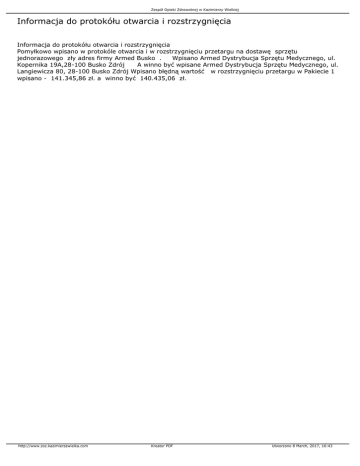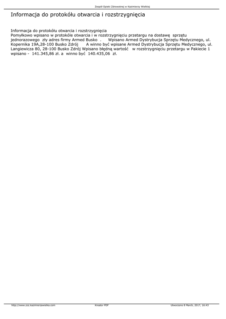 Zespół Opieki Zdrowotnej w Kazimierzy Wielkiej Informacja do protokółu otwarcia i rozstrzygnięcia Informacja do protokółu otwarcia i rozstrzygnięcia Pomyłkowo wpisano w protokóle otwarcia i w rozstrzygnięciu przetargu na dostawę sprzętu jednorazowego zły adres firmy Armed Busko . Wpisano Armed Dystrybucja Sprzętu Medycznego, ul. Kopernika 19A,28-100 Busko Zdrój A winno być wpisane Armed Dystrybucja Sprzętu Medycznego, ul. Langiewicza 80, 28-100 Busko Zdrój Wpisano błędną wartość w rozstrzygnięciu przetargu w Pakiecie 1 wpisano - 141.345,86 zł. a winno być 140.435,06 zł. http://www.zoz.kazimierzawielka.com Kreator PDF Utworzono 8 March, 2017, 16:43