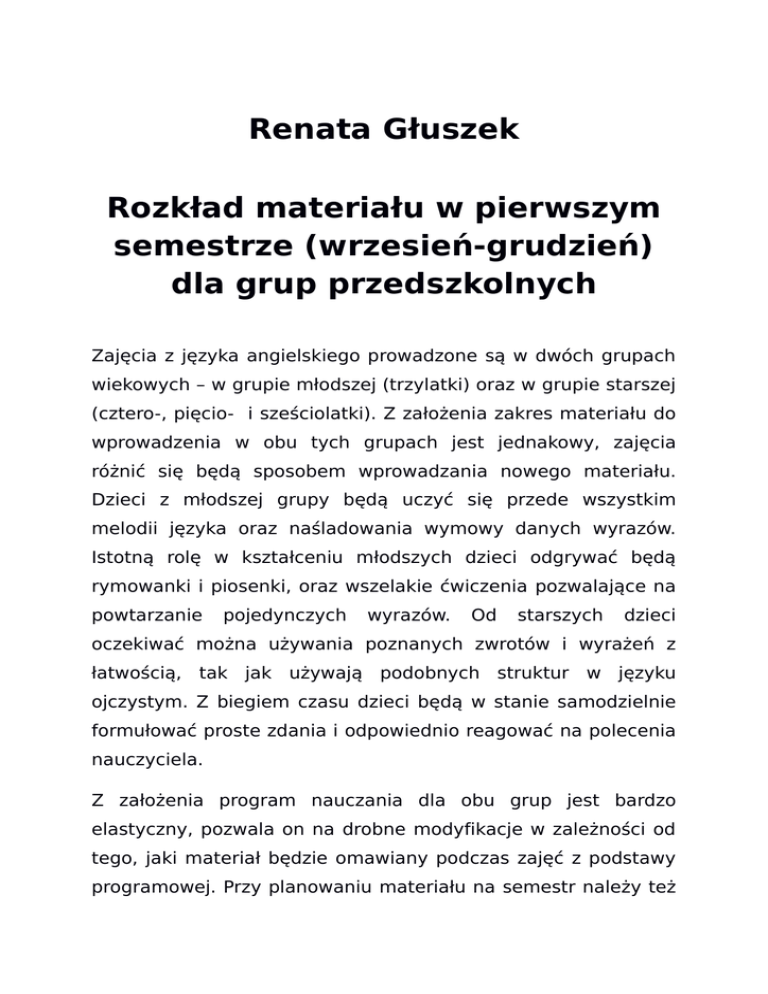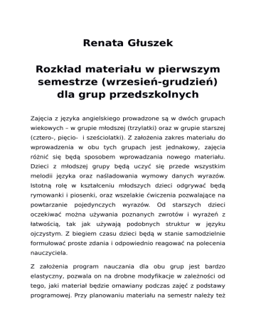 Renata Głuszek Rozkład materiału w pierwszym semestrze (wrzesień-grudzień) dla grup przedszkolnych Zajęcia z języka angielskiego prowadzone są w dwóch grupach wiekowych – w grupie młodszej (trzylatki) oraz w grupie starszej (cztero-, pięcio- i sześciolatki). Z założenia zakres materiału do wprowadzenia w obu tych grupach jest jednakowy, zajęcia różnić się będą sposobem wprowadzania nowego materiału. Dzieci z młodszej grupy będą uczyć się przede wszystkim melodii języka oraz naśladowania wymowy danych wyrazów. Istotną rolę w kształceniu młodszych dzieci odgrywać będą rymowanki i piosenki, oraz wszelakie ćwiczenia pozwalające na powtarzanie pojedynczych wyrazów. Od starszych dzieci oczekiwać można używania poznanych zwrotów i wyrażeń z łatwością, tak jak używają podobnych struktur w języku ojczystym. Z biegiem czasu dzieci będą w stanie samodzielnie formułować proste zdania i odpowiednio reagować na polecenia nauczyciela. Z założenia program nauczania dla obu grup jest bardzo elastyczny, pozwala on na drobne modyfikacje w zależności od tego, jaki materiał będzie omawiany podczas zajęć z podstawy programowej. Przy planowaniu materiału na semestr należy też wziąć pod uwagę szybkość przyswajania nowego słownictwa przez uczniów. Założyć można, że dzieci młodsze potrzebować będą więcej czasu na zapoznanie się z nowymi strukturami, niż starsze dzieci, tak więc program może być realizowany wolniej w grupie młodszej. Rozkład materiału na pierwszy semestr obejmuje okres od września do grudnia, ponieważ od stycznia planowane jest wprowadzenie podręczników dla obu grup, co znacząco wpłynie na zmianę planu pracy. Niektóre elementy z semestru pierwszego będą się powtarzać w drugim semestrze. Taki zabieg ma na celu utrwalenie słownictwa oraz struktur i, w rezultacie, ułatwienie dzieciom posługiwania się językiem angielskim w sposób, w jaki posługują się językiem ojczystym. Septemb er topic structures week 1 Getting to know each other ---- week 2 Introducing myself Hello! Hi! vocabulary “Hello” song I am .... week 3 Simple commands Stand up! “Hello” song Sit down! Yes, no Be quiet! additional comments Children need to be given time to adapt to the new environment. Therefore, they might be too shy or scared to speak. (Sshh!) week 4 Actions Jump ---- Swim Dance If children are ready, some games may be introduced at this point. Turn around October topic structures vocabulary week 1 Actions and commands (revision and games) all from week 3 and 4 in September plus new ones, if necessary “Up up in a balloon” song additional comments blue week 2 World around us: colours ____ green red yellow week 3 World around us: colours (cont.) ---- pink black week 4 Commands and colours Touch colours from week 1 and 2 „Blue is my favourite colour” song Novembe r topic structures vocabulary additional comments week 1 week 2 week 3 Revision after two months – commands, action, colours, songs I can count I can count – cont. Material covered during September and October How many…? numbers 1-5 How many...? numbers 6-10 There is... “1,2,3 point to the door” chant There are... Children should be familiar with some vocabulary since counting have been used right from the beginning. door week 4 My classroom ---- floor window table Decembe r topic structures vocabulary chair week 1 My classroom – cont. picture Where is…? car pet „1,2,3 hop with me” song additional comments week 2 week 3 week 4 Revision before the end of the semester Christmas is coming Material covered since the beginning of the school year ---- vocabulary connected with Christmas Follow up/ end of the semester This week’s classes will be mainly devoted to art and craft.