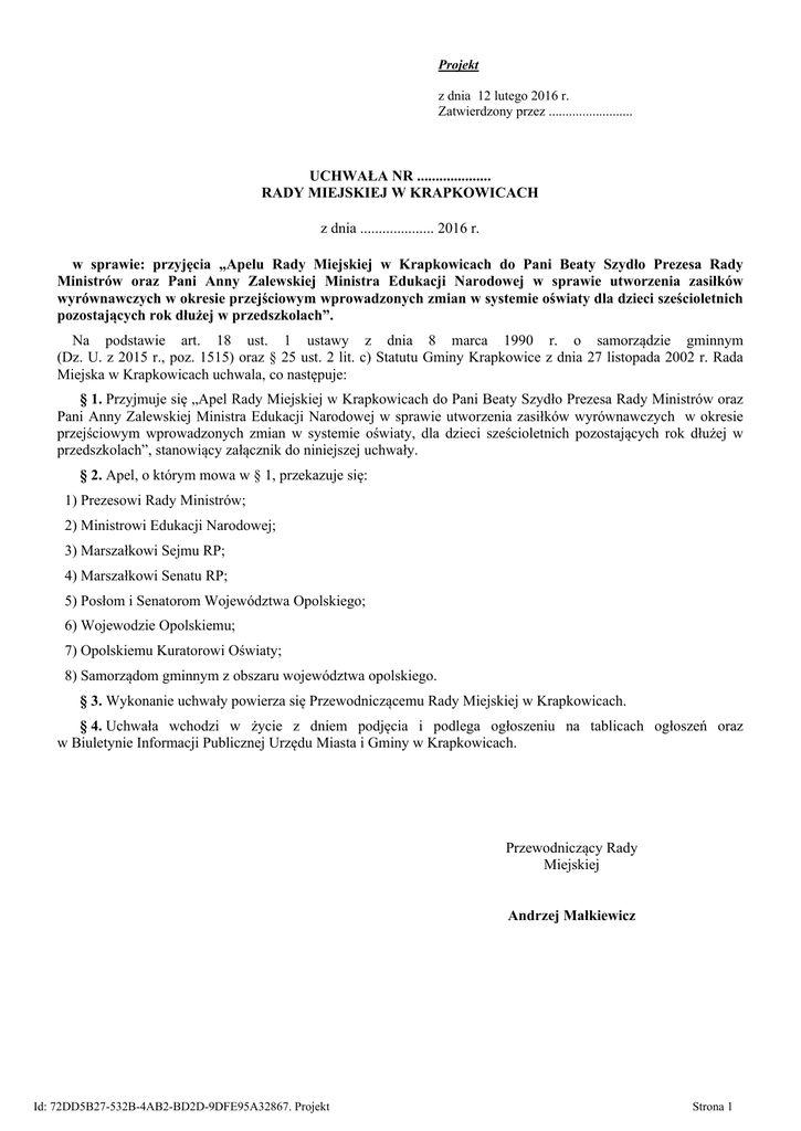 Projekt z dnia 12 lutego 2016 r. Zatwierdzony przez ......................... UCHWAŁA NR .................... RADY MIEJSKIEJ W KRAPKOWICACH z dnia .................... 2016 r. w sprawie: przyjęcia „Apelu Rady Miejskiej w Krapkowicach do Pani Beaty Szydło Prezesa Rady Ministrów oraz Pani Anny Zalewskiej Ministra Edukacji Narodowej w sprawie utworzenia zasiłków wyrównawczych w okresie przejściowym wprowadzonych zmian w systemie oświaty dla dzieci sześcioletnich pozostających rok dłużej w przedszkolach”. Na podstawie art. 18 ust. 1 ustawy z dnia 8 marca 1990 r. o samorządzie gminnym (Dz. U. z 2015 r., poz. 1515) oraz § 25 ust. 2 lit. c) Statutu Gminy Krapkowice z dnia 27 listopada 2002 r. Rada Miejska w Krapkowicach uchwala, co następuje: § 1. Przyjmuje się „Apel Rady Miejskiej w Krapkowicach do Pani Beaty Szydło Prezesa Rady Ministrów oraz Pani Anny Zalewskiej Ministra Edukacji Narodowej w sprawie utworzenia zasiłków wyrównawczych w okresie przejściowym wprowadzonych zmian w systemie oświaty, dla dzieci sześcioletnich pozostających rok dłużej w przedszkolach”, stanowiący załącznik do niniejszej uchwały. § 2. Apel, o którym mowa w § 1, przekazuje się: 1) Prezesowi Rady Ministrów; 2) Ministrowi Edukacji Narodowej; 3) Marszałkowi Sejmu RP; 4) Marszałkowi Senatu RP; 5) Posłom i Senatorom Województwa Opolskiego; 6) Wojewodzie Opolskiemu; 7) Opolskiemu Kuratorowi Oświaty; 8) Samorządom gminnym z obszaru województwa opolskiego. § 3. Wykonanie uchwały powierza się Przewodniczącemu Rady Miejskiej w Krapkowicach. § 4. Uchwała wchodzi w życie z dniem podjęcia i podlega ogłoszeniu na tablicach ogłoszeń oraz w Biuletynie Informacji Publicznej Urzędu Miasta i Gminy w Krapkowicach. Przewodniczący Rady Miejskiej Andrzej Małkiewicz Id: 72DD5B27-532B-4AB2-BD2D-9DFE95A32867. Projekt Strona 1 Załącznik do Uchwały Nr .................... Rady Miejskiej w Krapkowicach z dnia....................2016 r. Apel Rady Miejskiej w Krapkowicach do Pani Beaty Szydło Prezesa Rady Ministrów oraz Pani Anny Zalewskiej Ministra Edukacji Narodowej w sprawie utworzenia zasiłków wyrównawczych w okresie przejściowym wprowadzonych zmian w systemie oświaty dla dzieci sześcioletnich pozostających rok dłużej w przedszkolach W związku ze zmianami w systemie oświaty, które weszły w życie na podstawie art. 1 pkt 4 oraz pkt 5 ustawy z dnia 29 grudnia 2015 r. o zmianie ustawy o systemie oświaty oraz niektórych innych ustaw ( Dz.U. 2016, poz. 35), Rada Miejska w Krapkowicach apeluje o utworzenie zasiłków wyrównawczych w okresie przejściowym wprowadzonych zmian w systemie oświaty, dla dzieci sześcioletnich pozostających rok dłużej w przedszkolach. Zmiana w systemie oświaty polegająca na podwyższeniu wieku obowiązku szkolnego spowoduje problemy finansowe i organizacyjne w środowisku lokalnym. Rada Miejska w Krapkowicach uważa, że koszty związane z wprowadzeniem zmian powinny być pokryte wyłącznie z budżetu państwa w formie przejściowego zasiłku wyrównawczego. Scedowanie tych kosztów na samorządy spowoduje pogrążenie się gminnych struktur oświatowych w problemach finansowych, co odbije się koniecznością wstrzymania inwestycji lub pilnych remontów w placówkach oświatowych. Skutki konieczności finansowania przez samorządy wprowadzonych przez rząd zmian dotknęłyby niestety dzieci. Zasiłek wyrównawczy, który jest przedmiotem niniejszego apelu powinien zostać udzielony w wysokości 3992 zł na każde dziecko i być równy różnicy pomiędzy subwencją oświatową dla dzieci szkolnych wynoszącą w 2016 r. 5362 zł a dotacją dla dzieci przedszkolnych, która w 2016 r. wynosi 1370 zł. W 2015 roku stworzyliśmy w gminie Krapkowice bardzo dobre warunki opieki przedszkolnej, przyjmując nie tylko 4-, 5- i 6- latki, ale także 3-latki i 2,5-latki. Zmiany dotyczące 6-latków spowodują zmniejszenie liczby miejsc w przedszkolach dla dzieci najmłodszych. Zmiana systemu oświaty, która dała rodzicom sześcioletnich dzieci możliwość pozostawienia ich rok dłużej w przedszkolu, spowodowała utratę prognozowanej wysokości subwencji oświatowej, a jednocześnie konieczność utworzenia dodatkowych oddziałów przedszkolnych. Wysokość dotacji na pozostające w przedszkolu sześciolatki nie pozwala na zachowanie płynności finansowej przedszkola, zważywszy na fakt, że dodatkowo w przedszkolach zabraknie miejsc dla trzylatków. Spodziewamy się, że we wrześniu 2016 r. pojawi się problemem związany z koniecznością tworzenia nowych miejsc przedszkolnych bez finansowych możliwości zaspokojenia potrzeb rodziców. Jako radni, nie chcielibyśmy, aby ze względu na brak możliwości utworzenia dodatkowych oddziałów przedszkolnych, konsekwencje wprowadzonych zmian w oświacie spadły na dzieci trzyletnie, które ze względu na brak miejsc, będą musiały zostać w domu bez możliwości uczestniczenia w edukacji przedszkolnej. Spiętrzenie roczników 2010 i 2013 w jednym roku przedszkolnym nie dotyczy tylko naszej gminy lecz wszystkich gmin w Polsce. Jednakże na przykładzie Gminy Krapkowice wskazujemy, że w roku 2013 urodzonych zostało 200 dzieci, które 1 września br. będą czekać na wolne miejsca w przedszkolach. Obecnie w najstarszych grupach przedszkolnych w naszej gminie jest 207 dzieci, z czego 177 to dzieci sześcioletnie. Jeżeli taka liczba dzieci nie pójdzie do szkoły, lecz pozostanie w przedszkolu, będzie to dla Gminy Krapkowice oznaczać mniejszą subwencję oświatową o kwotę 706.584 zł. Bez względu na to, jak będą przebiegać zapisy sześciolatków do szkół, utworzenie zasiłków wyrównawczych dla dzieci, których rodzice zdecydują się pozostawić rok dłużej w przedszkolu, przywróci płynność i równowagę funkcjonowania systemu oświaty w okresie przejściowym. Zwracamy się zatem z prośbą o przeznaczenie dla jednostek samorządu terytorialnego niezbędnych środków fin