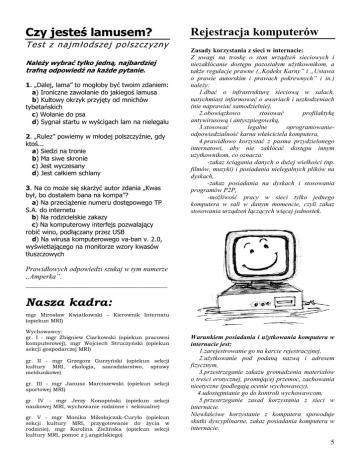 Czy jesteś lamusem? T e s t z n a jm ło d sze j p o ls zcz yz ny NaleŜy wybrać tylko jedną, najbardziej trafną odpowiedź na kaŜde pytanie. 1. „Dalej, lama” to mogłoby być twoim zdaniem: a) Ironiczne zawołanie do jakiegoś lamusa b) Kultowy okrzyk przyjęty od mnichów tybetańskich c) Wołanie do psa d) Sygnał startu w wyścigach lam na nielegalu 2. „Rulez” powiemy w młodej polszczyźnie, gdy ktoś... a) Siedzi na tronie b) Ma siwe skronie c) Jest wyczesany d) Jest całkiem schlany 3. Na co moŜe się skarŜyć autor zdania „Kwas był, bo dostałem bana na kompa”? a) Na przeciąŜenie numeru dostępowego TP S.A. do internetu b) Na rodzicielskie zakazy c) Na komputerowy interfejs pozwalający robić wino, podłączany przez USB d) Na wirusa komputerowego va-ban v. 2.0, wyświetlającego na monitorze wzory kwasów tłuszczowych Rejestracja komputerów Zasady korzystania z sieci w internacie: Z uwagi na troskę o stan urządzeń sieciowych i niezakłócanie dostępu pozostałym uŜytkownikom, a takŜe regulacje prawne („Kodeks Karny” i „Ustawa o prawie autorskim i prawach pokrewnych” i in.) naleŜy: 1.dbać o infrastrukturę sieciową w salach, natychmiast informować o awariach i uszkodzeniach (nie naprawiać samodzielnie), 2.obowiązkowo stosować profilaktykę antywirusową i antyszpiegowską, 3.stosować legalne oprogramowanieodpowiedzialność karna właściciela komputera, 4.prawidłowo korzystać z pasma przydzielonego internatowi, aby nie zakłócać dostępu innym uŜytkownikom, co oznacza: -zakaz ściągania danych o duŜej wielkości (np. filmów, muzyki) i posiadania nielegalnych plików na dyskach, -zakaz posiadania na dyskach i stosowania programów P2P, -moŜliwość pracy w sieci tylko jednego komputera w sali w danym momencie, czyli zakaz stosowania urządzeń łączących więcej jednostek. Prawidłowych odpowiedzi szukaj w tym numerze „Amperka”. _______________________________________ Nasza kadra: mgr Mirosław Kwiatkowski – Kierownik Internatu (opiekun MRI) Wychowawcy: gr. I - mgr Zbigniew Ciarkowski (opiekun pracowni komputerowej), mgr Wojciech Struczyński (opiekun sekcji gospodarczej MRI) gr. II - mgr Grzegorz Gurzyński (opiekun sekcji kultury MRI, ekologia, szaradziarstwo, sprawy meldunkowe) gr. III - mgr Janusz Marciszewski (opiekun sekcji sportowej MRI) gr. IV - mgr Jerzy Konopiński (opiekun sekcji naukowej MRI, wychowanie rodzinne i seksualne) gr. V - mgr Monika Mikołajczak-Curyło (opiekun sekcji kultury MRI, przygotowanie do Ŝycia w rodzinie), mgr Karolina Zielińska (opiekun sekcji kultury MRI, pomoc z j.angielskiego) Warunkiem posiadania i uŜytkowania komputera w internacie jest: 1.zarejestrowanie go na karcie rejestracyjnej, 2.uŜytkowanie pod podaną nazwą i adresem fizycznym, 3.przestrzeganie zakazu gromadzenia materiałów o treści erotycznej, promującej przemoc, zachowania nieetyczne (podlegają ocenie wychowawcy), 4.udostępnianie go do kontroli wychowawcom, 5.przestrzeganie zasad korzystania z sieci w internacie. Niewłaściwe korzystanie z komputera spowoduje skutki dyscyplinarne, zakaz posiadania komputera w internacie. 5