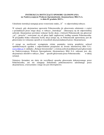 INSTRUKCJA DOTYCZĄCE SPOSOBU GŁOSOWANIA na Nadzwyczajnym Walnym Zgromadzeniu Akcjonariuszy Blirt S.A. w dniu 01 grudnia 2015 r. Udzielenie instrukcji następuje przez wstawienie znaku „X” w odpowiedniej rubryce. W sytuacji, gdy akcjonariusz upoważni Pełnomocnika do głosowania odmiennie z części z posiadanych przez niego akcji, w rubryce „Instrukcja” odnoszącej się do odpowiedniej uchwały Akcjonariusz powinien wskazać liczby akcji, z których Pełnomocnik ma głosować „za”, „przeciw”, wstrzymać się od głosu bądź zagłosować według uznania Pełnomocnika. W przypadku braku wskazania liczby akcji uznaje się, że Pełnomocnik uprawniony jest do głosowania we wskazany sposób ze wszystkich akcji posiadanych przez Akcjonariusza. Z uwagi na możliwość wystąpienia różnic pomiędzy treścią projektów uchwał opublikowanych zgodnie z odpowiednimi przepisami na stronie internetowej Blirt S.A.: www.blirt.eu w zakładce „Relacje Inwestorskie”, a treścią uchwał poddanych pod głosowanie na Nadzwyczajnym Walnym Zgromadzeniu Akcjonariuszy Blirt S.A. zalecane jest, aby akcjonariusz określił w rubryce „Inne” sposób głosowania przez Pełnomocnika w takiej sytuacji. Niniejszy formularz nie służy do weryfikacji sposobu głosowania dokonywanego przez Pełnomocnika, ani nie zastępuje dokumentu pełnomocnictwa udzielanego przez akcjonariusza, a korzystanie z niego nie jest obowiązkowe. INSTRUKCJE DOTYCZĄCE SPOSOBU GŁOSOWANIA NA NWZA BLIRT S.A. w dniu 01 grudnia 2015 r. AKCJONARIUSZ: ………………………………………………… (dane) PEŁNOMOCNIK: ………………………………………………… (dane) UCHWAŁA NR 1 w sprawie wyboru Przewodniczącego Nadzwyczajnego Walnego Zgromadzenia □ ZA □ PRZECIW □ WSTRZYMUJĘ □ WEDŁUG SIĘ UZNANIA PEŁNOMOCNIKA Liczba akcji: Liczba akcji: □ ZGŁOSZENIE Liczba akcji: …………………… SPRZECIWU Liczba akcji: …………………… …………………… ……………………… □ INNE UCHWAŁA NR 2 w sprawie wyboru Komisji Skrutacyjnej □ ZA □ PRZECIW □ WSTRZYMUJĘ □ WEDŁUG SIĘ UZNANIA PEŁNOMOCNIKA Liczba akcji: Liczba akcji: □ ZGŁOSZENIE Liczba akcji: …………………… SPRZECIWU Liczba akcji: ……………………… □ INNE …………………… …………………… UCHWAŁA NR 3 w sprawie przyjęcia porządku obrad □ ZA □ PRZECIW □ WSTRZYMUJĘ □ WEDŁUG SIĘ UZNANIA PEŁNOMOCNIKA Liczba akcji: Liczba akcji: □ ZGŁOSZENIE Liczba akcji: SPRZECIWU …………………… Liczba akcji: …………………… …………………… ……………………… □ INNE UCHWAŁA NR 4 w sprawie emisji warrantów subskrypcyjnych, warunkowego podwyższenia kapitału zakładowego Spółki, wyłączenia prawa poboru dotychczasowych akcjonariuszy Spółki, upoważnienia dla organów Spółki oraz zmiany Statutu Spółki □ ZA □ PRZECIW □ WSTRZYMUJĘ □ WEDŁUG SIĘ UZNANIA PEŁNOMOCNIKA Liczba akcji: Liczba akcji: □ ZGŁOSZENIE Liczba akcji: …………………… SPRZECIWU Liczba akcji: ……………………… □ INNE …………………… …………………… UCHWAŁA NR 5 w sprawie zmiany § 27 Statutu Spółki oraz upoważnienia Rady Nadzorczej do ustalenia tekstu jednolitego Statutu Spółki □ ZA □ PRZECIW □ WSTRZYMUJĘ □ WEDŁUG SIĘ UZNANIA PEŁNOMOCNIKA Liczba akcji: Liczba akcji: □ ZGŁOSZENIE Liczba akcji: SPRZECIWU …………………… Liczba akcji: ……………………… □ INNE …………………… ……………………