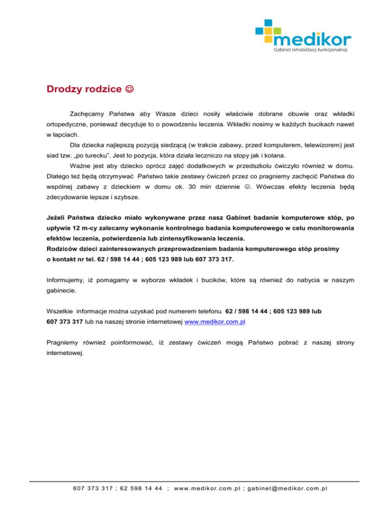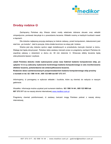 Drodzy rodzice Zachęcamy Państwa aby Wasze dzieci nosiły właściwie dobrane obuwie oraz wkładki ortopedyczne, ponieważ decyduje to o powodzeniu leczenia. Wkładki nosimy w każdych bucikach nawet w łapciach. Dla dziecka najlepszą pozycją siedzącą (w trakcie zabawy, przed komputerem, telewizorem) jest siad tzw. „po turecku”. Jest to pozycja, która działa leczniczo na stopy jak i kolana. Ważne jest aby dziecko oprócz zajęć dodatkowych w przedszkolu ćwiczyło również w domu. Dlatego też będą otrzymywać Państwo takie zestawy ćwiczeń przez co pragniemy zachęcić Państwa do wspólnej zabawy z dzieckiem w domu ok. 30 min dziennie . Wówczas efekty leczenia będą zdecydowanie lepsze i szybsze. Jeżeli Państwa dziecko miało wykonywane przez nasz Gabinet badanie komputerowe stóp, po upływie 12 m-cy zalecamy wykonanie kontrolnego badania komputerowego w celu monitorowania efektów leczenia, potwierdzenia lub zintensyfikowania leczenia. Rodziców dzieci zainteresowanych przeprowadzeniem badania komputerowego stóp prosimy o kontakt nr tel. 62 / 598 14 44 ; 605 123 989 lub 607 373 317. Informujemy, iż pomagamy w wyborze wkładek i bucików, które są również do nabycia w naszym gabinecie. Wszelkie informacje można uzyskać pod numerem telefonu 62 / 598 14 44 ; 605 123 989 lub 607 373 317 lub na naszej stronie internetowej www.medikor.com.pl Pragniemy również poinformować, iż zestawy ćwiczeń mogą Państwo pobrać z naszej strony internetowej. 607 373 317 ; 62 598 14 44 ; www.medikor.com.p l ; [email protected] www.facebook.com/gabinet.medikor Opis ćwiczenia Czas Uwagi Pozycja wyjściowa: siedząca, kolana zgięte, stopy blisko siebie, przed dzieckiem leży rozłożona szarfa. Przed dzieckiem może leżeć więcej szarf. Ruch: paluszkami stóp dziecko zwija szarfę pod stopy, następnie naśladuje stopami ręczne pranie, chwyta paluszkami stóp szarfę i rozwiesza na lince( linę np.: trzymają rodzice). Pranie P.w.: siedząca, kolana zgięte, przed dzieckiem leży kawałek rozłożonej folii i na niej położony jest woreczek. Zabawy z folią Rzucanie woreczkiem do celu Ruch: dziecko kładzie stopy na woreczku zaciska paluszki i prasuje woreczkiem folię. Następnie zgniata stopami folię tak, aby powstała kulka; kula kulkę pod stopami zaciskając paluszki, następnie wstaje mając przez cały czas zaciśnięte palce stóp i przy muzyce kula ją od stopy do stopy. P.w.: leżenie na plecach, w stopach dziecko trzyma woreczek. Za głową dziecka siedzi rodzic i trzyma np. miskę Ruch: zadaniem dziecka jest trafić woreczkiem do celu za głową. ok. 1min Na każde ćwicze nie Folia aluminiowa ok. 2min Zamiast woreczka może być maskotka. Kolana ustawione szeroko. P.w.: siedząca, nogi zgięte, stopy blisko siebie. Rodzic siedzi naprzeciwko dziecka ,pomiędzy nimi leży rozłożona wzdłuż szarfa. Przeciąganie szarfy Ruch: stopy kładziemy na końce szarfy i wykonujemy ruch przeciągania jej stopami do siebie. Głównie pracują tutaj palce stóp. Staramy się aby druga osoba nie zabrała nam szarfy na swoją stronę. ok. 2min Potrzebna jest piłka i dwie bramki. Ważne, aby palce stóp były zaciśnięte a dziecko kopało piłkę wew. częścią stopy. P.w.: stojąca, palce stóp zaciśnięte. Piłka nożna Karmienie gąsieniczki Ruch: dziecko wraz z rodzicem rozgrywają mecz. P.w.: stojąca, palce stóp zaciśnięte. Rodzic siedzi w pewnej odległości od dziecka i ma przy sobie jedzonko dla gąsieniczki. Ruch: dziecko na stojąco naśladując ruchy gąsieniczki idzie w kierunku rodzica aby zdobyć jedzenie. Stopy są blisko siebie. P.w.: siedząca, kolana zgięte, stopy blisko siebie. Przed dzieckiem leżą różne przedmioty( szarfy, woreczki, skarpetki, szalik ,czapki) ok. 2min Ubieranie Ruch: zadaniem dziecka jest ubrać rodzica ale używając do tego tylko swoich stóp. P.w.: stojąca, stopy ustawione w literkę V, palce zaciśnięte, dziecko stoi w środku szarfy. Rodzic tak samo. Wyścig Ruch: wyścigi kto pierwszy przełoży szarfę przez siebie w górę i odwrotnie. ok. 2min 607 373 317 ; 62 598 14 44 ; www.medikor.com.p l ; [email protected]