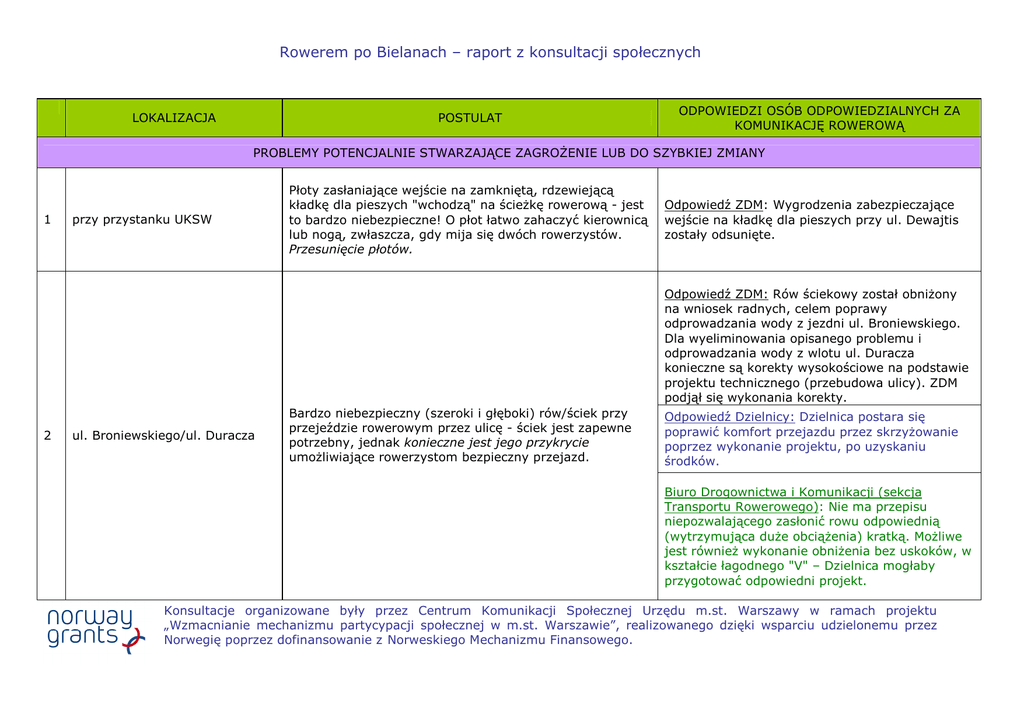 Rowerem po Bielanach – raport z konsultacji społecznych LOKALIZACJA POSTULAT ODPOWIEDZI OSÓB ODPOWIEDZIALNYCH ZA KOMUNIKACJĘ ROWEROWĄ PROBLEMY POTENCJALNIE STWARZAJĄCE ZAGROśENIE LUB DO SZYBKIEJ ZMIANY 1 przy przystanku UKSW Płoty zasłaniające wejście na zamkniętą, rdzewiejącą kładkę dla pieszych "wchodzą" na ścieŜkę rowerową - jest to bardzo niebezpieczne! O płot łatwo zahaczyć kierownicą lub nogą, zwłaszcza, gdy mija się dwóch rowerzystów. Przesunięcie płotów. Odpowiedź ZDM: Wygrodzenia zabezpieczające wejście na kładkę dla pieszych przy ul. Dewajtis zostały odsunięte. Odpowiedź ZDM: Rów ściekowy został obniŜony na wniosek radnych, celem poprawy odprowadzania wody z jezdni ul. Broniewskiego. Dla wyeliminowania opisanego problemu i odprowadzania wody z wlotu ul. Duracza konieczne są korekty wysokościowe na podstawie projektu technicznego (przebudowa ulicy). ZDM podjął się wykonania korekty. 2 ul. Broniewskiego/ul. Duracza Bardzo niebezpieczny (szeroki i głęboki) rów/ściek przy przejeździe rowerowym przez ulicę - ściek jest zapewne potrzebny, jednak konieczne jest jego przykrycie umoŜliwiające rowerzystom bezpieczny przejazd. Odpowiedź Dzielnicy: Dzielnica postara się poprawić komfort przejazdu przez skrzyŜowanie poprzez wykonanie projektu, po uzyskaniu środków. Biuro Drogownictwa i Komunikacji (sekcja Transportu Rowerowego): Nie ma przepisu niepozwalającego zasłonić rowu odpowiednią (wytrzymująca duŜe obciąŜenia) kratką. MoŜliwe jest równieŜ wykonanie obniŜenia bez uskoków, w kształcie łagodnego "V" – Dzielnica mogłaby przygotować odpowiedni projekt. Konsultacje organizowane były przez Centrum Komunikacji Społecznej Urzędu m.st. Warszawy w ramach projektu „Wzmacnianie mechanizmu partycypacji społecznej w m.st. Warszawie”, realizowanego dzięki wsparciu udzielonemu przez Norwegię poprzez dofinansowanie z Norweskiego Mechanizmu Finansowego. Rowerem po Bielanach – raport z konsultacji społecznych Odpowiedź ZDM: Komora ciepłownicza przy ścieŜce rowerowej została oznakowana oznakowaniem U-9b. Szlak rowerowy wzdłuŜ WybrzeŜa Gdyńskiego Betonowe urządzenie zapory wodnej "zahacza" o drogę rowerową - jest to bardzo niebezpieczne! Konieczne jest oznaczenie go widoczną z daleka pomarańczową farbą oraz poziome oznakowanie zwęŜającego się pasa ruchu. 4 WybrzeŜe Gdyńskie - inf. o budowie Znak informujący o braku przejazdu z powodu budowy MOSTU PÓŁNOCNEGO stoi w złym miejscu! Osoby przejeŜdŜające pod wiaduktem mijają go z daleka i nie wiedzą o zamknięciu szlaku - a w tym miejscu rowerzyści mogliby zdecydować o pojechaniu objazdem. Przesunięcie znaku. Odpowiedź Dzielnicy: Dzielnica przekaŜe ten postulat do Zarządu Miejskich Inwestycji Drogowych. 5 budowa Mostu Północnego brak wytyczonego szlaku alternatywnego (czasowego objazdu budowy) - wytyczenie objazdu, informacja o urywającym się szlaku. Odpowiedź Dzielnicy: Dzielnica przekaŜe ten postulat do Zarządu Miejskich Inwestycji Drogowych. 3 6 ul. Pułkowa między Heroldów a zgrupowania AK Kampinos Znak drogowy (wskazujący kierowcom kierunek śoliborz) nie jest wystarczająco oddalony od drogi rowerowej (wymagana skrajnia 2,5m). Jadąc na rowerze moŜna zawadzić głową o krawędź znaku. Przesunięcie znaku. Odpowiedź Dzielnicy: Po zakończeniu sezonu zimowego dzielnica postara się o środki finansowe na wymalowanie pasa informującego o zawęŜaniu się ścieŜki. Odpowiedź ZDM: Uwagi dotyczące uszkodzonych, przekrzywionych, obróconych względem sztycy pionowych znaków drogowych naleŜy zgłaszać bezpośrednio do Pogotowia Drogowego ZDM, tel. 22 19 633. Odpowiedź Dzielnicy: Dzielnica zgłosiła ten przypadek do Pogotowia Drogowego. Konsultacje organizowane były przez Centrum Komunikacji Społecznej Urzędu m.st. Warszawy w ramach projektu „Wzmacnianie mechanizmu partycypacji społecznej w m.st. Warszawie”, realizowanego dzięki wsparciu udzielonemu przez Norwegię poprzez dofinansowanie z Norweskiego Mechanizmu Finansowego. Rowerem po Bielanach – raport z konsultacji społecznych 7 Marymoncka/Dorycka przystanek autobusowy Płotek odgradzający przystanek autobusowy od ścieŜki jest za blisko drogi rowerowej. Konieczne jest odsunięcie lub usunięcie ogrodzenia - ponadto ogrodzenie ma ostre krawędzie, przez co jest niebezpieczne dla rowerzystów (tego typu ogrodzenia powinno się budować z zaokrąglonych rurek). Odpowiedź ZDM: ŚcieŜka rowerowa w ul. Marymonckiej jest inwestycją Zarządu Miejskich Inwestycji Drogowych i nie została przekazana dotychczas do eksploatacji tut. Zarządowi. W związku z powyŜszym, postulaty dotyczące nieprawidłowości na tej ścieŜce rowerowej naleŜy zgłaszać do ZMID. Odpowiedź Dzielnicy: Dzielnica przekaŜe ten postulat do Zarządu Miejskich Inwestycji Drogowych 8 ul. Kampinowska (Las Bemowski) trzy znaki zakazujące wjazdu rowerzystom pomimo wytyczonego szlaku rowerowego - dodanie tabliczki T-22 (z symbolem roweru i napisem: nie dotyczy). Odpowiedź Dzielnicy: Wydział Infrastruktury (zajmujący się organizacją ruchu na terenie ulic gminnych w dzielnicy Bielany) otrzymał zgłoszenie i obiecał zająć się sprawą. 9 Perzyńskiego/Staffa zbyt wysoki krawęŜnik w ciągu rowerowym - skucie krawęŜników Odpowiedź Dzielnicy: W sezonie letnim krawęŜnik zostanie obniŜony. 10 Perzyńskiego/śeromskiego zasłonięte światła na przejeździe rowerowym Odpowiedź Dzielnicy: Dzielnica Bielany będzie się starać o środki finansowe na zakończenie inwestycji. 11 ul. Perzyńskiego między Staffa a Nałkowskiej brak organizacji ruchu przy budowie, piesi i samochody są na ścieŜce, mimo Ŝe nie ma Ŝadnych znaków informujących o tym - odpowiednia organizacja ruchu. Odpowiedź Dzielnicy: Budowa jest w duŜym stopniu zaawansowana. Po zakończeniu budowy ścieŜka zostanie odtworzona i wykonana stała organizacja ruchu. Conrada róg Reymonta (od strony