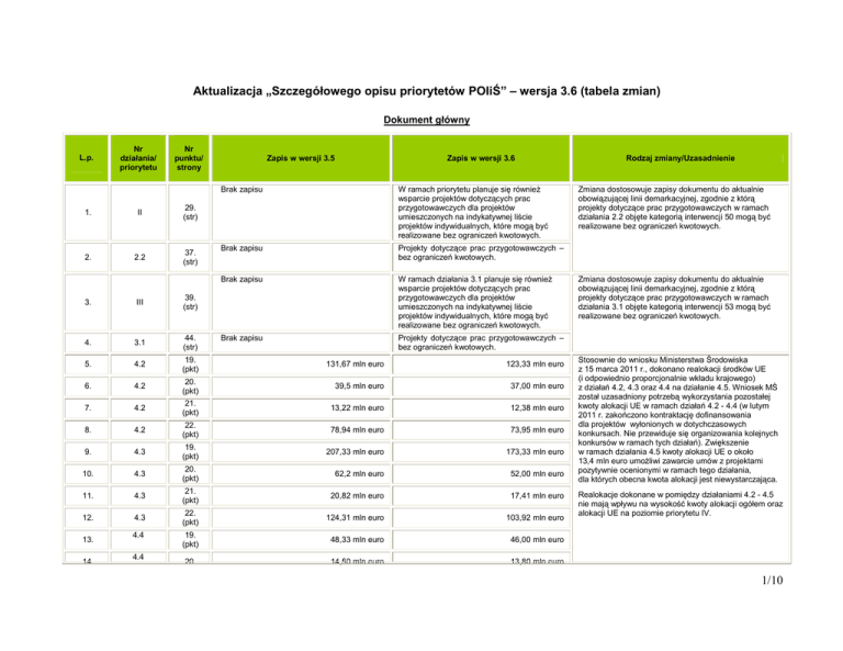 Aktualizacja „Szczegółowego opisu priorytetów POIiŚ” – wersja 3.6 (tabela zmian) Dokument główny L.p. Nr działania/ priorytetu Nr punktu/ strony 1. II 29. (str) 2. 2.2 37. (str) Zapis w wersji 3.5 Zapis w wersji 3.6 Brak zapisu W ramach priorytetu planuje się równieŜ wsparcie projektów dotyczących prac przygotowawczych dla projektów umieszczonych na indykatywnej liście projektów indywidualnych, które mogą być realizowane bez ograniczeń kwotowych. Brak zapisu Projekty dotyczące prac przygotowawczych – bez ograniczeń kwotowych. Brak zapisu W ramach działania 3.1 planuje się równieŜ wsparcie projektów dotyczących prac przygotowawczych dla projektów umieszczonych na indykatywnej liście projektów indywidualnych, które mogą być realizowane bez ograniczeń kwotowych. Brak zapisu Projekty dotyczące prac przygotowawczych – bez ograniczeń kwotowych. 3. III 39. (str) 4. 3.1 44. (str) 5. 4.2 19. (pkt) 131,67 mln euro 123,33 mln euro 6. 4.2 20. (pkt) 39,5 mln euro 37,00 mln euro 7. 4.2 21. (pkt) 13,22 mln euro 12,38 mln euro 8. 4.2 22. (pkt) 78,94 mln euro 73,95 mln euro 9. 4.3 19. (pkt) 207,33 mln euro 173,33 mln euro 10. 4.3 20. (pkt) 62,2 mln euro 52,00 mln euro 11. 4.3 21. (pkt) 20,82 mln euro 17,41 mln euro 12. 4.3 22. (pkt) 124,31 mln euro 103,92 mln euro 19. (pkt) 48,33 mln euro 46,00 mln euro 20. 14,50 mln euro 13,80 mln euro 13. 14. 4.4 4.4 Rodzaj zmiany/Uzasadnienie Zmiana dostosowuje zapisy dokumentu do aktualnie obowiązującej linii demarkacyjnej, zgodnie z którą projekty dotyczące prac przygotowawczych w ramach działania 2.2 objęte kategorią interwencji 50 mogą być realizowane bez ograniczeń kwotowych. Zmiana dostosowuje zapisy dokumentu do aktualnie obowiązującej linii demarkacyjnej, zgodnie z którą projekty dotyczące prac przygotowawczych w ramach działania 3.1 objęte kategorią interwencji 53 mogą być realizowane bez ograniczeń kwotowych. Stosownie do wniosku Ministerstwa Środowiska z 15 marca 2011 r., dokonano realokacji środków UE (i odpowiednio proporcjonalnie wkładu krajowego) z działań 4.2, 4.3 oraz 4.4 na działanie 4.5. Wniosek MŚ został uzasadniony potrzebą wykorzystania pozostałej kwoty alokacji UE w ramach działań 4.2 - 4.4 (w lutym 2011 r. zakończono kontraktację dofinansowania dla projektów wyłonionych w dotychczasowych konkursach. Nie przewiduje się organizowania kolejnych konkursów w ramach tych działań). Zwiększenie w ramach działania 4.5 kwoty alokacji UE o około 13,4 mln euro umoŜliwi zawarcie umów z projektami pozytywnie ocenionymi w ramach tego działania, dla których obecna kwota alokacji jest niewystarczająca. Realokacje dokonane w pomiędzy działaniami 4.2 - 4.5 nie mają wpływu na wysokość kwoty alokacji ogółem oraz alokacji UE na poziomie priorytetu IV. 1/10 (pkt) 15. 16. 17. 18. 19. 20. 21. 22. 23. 24. 25. 26. 4.4 21. (pkt) 4,85 mln euro 4,62 mln euro 4.4 22. (pkt) 28,98 mln euro 27,58 mln euro 19. (pkt) 225,53 mln euro 270,20 mln euro 4.5 20. (pkt) 67,36 mln euro 80,76 mln euro 4.5 21. (pkt) 22,69 mln euro 27,17 mln euro 4.5 22. (pkt) 135,48 mln euro 162,27 mln euro 19. (pkt) 61,41mln euro 67,26 mln euro 5.1 20. (pkt) 52,20 mln euro 57,17 mln euro 5.1 21. (pkt) 9,21 mln euro 10,09 mln euro 19. (pkt) 16,02 mln euro 8,67 mln euro 5.2 20. (pkt) 13,62 mln euro 7,37 mln euro 5.2 21. (pkt) 2,40 mln euro 1,30 mln euro 4.5 5.1 5.2 27. 5.3 19. (pkt) 17,65 mln euro 19,15 mln euro 28. 5.3 20. (pkt) 15,00 mln euro 16,28 mln euro 29. 5.3 21. (pkt) 2,65 mln euro 2,87 mln euro 6.1 19. (pkt) 8 749,96 mln euro 8 929,15 mln euro 6.1 20. (pkt) 7 437,47 mln euro 7 589,78 mln euro 6.1 21. (pkt) 1 312,49 mln euro 1 339,37 mln euro 6.2 19. (pkt) 1 189,90 mln euro 1 010,71 mln euro 20. 1 011,41 mln euro 859,10 mln euro 30. 31. 32. 33. 34. 6.2 Stosownie do wniosku Ministerstwa Środowiska z 18 stycznia i 15 marca 2011 r., dokonano realokacji środków UE (i odpowiednio proporcjonalnie wkładu krajowego) z działania 5.2 na działanie 5.1 i 5.3. Wniosek MŚ został uzasadniony rezygnacją beneficjenta z realizacji projektu POII.05.02.00-00-183/09 Zwiększenie droŜności korytarza ekologicznego środkowej Odry w okolicach budowanego stopnia wodnego Malczyce oraz brakiem kolejnych konkursów w ramach tego działania. Zwiększenie w ramach działania 5.1 kwoty alokacji UE o około 1,28 mln euro umoŜliwi wsparcie obecnie realizowanych projektów, które w związku ze zwiększeniem się stawek VAT wobec działań związanych z wykonywaniem planów zadań ochronnych oraz planów ochrony dla obszarów chronionych przyjmowały zgodnie z dotychczasową wykładnią stawkę zero. Zwiększenie w ramach działania 5.3 kwoty alokacji UE o około 4,97 mln euro umoŜliwi realizację pozytywnie ocenionych projektów wybranych w konkursach ogłoszonych w 2009 i 2010 r. (znajdujących się obecnie na listach rezerwowych). Realokacje dokonane w pomiędzy działaniami 5.1-5.3 nie mają wpływu na wysokość kwoty alokacji ogółem oraz alokacji UE na poziomie priorytetu V. W ramach działania 6.2 będą realizowane tylko trzy projekty o szacunkowej łącznej kwocie dofinansowania 3 391,8 mln PLN. W ramach tego działania nie przewiduje się realizacji innych projektów. NadwyŜka alokacji w 6.2 w wysokości 152 311 324 euro zostaje realokowana na działanie 6.1 gdzie istnieje większy potencjał absorpcji środków (przekroczenie na liście podstawowej LPI w 6.1). Realokacje dokonane w pomiędzy działaniami 6.1 oraz 6.2 nie mają wpływu na wysokość kwoty alokacji ogółem 2/10 oraz alokacji UE na poziomie priorytetu VI. (pkt) 35. 6.2 21. (pkt) 36. 7.1 14. (pkt) 37. 7.1 23. (pkt) 7.3 23. (pkt) 38. 39. X 178,48 mln euro Wybudowanie zaplecza technicznego i/lub jego wyposaŜenie w niezbędną infrastrukturę słuŜącą do utrzymania zakupionego lub zmodernizowanego taboru, o których mowa w punkcie 4 – 7. 151,61 mln euro Wybudowanie zaplecza technicznego i/lub jego wyposaŜenie w niezbędną infrastruktu