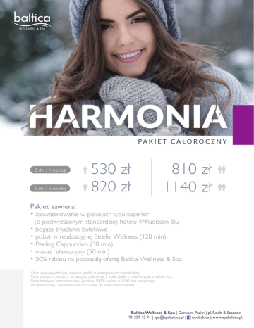 PA K I E T C A ŁO RO C Z N Y 2 dni / 1 nocleg 3 dni / 2 noclegi 530 zł 820 zł 810 zł 1140 zł Pakiet zawiera: • zakwaterowanie w pokojach typu superior (o podwyższonym standardzie) hotelu 4*Radisson Blu • bogate śniadanie bufetowe • pobyt w relaksacyjnej Strefie Wellness (120 min) • Peeling Cappuccino (30 min) • masaż relaksacyjny (50 min) • 20% rabatu na pozostałą ofertę Baltica Wellness & Spa Ceny dotyczą pokoi typu superior (pokój o podwyższonym standardzie). Cena pakietu w pokoju 2–os. dotyczy pobytu dla 2 osób. Każda z osób korzysta z pakietu Spa. Doba hotelowa rozpoczyna się o godzinie 15:00 i kończy o 12:00 dnia następnego. W cenie noclegu: bezpłatne wi-fi oraz wstęp do klubu Fitness World. Baltica Wellness & Spa | Centrum Pazim | pl. Rodła 8, Szczecin 91 359 45 91 | [email protected] | /spabaltica | www.spabaltica.pl