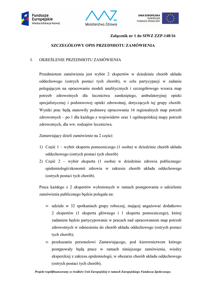 Załącznik nr 1 do SIWZ ZZP-148/16 SZCZEGÓŁOWY OPIS PRZEDMIOTU ZAMÓWIENIA I. OKREŚLENIE PRZEDMIOTU ZAMÓWIENIA Przedmiotem zamówienia jest wybór 2 ekspertów w dziedzinie chorób układu oddechowego (ostrych postaci tych chorób), w celu partycypacji w zadaniu polegającym na opracowaniu modeli analitycznych i szczegółowego wzorca map potrzeb zdrowotnych dla lecznictwa zamkniętego, ambulatoryjnej opieki specjalistycznej i podstawowej opieki zdrowotnej, dotyczących tej grupy chorób. Wyniki prac będą stanowiły podstawę opracowania 16 regionalnych map potrzeb zdrowotnych – po 1 dla każdego z województw oraz 1 ogólnopolskiej mapy potrzeb zdrowotnych, dla ww. rodzajów lecznictwa. Zamawiający dzieli zamówienie na 2 części: 1) Część 1 – wybór eksperta pomocniczego (1 osoba) w dziedzinie chorób układu oddechowego (ostrych postaci tych chorób) 2) Część 2 – wybór eksperta (1 osoba) w dziedzinie zdrowia publicznego/ epidemiologii/ekonomii zdrowia w zakresie chorób układu oddechowego (ostrych postaci tych chorób). Praca każdego z 2 ekspertów wyłonionych w ramach postępowania o udzielenie zamówienia publicznego będzie polegała na: • udziale w 32 spotkaniach grupy roboczej, mającej angażować dodatkowo 2 ekspertów (1 eksperta głównego i 1 eksperta pomocniczego), której zadaniem będzie partycypowanie w pracach nad opracowaniem map potrzeb zdrowotnych w odniesieniu do chorób układu oddechowego (ostrych postaci tych chorób); • przekazaniu personelowi Zamawiającego, pod kierownictwem którego postępowały będą prace w ramach niniejszego zamówienia, wiedzy eksperckiej z zakresu epidemiologii, w obszarze chorób układu oddechowego (ostrych postaci tych chorób); Projekt współfinansowany ze środków Unii Europejskiej w ramach Europejskiego Funduszu Społecznego. • przekazaniu w sposób przystępny i zwięzły wiedzy na temat postepowań medycznych typowych dla tej grupy chorób; • dzieleniu się wiedzą ekspercką z zakresu epidemiologii z pozostałymi ekspertami zaangażowanymi w proces opracowywania mapy potrzeb zdrowotnych; • aktywnym udziale w opracowaniu wzorca mapy potrzeb zdrowotnych, zgodnie z podziałem pracy ustalonym w trybie roboczym przez Zamawiającego, stosownie do kompetencji eksperta; • terminowej realizacji prac i przygotowywaniu stosownych materiałów, celem osiągnięcia stanu produktywnej i efektywnej współpracy; • weryfikacji merytorycznej opracowanego wzorca mapy potrzeb zdrowotnych, w opracowywaniu której ekspert ten brał udział. II. Informacja o projekcie Zamówienie realizowane jest w ramach projektu pn. „Mapy potrzeb zdrowotnych – Baza Analiz Systemowych i Wdrożeniowych”, współfinansowanego przez Unię Europejską ze środków Europejskiego Funduszu Społecznego w ramach Programu Operacyjnego Wiedza Edukacja Rozwój. Celem nadrzędnym projektu jest stworzenie systemu mapowania potrzeb zdrowotnych w zakresie 30 grup chorób oraz opracowania bazy analiz systemowych i wdrożeniowych w tym zakresie. System mapowania potrzeb zdrowotnych pozwoli na lepsze zarządzanie środkami publicznymi w ochronie zdrowia, umożliwi wsparcie ich dystrybucji zgodnie z aktualnymi i prognozowanymi potrzebami zdrowotnymi pacjentów. System ten będzie również wspierał podejmowanie decyzji zarządczych i kreowanie polityk w oparciu o fakty. III. ZAKRES CZASOWY I TERYTORIALNY REALIZACJI PRZEDMIOTU ZAMÓWIENIA Każdy z ekspertów weźmie udział w nie więcej niż 32 spotkaniach grup roboczych, w podziale na lata 2016 r. i 2017 r. Spotkania będą się odbywać w czwartki, zgodnie z ustalonym przez Zamawiającego harmonogramem. Wstępny harmonogram, zawierający daty spotkań, zostanie Wykonawcy przekazany razem z projektem umowy do podpisu. Projekt współfinansowany ze środków Unii Europejskiej w ramach Europejskiego Funduszu Społecznego. 2 Zamawiający ma prawo zmiany dni spotkań i harmonogramu, o czym poinformuje Wykonawcę najpóźniej na 2 dni wcześniej. Zamawiający ma prawo zmienić datę spotkania również w terminie późniejszym, po dokonaniu stosowanych uzgodnień z Wykonawcami. Maksymalny czas jednego spotkania to 8 godzin zegarowych. IV. Zakres przedmiotu zamówienia 1) Ekspert pomocniczy w ramach pracy w grupie roboczej ds. chorób układu oddechowego (ostrych postaci tych chorób): a) będzie uczestniczył w przygotowaniu i zaprezentowaniu materiału analitycznego na temat 3 głównych (np. najbardziej istotnych, najczęstszych, najbardziej obciążających dla systemu ochrony zdrowia) problemów zdrowotnych w zakresie tej grupy chorób, b) będzie uczestniczył w przygotowaniu i przedstawieniu uproszczonych schematów postepowań klinicznych dotyczących tej grupy chorób, wraz ze wskazaniem odpowiednich standardów krajowych i/lub zagranicznych towarzystw medycznych w tym przedmiocie, c) będzie uczestniczył w dokonaniu wskazania kodów ICD-10 reprezentujących jednostki chorobowe w ramach chorób układu oddechowego (ostrych postaci tych chorób), d) będzie uczestniczył w dokonaniu wyodrębnienia w tej grupie chorób podgrup chorób zbliżonych pod względem postępowania medycznego, e) będzie uczestniczył w zdefiniowaniu i przedstawieniu wskaźników ilościowych pozwalających opisać jakość leczenia w obrębie tej grupy chorób, f) na potrzeby stworzenia modelu będzie uczestniczył w procesie zdiagnozowania i przedstawienia trendów zmian w obszarze leczenia tej grupy chorób, włącznie z przedstawieniem fachowej literatury naukowej – polskiej i/lub zagranicznej, g) będzie uczestniczył w przygotowaniu i przedstawieniu interpretacji danych dostępnych w bazach danych NFZ, dotyczących leczenia w zakresie tej grupy chorób, h) będzie uczestniczył w pozyskaniu i przedstawieniu danych dotyczących leczenia w zakresie tej grupy chorób, pochodzących z innych źródeł, niż bazy NFZ. Projekt współfinansowany ze środków Unii Europejskiej w ramach Europejskiego Fundus