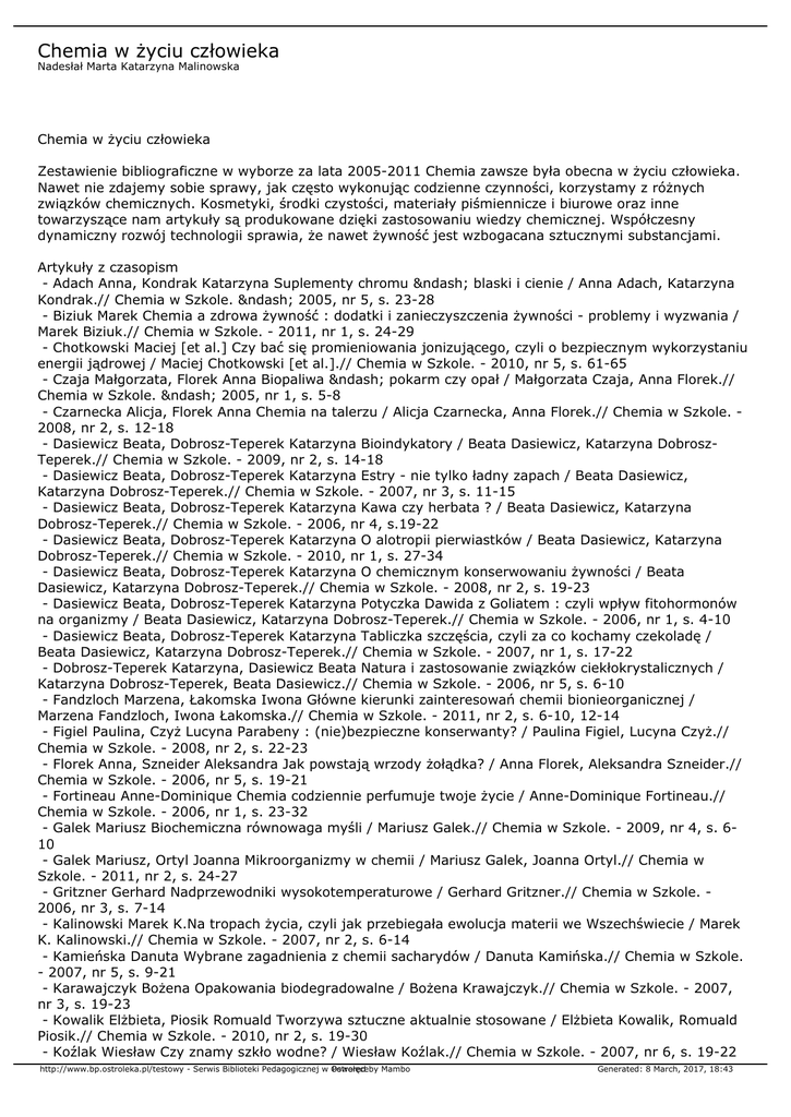Chemia w życiu człowieka Nadesłał Marta Katarzyna Malinowska Chemia w życiu człowieka Zestawienie bibliograficzne w wyborze za lata 2005-2011 Chemia zawsze była obecna w życiu człowieka. Nawet nie zdajemy sobie sprawy, jak często wykonując codzienne czynności, korzystamy z różnych związków chemicznych. Kosmetyki, środki czystości, materiały piśmiennicze i biurowe oraz inne towarzyszące nam artykuły są produkowane dzięki zastosowaniu wiedzy chemicznej. Współczesny dynamiczny rozwój technologii sprawia, że nawet żywność jest wzbogacana sztucznymi substancjami. Artykuły z czasopism - Adach Anna, Kondrak Katarzyna Suplementy chromu – blaski i cienie / Anna Adach, Katarzyna Kondrak.// Chemia w Szkole. – 2005, nr 5, s. 23-28 - Biziuk Marek Chemia a zdrowa żywność : dodatki i zanieczyszczenia żywności - problemy i wyzwania / Marek Biziuk.// Chemia w Szkole. - 2011, nr 1, s. 24-29 - Chotkowski Maciej [et al.] Czy bać się promieniowania jonizującego, czyli o bezpiecznym wykorzystaniu energii jądrowej / Maciej Chotkowski [et al.].// Chemia w Szkole. - 2010, nr 5, s. 61-65 - Czaja Małgorzata, Florek Anna Biopaliwa – pokarm czy opał / Małgorzata Czaja, Anna Florek.// Chemia w Szkole. – 2005, nr 1, s. 5-8 - Czarnecka Alicja, Florek Anna Chemia na talerzu / Alicja Czarnecka, Anna Florek.// Chemia w Szkole. 2008, nr 2, s. 12-18 - Dasiewicz Beata, Dobrosz-Teperek Katarzyna Bioindykatory / Beata Dasiewicz, Katarzyna DobroszTeperek.// Chemia w Szkole. - 2009, nr 2, s. 14-18 - Dasiewicz Beata, Dobrosz-Teperek Katarzyna Estry - nie tylko ładny zapach / Beata Dasiewicz, Katarzyna Dobrosz-Teperek.// Chemia w Szkole. - 2007, nr 3, s. 11-15 - Dasiewicz Beata, Dobrosz-Teperek Katarzyna Kawa czy herbata ? / Beata Dasiewicz, Katarzyna Dobrosz-Teperek.// Chemia w Szkole. - 2006, nr 4, s.19-22 - Dasiewicz Beata, Dobrosz-Teperek Katarzyna O alotropii pierwiastków / Beata Dasiewicz, Katarzyna Dobrosz-Teperek.// Chemia w Szkole. - 2010, nr 1, s. 27-34 - Dasiewicz Beata, Dobrosz-Teperek Katarzyna O chemicznym konserwowaniu żywności / Beata Dasiewicz, Katarzyna Dobrosz-Teperek.// Chemia w Szkole. - 2008, nr 2, s. 19-23 - Dasiewicz Beata, Dobrosz-Teperek Katarzyna Potyczka Dawida z Goliatem : czyli wpływ fitohormonów na organizmy / Beata Dasiewicz, Katarzyna Dobrosz-Teperek.// Chemia w Szkole. - 2006, nr 1, s. 4-10 - Dasiewicz Beata, Dobrosz-Teperek Katarzyna Tabliczka szczęścia, czyli za co kochamy czekoladę / Beata Dasiewicz, Katarzyna Dobrosz-Teperek.// Chemia w Szkole. - 2007, nr 1, s. 17-22 - Dobrosz-Teperek Katarzyna, Dasiewicz Beata Natura i zastosowanie związków ciekłokrystalicznych / Katarzyna Dobrosz-Teperek, Beata Dasiewicz.// Chemia w Szkole. - 2006, nr 5, s. 6-10 - Fandzloch Marzena, Łakomska Iwona Główne kierunki zainteresowań chemii bionieorganicznej / Marzena Fandzloch, Iwona Łakomska.// Chemia w Szkole. - 2011, nr 2, s. 6-10, 12-14 - Figiel Paulina, Czyż Lucyna Parabeny : (nie)bezpieczne konserwanty? / Paulina Figiel, Lucyna Czyż.// Chemia w Szkole. - 2008, nr 2, s. 22-23 - Florek Anna, Szneider Aleksandra Jak powstają wrzody żołądka? / Anna Florek, Aleksandra Szneider.// Chemia w Szkole. - 2006, nr 5, s. 19-21 - Fortineau Anne-Dominique Chemia codziennie perfumuje twoje życie / Anne-Dominique Fortineau.// Chemia w Szkole. - 2006, nr 1, s. 23-32 - Galek Mariusz Biochemiczna równowaga myśli / Mariusz Galek.// Chemia w Szkole. - 2009, nr 4, s. 610 - Galek Mariusz, Ortyl Joanna Mikroorganizmy w chemii / Mariusz Galek, Joanna Ortyl.// Chemia w Szkole. - 2011, nr 2, s. 24-27 - Gritzner Gerhard Nadprzewodniki wysokotemperaturowe / Gerhard Gritzner.// Chemia w Szkole. 2006, nr 3, s. 7-14 - Kalinowski Marek K.Na tropach życia, czyli jak przebiegała ewolucja materii we Wszechświecie / Marek K. Kalinowski.// Chemia w Szkole. - 2007, nr 2, s. 6-14 - Kamieńska Danuta Wybrane zagadnienia z chemii sacharydów / Danuta Kamińska.// Chemia w Szkole. - 2007, nr 5, s. 9-21 - Karawajczyk Bożena Opakowania biodegradowalne / Bożena Krawajczyk.// Chemia w Szkole. - 2007, nr 3, s. 19-23 - Kowalik Elżbieta, Piosik Romuald Tworzywa sztuczne aktualnie stosowane / Elżbieta Kowalik, Romuald Piosik.// Chemia w Szkole. - 2010, nr 2, s. 19-30 - Koźlak Wiesław Czy znamy szkło wodne? / Wiesław Koźlak.// Chemia w Szkole. - 2007, nr 6, s. 19-22 http://www.bp.ostroleka.pl/testowy - Serwis Biblioteki Pedagogicznej w Ostrołęce Powered by Mambo Generated: 8 March, 2017, 18:43 - Kuśmierczuk Włodzimierz Efekt cieplarniany - czyli o katastrofie dydaktycznej / Włodzimierz Kuśmierczyk.// Chemia w Szkole. - 2006, nr 3, s. 13-18 - Kuśmierczuk Włodzimierz Włókna węglowe / Włodzimierz Kuśmierczuk.// Chemia w Szkole. - 2008, nr 6, s. 6-9 - Lewkowski Jarosław Kiedy lek staje się trucizną? / Jarosław Lewkowski.// Chemia w Szkole. - 2010, nr 2, s. 6-13 - Maciejewski Hieronim Jak z piasku bicz ukręcić? / Hieronim Maciejewski.// Chemia w Szkole. – 2005, nr 6, s. 6-11 - Majcher-Kozieł Monika Bursztyn bałtycki / Monika Majcher-Kozieł.// Chemia w Szkole. - 2008, nr 3, s. 61-64 - Majcher-Kozieł Monika Ceramidy i ich rola w kosmetologii / Monika Majcher-Kozieł.// Chemia w Szkole. - 2006, nr 5, s. 17-18 - Majcher-Kozieł Monika Cynk i jego rola w organizmach żywych, farmacji i kosmetyce / Monika MajcherKozieł.// Chemia w Szkole. - 2009, nr 5, s.17-19 - Majcher-Kozieł Monika Jedwab naturalny - białko o budowie włóknistej / Monika Majcher-Kozieł.// Chemia w Szkole. - 2010, nr 2, s. 16-18 - Majcher-Kozieł Monika Olejki eteryczne - skład, występowanie, znaczenie / Monika Majcher-Kozieł.// Chemia w Szkole. - 2010, nr 4, s. 31-40 - Majcher-Kozieł Monika Woski - naturalne składniki kosmetyków / Monika Majcher-Kozieł.// Chemia w Szkole. - 2007, nr 3, s. 16-18 - Majcher-Kozieł Monika Związki nieorganiczne w kosmetykach / Monika Majcher-Kozieł.// Chemia w Szkole. 2005, nr 1, s. 55-57 - Michałkiewicz Sławomir, Małyszko Jan Koenzym Q 10 / S