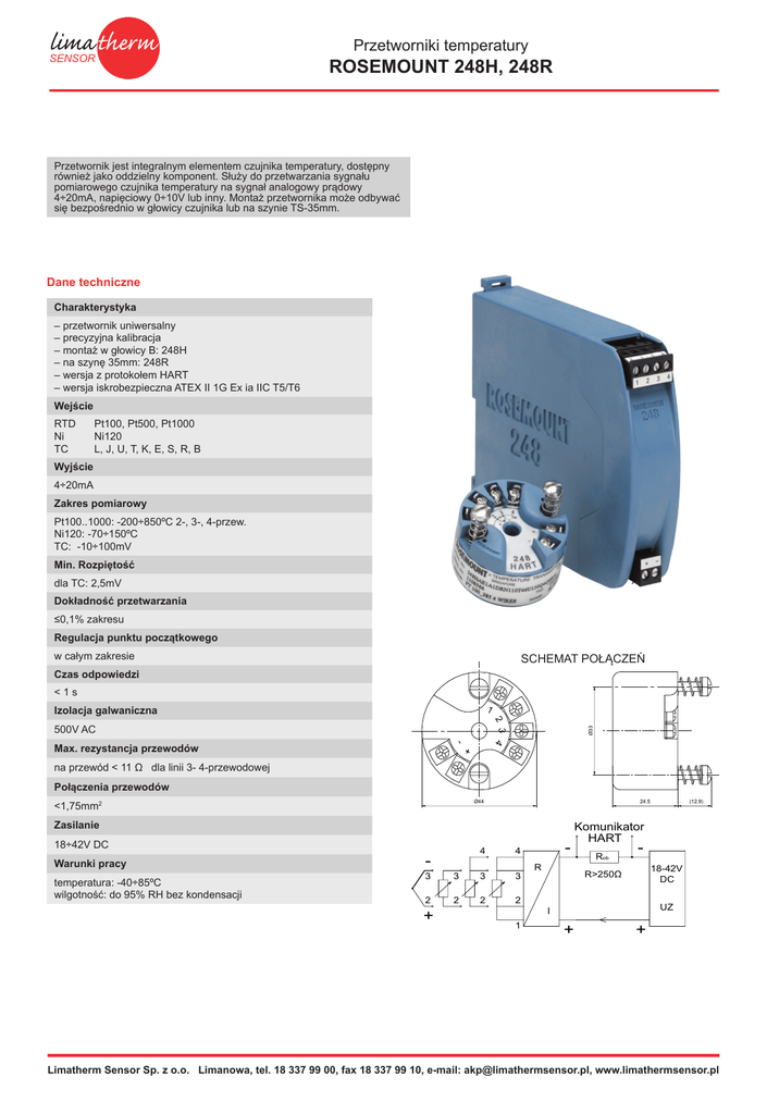 SENSOR Przetworniki temperatury ROSEMOUNT 248H, 248R Przetwornik jest integralnym elementem czujnika temperatury, dostępny również jako oddzielny komponent. Służy do przetwarzania sygnału pomiarowego czujnika temperatury na sygnał analogowy prądowy 4÷20mA, napięciowy 0÷10V lub inny. Montaż przetwornika może odbywać się bezpośrednio w głowicy czujnika lub na szynie TS-35mm. Dane techniczne Charakterystyka – przetwornik uniwersalny – precyzyjna kalibracja – montaż w głowicy B: 248H – na szynę 35mm: 248R – wersja z protokołem HART – wersja iskrobezpieczna ATEX II 1G Ex ia IIC T5/T6 Wejście RTD Ni TC Pt100, Pt500, Pt1000 Ni120 L, J, U, T, K, E, S, R, B Wyjście 4÷20mA Zakres pomiarowy Pt100..1000: -200÷850ºC 2-, 3-, 4-przew. Ni120: -70÷150ºC TC: -10÷100mV Min. Rozpiętość dla TC: 2,5mV Dokładność przetwarzania ≤0,1% zakresu Regulacja punktu początkowego w całym zakresie SCHEMAT POŁĄCZEŃ Czas odpowiedzi <1s 1 Izolacja galwaniczna - Max. rezystancja przewodów Ø33 2 3 4 500V AC na przewód < 11 Ω dla linii 3- 4-przewodowej Połączenia przewodów Ø44 <1,75mm2 24.5 Zasilanie 18÷42V DC Warunki pracy temperatura: -40÷85ºC wilgotność: do 95% RH bez kondensacji - 4 4 3 3 3 3 2 2 2 2 + 1 R (12.9) Komunikator HART Rob - 18-42V DC R>250Ω UZ I + + Limatherm Sensor Sp. z o.o. Limanowa, tel. 18 337 99 00, fax 18 337 99 10, e-mail: [email protected], www.limathermsensor.pl Przetworniki temperatury SENSOR ROSEMOUNT 248H, 248R Kod wyrobu Wersja 1 H wersja głowicowa R na szynę 35mm Zakres pomiarowy (0÷100)°C 2 (0÷100)°C inne parametry wg uzgodnień Typ wejścia 3 Pt100 Pt100 J J K K L L N N T T inne parametry wg uzgodnień Linia dla RTD 4 3 3 - przewodowy 4 4 - przewodowy Świadectwo kalibracji producenta 5 A brak C4 3 punktowa Q4 5 punktowa 2 1 248 bez oznaczeń – I-1 – Przykład zamówienia: 3 4 5 – Przetwornik Rosemount 248HA–I1–K–(0÷500)ºC Limatherm Sensor Sp. z o.o. Limanowa, tel. 18 337 99 00, fax 18 337 99 10, e-mail: [email protected], www.limathermsensor.pl