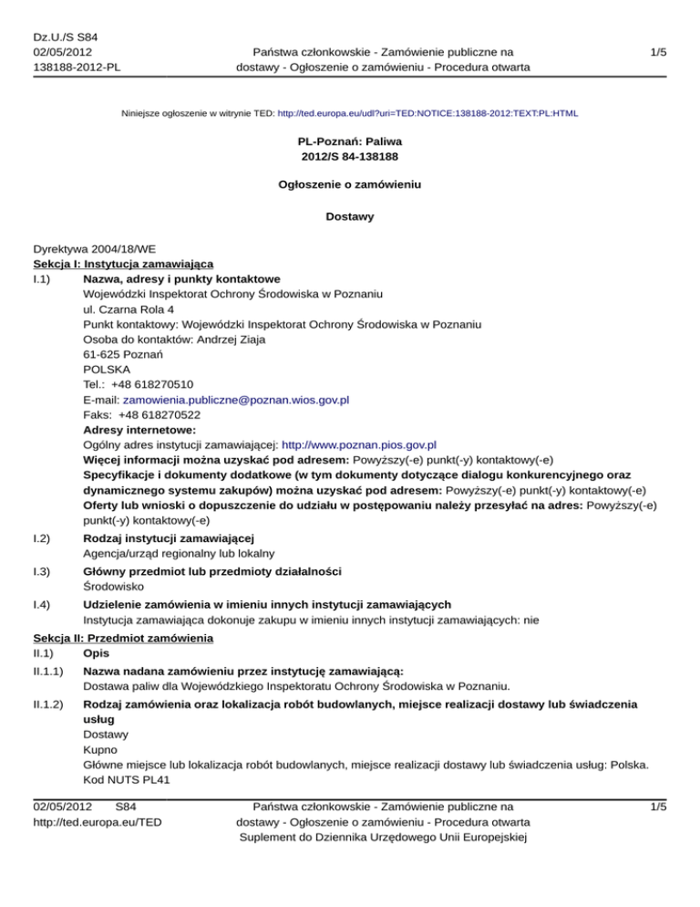 Dz.U./S S84 02/05/2012 138188-2012-PL Państwa członkowskie - Zamówienie publiczne na dostawy - Ogłoszenie o zamówieniu - Procedura otwarta 1/5 Niniejsze ogłoszenie w witrynie TED: http://ted.europa.eu/udl?uri=TED:NOTICE:138188-2012:TEXT:PL:HTML PL-Poznań: Paliwa 2012/S 84-138188 Ogłoszenie o zamówieniu Dostawy Dyrektywa 2004/18/WE Sekcja I: Instytucja zamawiająca I.1) Nazwa, adresy i punkty kontaktowe Wojewódzki Inspektorat Ochrony Środowiska w Poznaniu ul. Czarna Rola 4 Punkt kontaktowy: Wojewódzki Inspektorat Ochrony Środowiska w Poznaniu Osoba do kontaktów: Andrzej Ziaja 61-625 Poznań POLSKA Tel.: +48 618270510 E-mail: [email protected] Faks: +48 618270522 Adresy internetowe: Ogólny adres instytucji zamawiającej: http://www.poznan.pios.gov.pl Więcej informacji można uzyskać pod adresem: Powyższy(-e) punkt(-y) kontaktowy(-e) Specyfikacje i dokumenty dodatkowe (w tym dokumenty dotyczące dialogu konkurencyjnego oraz dynamicznego systemu zakupów) można uzyskać pod adresem: Powyższy(-e) punkt(-y) kontaktowy(-e) Oferty lub wnioski o dopuszczenie do udziału w postępowaniu należy przesyłać na adres: Powyższy(-e) punkt(-y) kontaktowy(-e) I.2) Rodzaj instytucji zamawiającej Agencja/urząd regionalny lub lokalny I.3) Główny przedmiot lub przedmioty działalności Środowisko I.4) Udzielenie zamówienia w imieniu innych instytucji zamawiających Instytucja zamawiająca dokonuje zakupu w imieniu innych instytucji zamawiających: nie Sekcja II: Przedmiot zamówienia II.1) Opis II.1.1) Nazwa nadana zamówieniu przez instytucję zamawiającą: Dostawa paliw dla Wojewódzkiego Inspektoratu Ochrony Środowiska w Poznaniu. II.1.2) Rodzaj zamówienia oraz lokalizacja robót budowlanych, miejsce realizacji dostawy lub świadczenia usług Dostawy Kupno Główne miejsce lub lokalizacja robót budowlanych, miejsce realizacji dostawy lub świadczenia usług: Polska. Kod NUTS PL41 02/05/2012 S84 http://ted.europa.eu/TED Państwa członkowskie - Zamówienie publiczne na dostawy - Ogłoszenie o zamówieniu - Procedura otwarta Suplement do Dziennika Urzędowego Unii Europejskiej 1/5 Dz.U./S S84 02/05/2012 138188-2012-PL Państwa członkowskie - Zamówienie publiczne na dostawy - Ogłoszenie o zamówieniu - Procedura otwarta II.1.3) Informacje na temat zamówienia publicznego, umowy ramowej lub dynamicznego systemu zakupów (DSZ) Ogłoszenie dotyczy zamówienia publicznego II.1.4) Informacje na temat umowy ramowej II.1.5) Krótki opis zamówienia lub zakupu Dostawa paliw: — Etylina bezołowiowa 95 – 80 000 litrów, — Olej napędowy – 120 000 litrów, — 51 kart zakupu paliwa. Integralną częścią opisu przedmiotu zamówienia jest Załącznik nr 4 - Specyfikacja techniczna. II.1.6) Wspólny Słownik Zamówień (CPV) 09100000 II.1.7) Informacje na temat Porozumienia w sprawie zamówień rządowych (GPA) Zamówienie jest objęte Porozumieniem w sprawie zamówień rządowych (GPA): nie II.1.8) Części To zamówienie podzielone jest na części: nie II.1.9) Informacje o ofertach wariantowych Dopuszcza się składanie ofert wariantowych: nie II.2) Wielkość lub zakres zamówienia II.2.1) Całkowita wielkość lub zakres: Dostawa paliw: — Etylina bezołowiowa 95 – 80 000 litrów, — Olej napędowy – 120 000 litrów, — 51 kart zakupu paliwa. Szacunkowa wartość bez VAT: 242 713,15 EUR II.2.2) Informacje o opcjach Opcje: nie II.2.3) Informacje o wznowieniach Jest to zamówienie podlegające wznowieniu: nie II.3) Czas trwania zamówienia lub termin realizacji Okres w miesiącach: 48 (od udzielenia zamówienia) 2/5 Sekcja III: Informacje o charakterze prawnym, ekonomicznym, finansowym i technicznym III.1) Warunki dotyczące zamówienia III.1.1) Wymagane wadia i gwarancje: 1. Zamawiający wymaga wniesienia wadium w wysokości 5 000,00 PLN. 2. Wadium należy wpłacić na konto: 93 1010 1469 0021 9213 9800 0000 NBP O/Poznań. 3. Zamawiający uzna, że wadium zostało wniesione jeżeli przed terminem otwarcia ofert wadium wpłynie na konto Zamawiającego. 4. Wadium może być wnoszone w jednej lub kilku następujących formach: a) pieniądzu, b) poręczeniach bankowych lub poręczeniach spółdzielczej kasy oszczędnościowo-kredytowej, z tym że poręczenie kasy jest zawsze poręczeniem pieniężnym, c) gwarancjach bankowych, 02/05/2012 S84 http://ted.europa.eu/TED Państwa członkowskie - Zamówienie publiczne na dostawy - Ogłoszenie o zamówieniu - Procedura otwarta Suplement do Dziennika Urzędowego Unii Europejskiej 2/5 Dz.U./S S84 02/05/2012 138188-2012-PL Państwa członkowskie - Zamówienie publiczne na dostawy - Ogłoszenie o zamówieniu - Procedura otwarta 3/5 d) gwarancjach ubezpieczeniowych, e) poręczeniach udzielanych przez podmioty o których mowa w art. 6b ust. 5 pkt. 2 ustawy z dnia 9.11.2000 r. o utworzeniu Polskiej Agencji Rozwoju Przedsiębiorczości (Dz.U. Nr 109, poz 1158 z późn. zm.), f) w treści wadium składanego w formie innej niż pieniądz muszą być wyszczególnione okoliczności w jakich Zamawiający może je zatrzymać. Okoliczności te muszą zawierać sytuacje określone: — W art. 46 ust 4a Prawa zamówień publicznych, tj. jeżeli Wykonawca w odpowiedzi na wezwanie, o którym mowa w art. 26 ust. 3 nie złożył dokumentów lub oświadczeń, o których mowa w art. 25 ust 1 lub pełnomocnictw, — Odmówił podpisania umowy w sprawie zamówienia publicznego na warunkach określonych w ofercie, — Nie wniósł wymaganego zabezpieczenia należytego wykonania umowy, — Zawarcie umowy w sprawie zamówienia publicznego stało się niemożliwe z przyczyn leżących po stronie Wykonawcy. Poza tym z powyższego dokumentu powinno wynikać jednoznacznie, gwarantowanie wypłaty należności w sposób nieodwołalny, bezwarunkowy i na pierwsze żądanie. Wadium takie powinno obejmować cały okres związania ofertą, poczynając od daty składania ofert. III.1.2) Główne warunki finansowe i uzgodnienia płatnicze i/lub odniesienie do odpowied