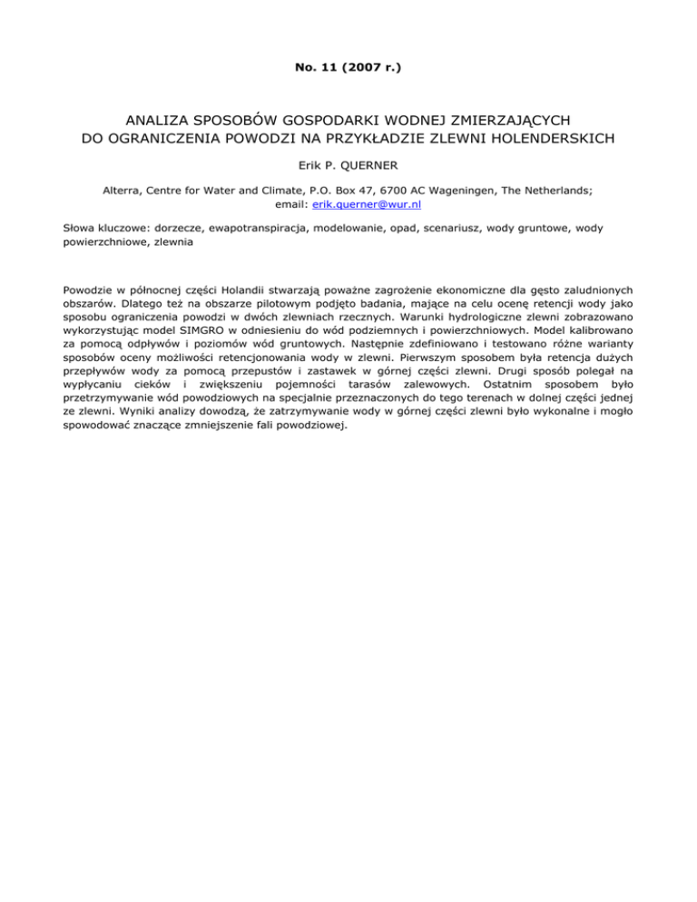 No. 11 (2007 r.) ANALIZA SPOSOBÓW GOSPODARKI WODNEJ ZMIERZAJĄCYCH DO OGRANICZENIA POWODZI NA PRZYKŁADZIE ZLEWNI HOLENDERSKICH Erik P. QUERNER Alterra, Centre for Water and Climate, P.O. Box 47, 6700 AC Wageningen, The Netherlands; email: [email protected] Słowa kluczowe: dorzecze, ewapotranspiracja, modelowanie, opad, scenariusz, wody gruntowe, wody powierzchniowe, zlewnia Powodzie w północnej części Holandii stwarzają poważne zagrożenie ekonomiczne dla gęsto zaludnionych obszarów. Dlatego też na obszarze pilotowym podjęto badania, mające na celu ocenę retencji wody jako sposobu ograniczenia powodzi w dwóch zlewniach rzecznych. Warunki hydrologiczne zlewni zobrazowano wykorzystując model SIMGRO w odniesieniu do wód podziemnych i powierzchniowych. Model kalibrowano za pomocą odpływów i poziomów wód gruntowych. Następnie zdefiniowano i testowano różne warianty sposobów oceny możliwości retencjonowania wody w zlewni. Pierwszym sposobem była retencja dużych przepływów wody za pomocą przepustów i zastawek w górnej części zlewni. Drugi sposób polegał na wypłycaniu cieków i zwiększeniu pojemności tarasów zalewowych. Ostatnim sposobem było przetrzymywanie wód powodziowych na specjalnie przeznaczonych do tego terenach w dolnej części jednej ze zlewni. Wyniki analizy dowodzą, że zatrzymywanie wody w górnej części zlewni było wykonalne i mogło spowodować znaczące zmniejszenie fali powodziowej.