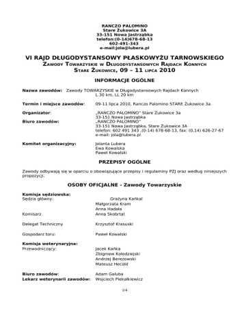RANCZO PALOMINO Stare Żukowice 3A 33-151 Nowa Jastrząbka telefon:(0-14)678-68-13 602-491-343 e-mail:[email protected] VI RAJD DŁUGODYSTANSOWY PŁASKOWYŻU TARNOWSKIEGO ZAWODY TOWARZYSKIE W DŁUGODYSTANSOWYCH RAJDACH KONNYCH STARE ŻUKOWICE, 09 – 11 LIPCA 2010 INFORMACJE OGÓLNE Nazwa zawodów: Zawody TOWARZYSKIE w Długodystansowych Rajdach Konnych L 30 km, LL 20 km Termin i miejsce zawodów: 09-11 lipca 2010, Ranczo Palomino STARE Żukowice 3a Organizator: „RANCZO PALOMINO” Stare Żukowice 3a 33-151 Nowa Jastrząbka „RANCZO PALOMINO” 33-151 Nowa Jastrząbka, Stare Żukowice 3A telefon: 602 491 343 ,(0-14) 678-68-13, fax: (0,14) 626-27-67 e-mail: [email protected] Biuro zawodów: Komitet organizacyjny: Jolanta Lubera Ewa Kowalska Paweł Kowalski PRZEPISY OGÓLNE Zawody odbywają się w oparciu o obowiązujące przepisy i regulaminy PZJ oraz według niniejszych propozycji. OSOBY OFICJALNE - Zawody Towarzyskie Komisja sędziowska: Sędzia główny: Komisarz Grażyna Kańkal Małgorzata Kram Anna Hadała Anna Skobrtal Delegat Techniczny Krzysztof Krasuski Gospodarz toru: Paweł Kowalski Komisja weterynaryjna: Przewodniczący: Biuro zawodów: Lekarz weterynarii zawodów: Jacek Kańka Zbigniew Kołodziejski Andrzej Berezowski Mateusz Hecold Adam Galuba Wojciech Piekałkiewicz 1/4 Zabezpieczenie medyczne zawodów i lekarz dla zawodników: lek. med. Norbert Januszek Kowal: Wacław Gilarski PROGRAM ZAWODÓW Piątek 09.07.2010 18.00-20.00 Długodystansowe rajdy konne – szkolenie weterynaryjne Sobota 10.07.2010 18.00-20.00 Długodystansowe rajdy konne - Maciej Kacprzyk, Beata Dzikowska , Małgorzata Kram Dla koni i jeźdźców startujących tylko 11.07.2010 Godzina 17.00 – przegląd weterynaryjny Godzina 19.00 – odprawa techniczna Niedziela 11.07.2010 Konkurs nr 5 godz.: 8:00 Konkurs kl. L - dystans 30 km -na normę czasu Bramka weterynaryjna w połowie dystansu (lotna) i na mecie po 30 km. Klasyfikacja indywidualna. Zasady rozgrywania konkursu zgodnie z regulaminem obowiązującym w dniu zawodów. Konkurs nr 6 godz.; 8:30 Konkurs kl. LL – dystans 20 km - na normę czasu Bramka weterynaryjna (lotna) w połowie dystansu i na mecie po 20 km. Klasyfikacja indywidualna. Zasady rozgrywania konkursu zgodnie z regulaminem obowiązującym w dniu zawodów. Godziny rozpoczęcia konkursów mogą zostać zmienione na odprawie technicznej. Zakończenie zawodów - niedziela 11.07.2010 godz. 14:00 INFORMACJA O TRASIE Opis trasy: zawody rozgrywane będą na terenach Płaskowyżu Tarnowskiego. Start i meta: Ranczo Palomino. Trasa przebiega terenem nizinnym, częściowo zalesionym: podłoże - drogi leśne i polne, piaszczyste, miejscami bite, występują krótkie odcinki dróg utwardzonych, również odcinki asfaltu. Różnica wzniesień: 5-30 metrów. Pętle o długości 30 km i 20 km ŚWIADCZENIA: Zakwaterowanie: Pokoje 2-4osobowe z pełnym węzłem sanitarnym 50-80zł/doba. Wyżywienie: Catering na terenie Ranczo Palomino . Noclegi proszę rezerwować indywidualnie – polecamy Pensjonat Jaś i Małgosia tel 014 678 68 24 Roleski Ranch tel 602 753 148 WRTC Furioso tel 014 678 68 15 Stajnie: Boks – 50 zł/doba , Stajnie otwarte będą od dnia 08.07. 2010 od godz. 8:00. 2/4 Istnieje możliwość wcześniejszego przyjazdu z koniem - do ustalenia z organizatorem. Organizator zapewnia odpłatnie słomę i siano . ZGŁOSZENIA Zgłoszenia przyjmuje Biuro Zawodów: Stare Żukowice 3A, telefon: 602 491 343, (0-14) 678-68-13, fax: (0-14) 626-27-67 Zgłoszenia muszą zawierać dane zawodnika z dokładną datą urodzenia; dane konia (data urodzenia, pochodzenie: ojciec, matka, dane hodowcy, dane właściciela konia); konkurs, w którym ma startować. Rezerwacja boksów i stanowisk nastąpi po przesłaniu dowodu wpłaty. Numer konta: PALOMINO JOLANTA LUBERA 33-151 NOWA JASTRZĄBKA STARE ŻUKOWICE 3A BANK MILLENIUM S.A. 46 1160 2202 0000 0001 0649 8313 z dopiskiem "Towarzyski Rajd długodystansowy". Telefony kontaktowe: 602 491 343, (0-14) 678-68-13, . Zgłoszenia ostateczne: 02.07.2010 Opłata organizacyjna: konkursy: kl. L, LL-100 zł WARUNKI TECHNICZNE Obowiązująca dokumentacja dla zawodników : • aktualne zaświadczenie lekarskie dopuszczające do startu w zawodach; • aktualne ubezpieczenie zawodnika biorącego udział w zawodach; • dla osób niepełnoletnich zgoda rodziców na udział w zawodach. Obowiązująca dokumentacja dla konia : • paszport konia PZHK z wpisaną informacją o szczepieniach przeciw grypie (baza i kontynuacja) zgodnie z obowiązującym schematem szczepień. W przypadku braku dokumentacji jeźdźca lub konia para ta może zostać niedopuszczona do zawodów. W czasie rajdu i treningów przed zawodami zawodnika obowiązuje twarde nakrycie głowy. Sprawy weterynaryjne Lp Funkcja 1. Powiatowy lekarz wet. 2. Lekarz wet. zawodów Imię i nazwisko Jan Grudnik Telefon 696 065 102 Wojciech Piekałkiewicz ???? Szczepienia ochronne przeciwko grypie koni. Obowiązuje następujący schemat szczepień: a. szczepienie podstawowe: pierwsze szczepienie – w dniu rozpoczęcia szczepień drugie szczepienie – nie wcześniej niż 21-go dnia i nie później niż 92 dnia od pierwszego szczepienia. b. szczepienie przypominające: co 6 miesięcy od ostatniego szczepienia (jest dopuszczalny 21 dniowy okres karencji); żadne szczepienie przypominające nie może się odbyć później niż na 7 dni przed przybyciem na zawody. INFORMACJE RÓŻNE 3/4 Organizator zapewnia flot's dla zwycięskich koni, a dla zawodników dyplomy i nagrody – upominki Organizator nie bierze odpowiedzialności za ewentualne wypadki, kradzieże i inne zdarzenia losowe wynikłe w czasie transportu i zawodów. Organizator zastrzega sobie prawo zmiany programu zawodów Protest: - wyłącznie na piśmie po wpłaceniu kaucji u Organizatora zawodów w wysokości 200 zł Wstęp do stajni: szefowie ekip, trenerzy, zawodnicy, luzacy, właściciele koni. Konie zgłoszone po terminie mogą nie zostać przyjęte. Podczas zawod